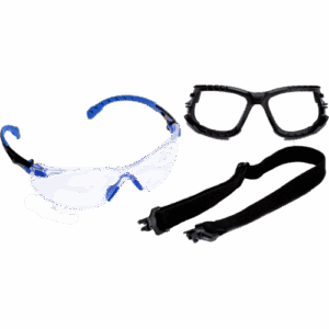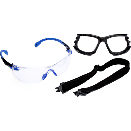 Modro-črna očala s prozornimi polikarbonatnimi lečami s površino proti zamegljevanju 3M Scotchgard, vložkom iz pene in trakom.