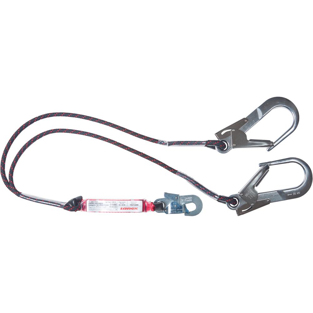 Lanex Double Shock absorber z dvema vrvema in karabinoma, odprtjem 60 mm. Amortizer se lahko uporablja za vzpon na okvirne konstrukcije, kovinske stolpe in lestve. Zahvaljujoč dvema vrvema je delavec zaščiten ves čas dela. EN 355 (CE 0082).
