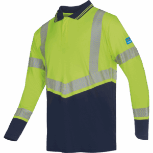 moška antistatična polo majica HI-VIS; negorljiva; dobro uravnava vlago in ima antibakterijske lastnosti; segmentne odsevne črte po telesu, rokavih in čez ramena, zapiranje s skritimi zatiči pod zavihkom.