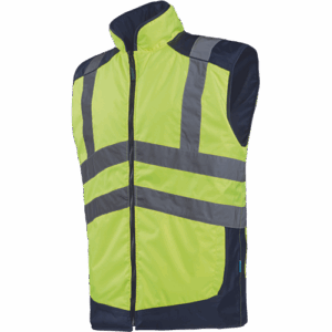 – sodoben, topel, udoben in vetru odporen reverzibilen telovnik HI-VIS – raven ovratnik – zapiranje na zadrgo – 2 notranja žepa – polna prešita podloga – 2 notranja žepa