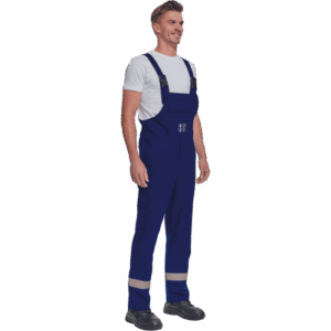 – večplastne hlače z naprsnikom in elastičnim pasom – 1 velik prsni žep z zavihkom – 2 stranska žepa – 1 žep na stegnu z zavihkom na desni nogi – odsevne črte nad gležnjem