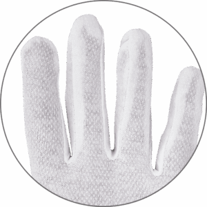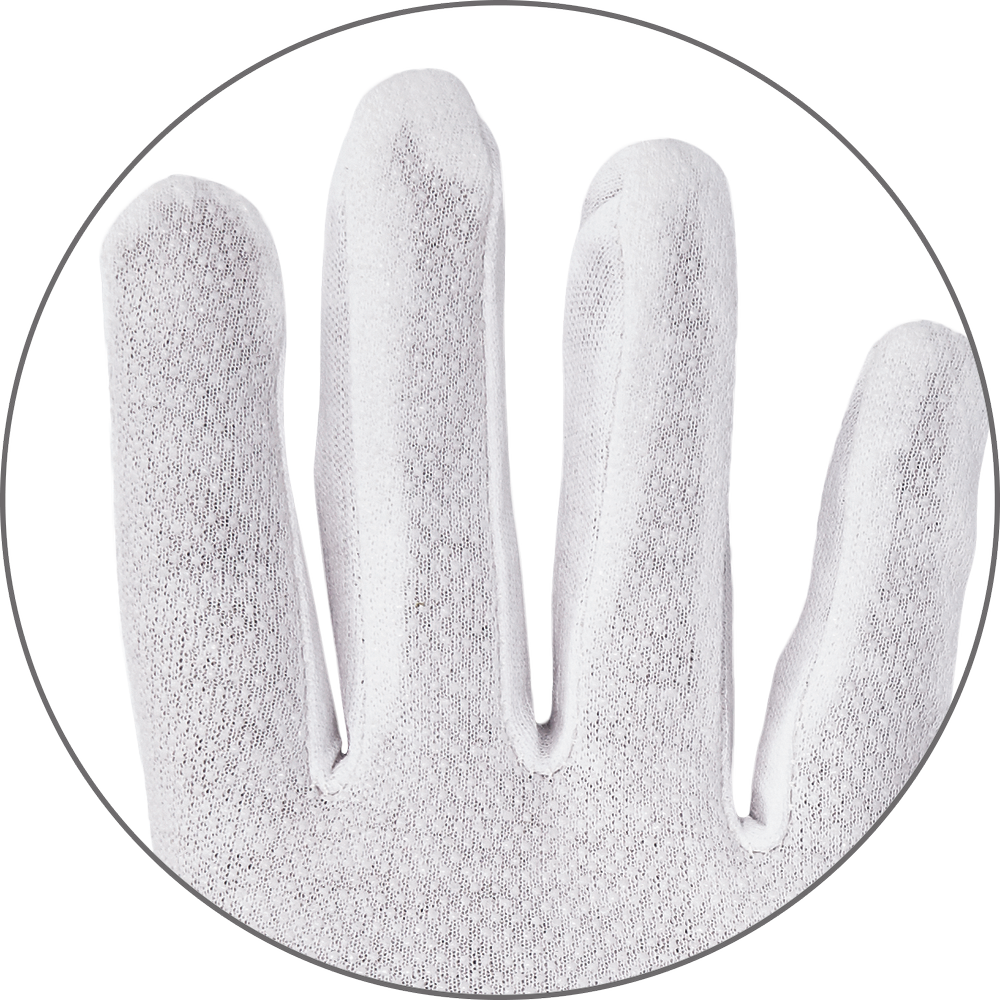 – šivane rokavice iz bombažne pletenine – s PVC pikami na dlaneh in prstih – klin na zgornjem delu zapestja – brez manšete