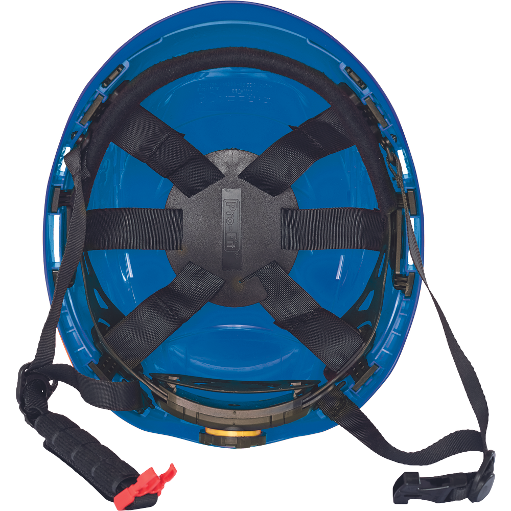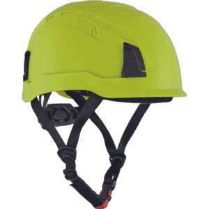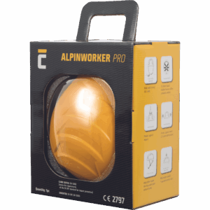 Industrijska čelada CERVA ALPINWORKER PRO. Čelada ima vgrajen potni trak in režo za zaščito sluha. Križ na glavi s 6 točkami. Velikost čelade je od 53 do 66 cm, velikost lahko prilagodite z vrtljivim kolescem. Zaščita pred staljeno kovino in bočnimi deformacijami. Temperatura od -30 °C do +50 °C. EN 397, EN 50365 (razred 0).