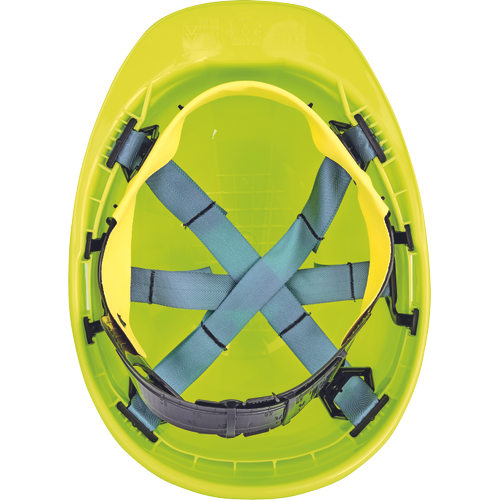 zelo lahka zaščitna čelada iz polietilena z ličnicami, primerna za električarje, s podaljškom nad vratom; obešena na šestih točkah na tekstilnih trakovih; električna izolacija 1000 V; zamenljivi pasovi; vgrajen potni trak