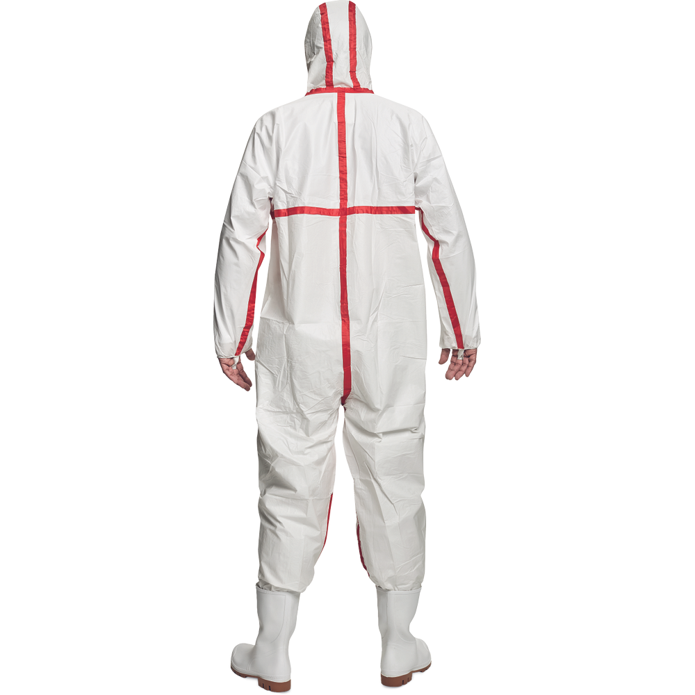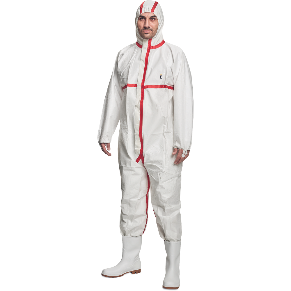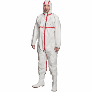 – zaščitni antistatični kombinezon za enkratno uporabo s kapuco tudi z zaščito pred nevarnimi mikroorganizmi – mikroporozni paroprepustni sloj, zatesnjeni šivi, samolepilna zadrga ter elastična zapestja in noge – za zaščitna oblačila pred tekočimi kemikalijami spada v kategorijo CE III – za zaščitna oblačila pred tekočimi aerosoli v kategorijo tipa 4B – za zaščitna oblačila pred trdnimi delci in aerosoli v kategorijo tipa 5B – za zaščitna oblačila pred omejenim brizganjem v kategorijo tipa 6B – za zaščitna oblačila pred delci radioaktivnega onesnaženja spada v razred 2