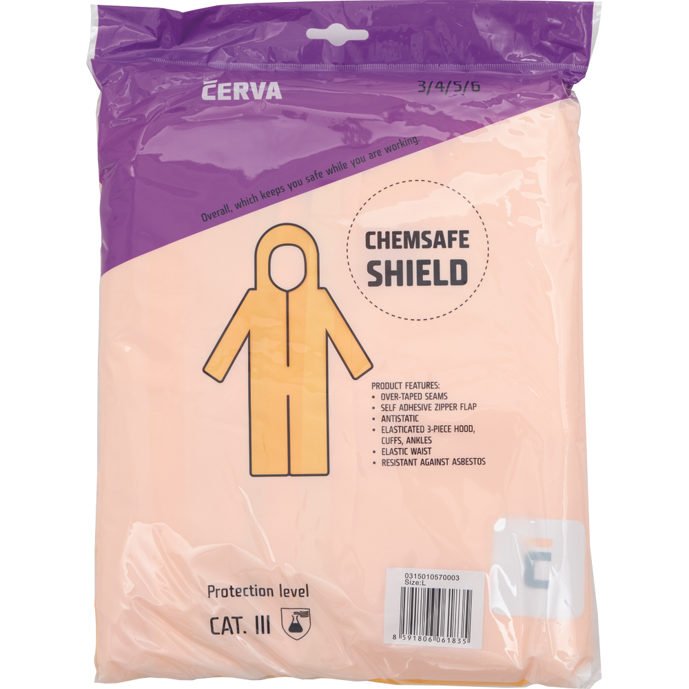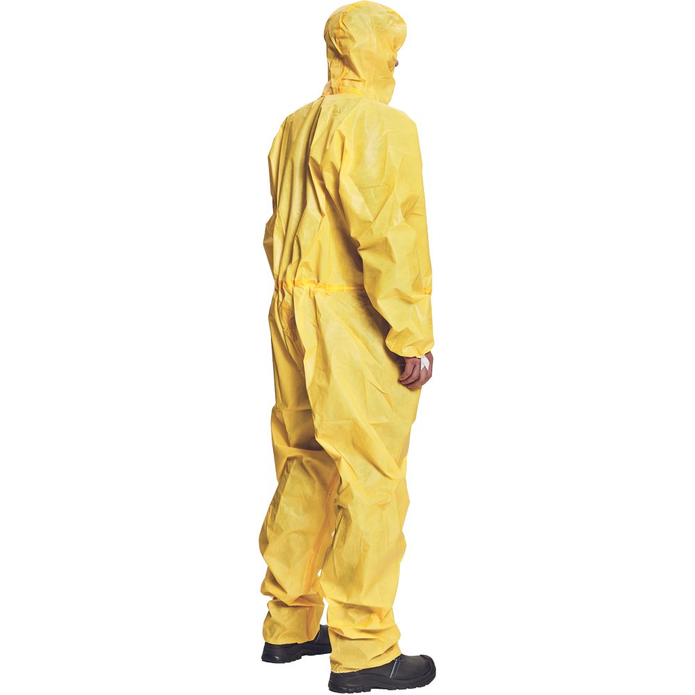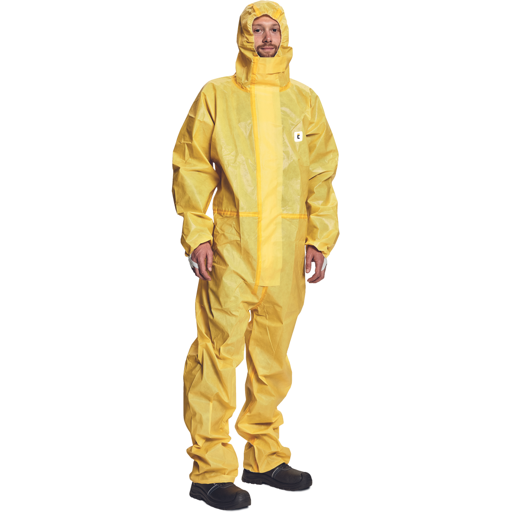 – zaščitni antistatični kombinezon za enkratno uporabo s kapuco, ki ščiti tudi pred nevarnimi mikroorganizmi – nepropusten zaščitni sloj, izdelan iz 100 % polipropilena + polietilenska prevleka – zatesnjeni šivi, samolepilna zadrga ter elastična zapestja in noge – zanke za palec v manšeti, ki zagotavljajo popolno prileganje rokavov – za zaščitno obleko pred tekočimi kemikalijami spada v kategorijo CE III – za zaščitno obleko pred tekočimi aerosoli v kategorijo tipa 4B – za zaščitno obleko pred trdnimi delci in aerosoli v kategorijo tipa 5B – za zaščitno obleko pred omejenim škropljenjem v kategorijo tipa 6B – za zaščitno obleko pred radioaktivnim onesnaženjem z delci spada v razred 2