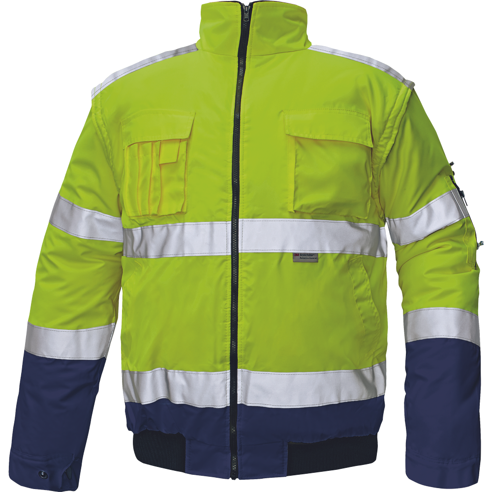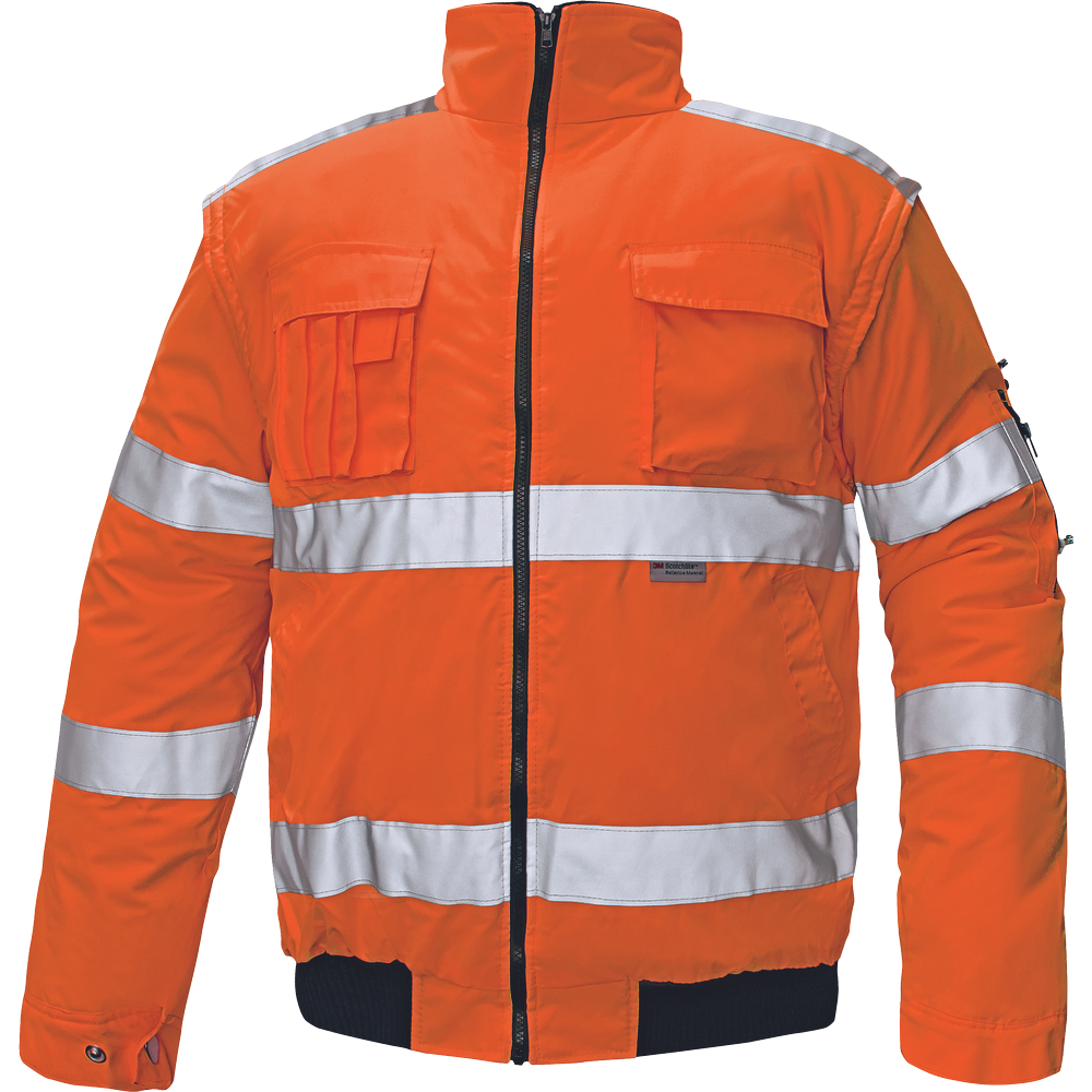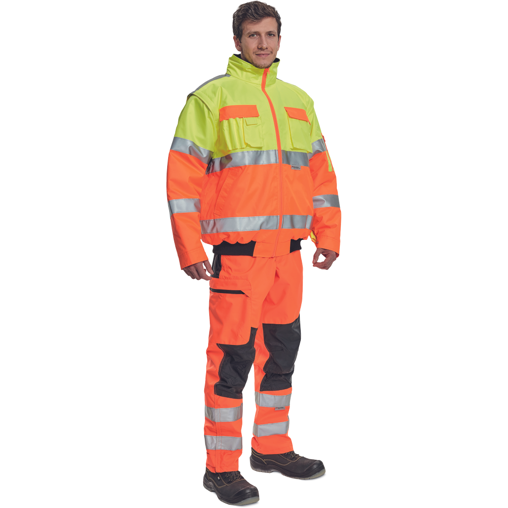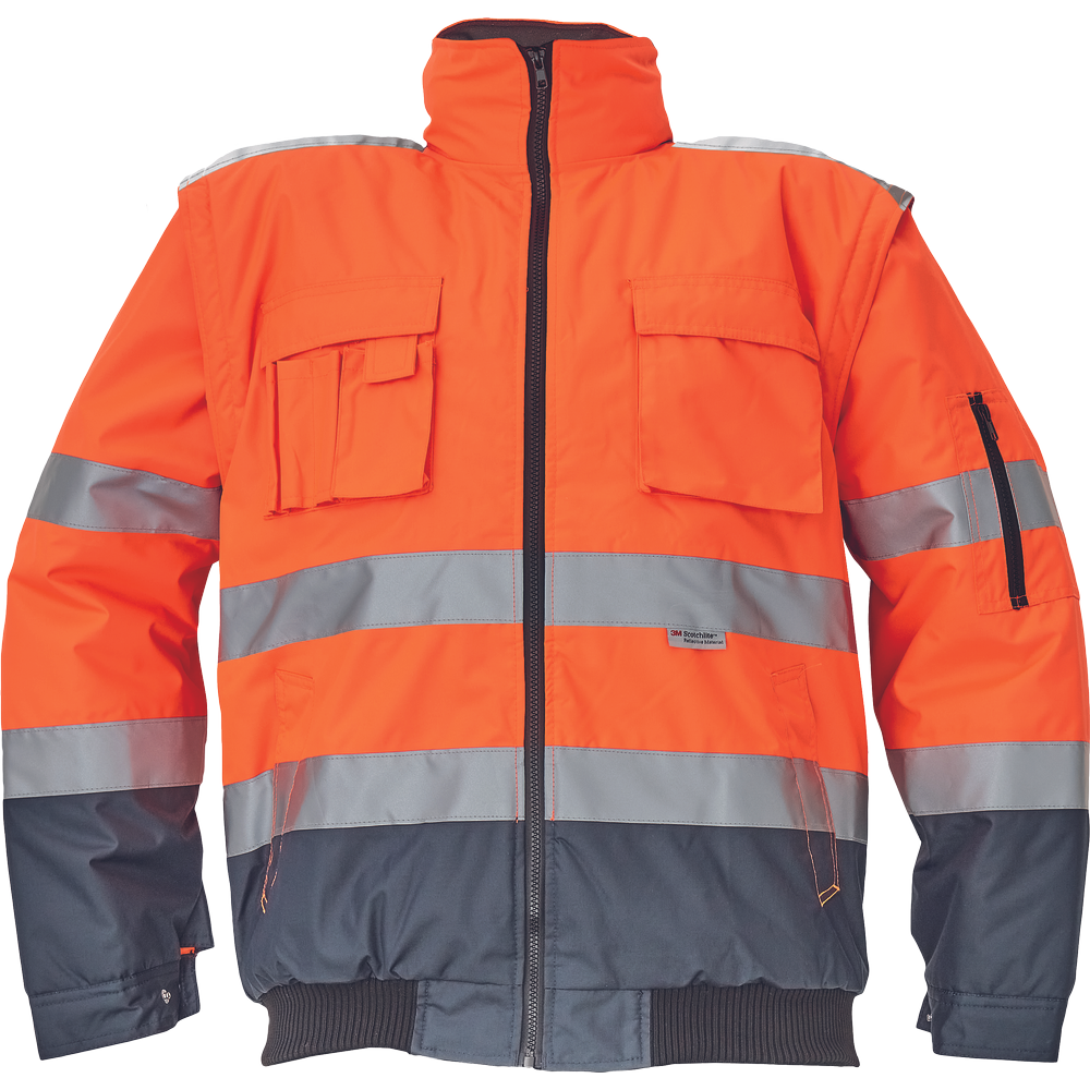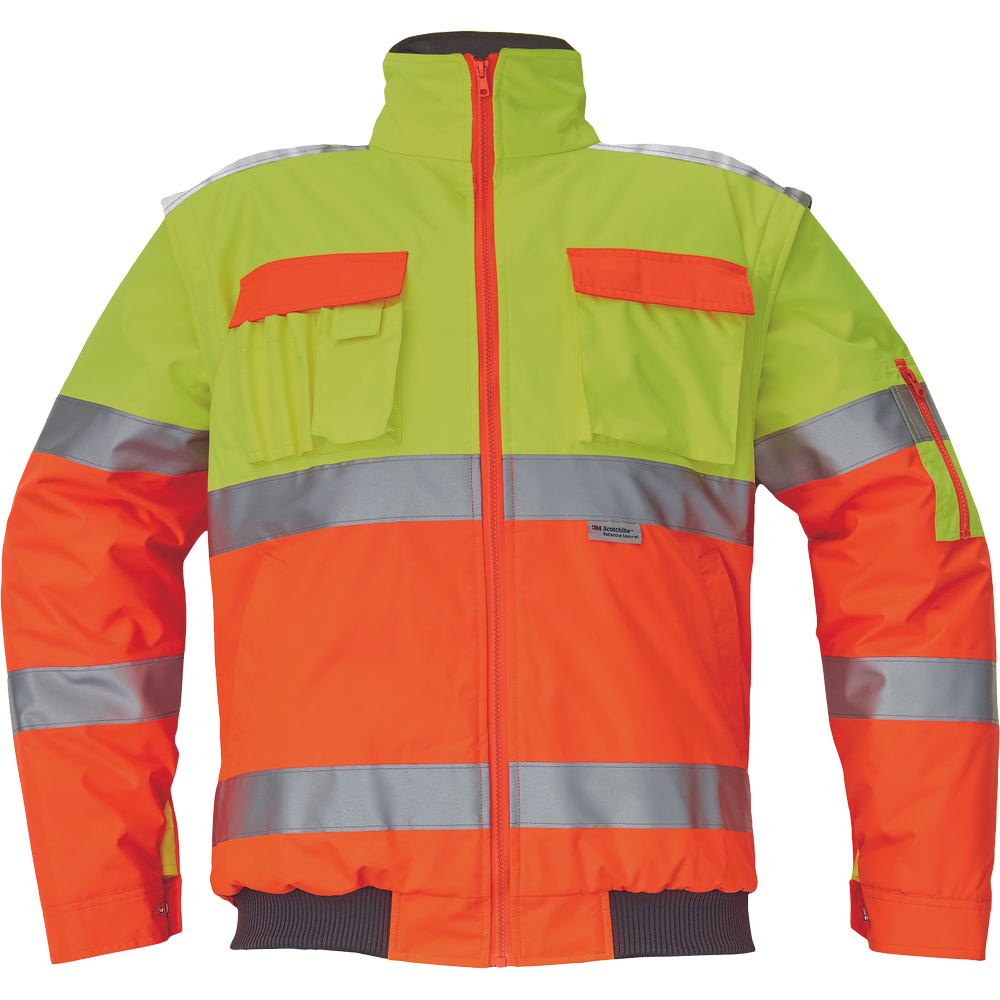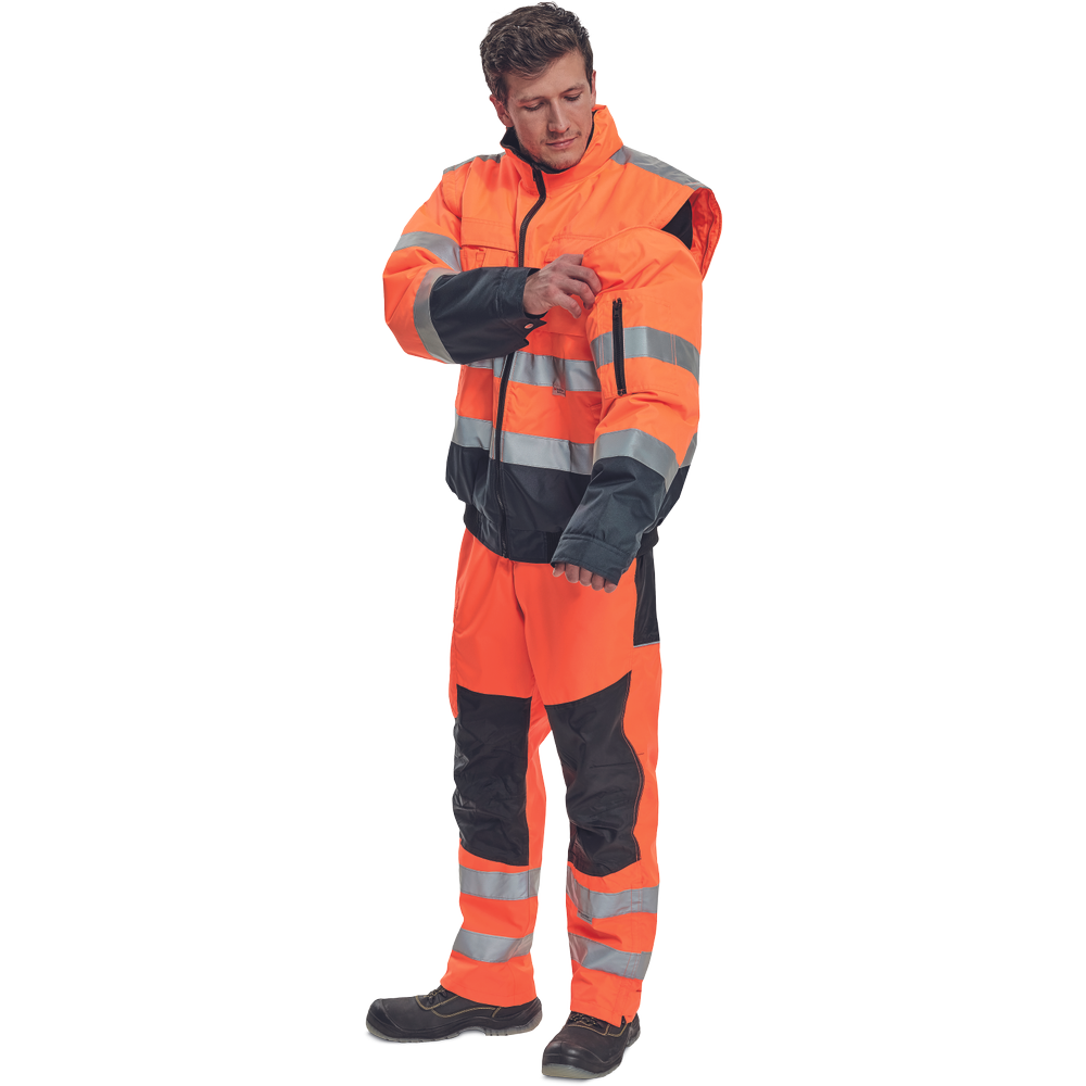 – moška HI-VIS in vodoodporna zimska jakna s snemljivimi rokavi – kapuca v ovratniku – zračna – zatesnjeni šivi – 3M odsevne črte okoli pasu in rokavov – 2 stranska žepa – 2 prsna žepa – 1 žep na levem rokavu – nastavitev spodnjega roba rokavov – elastičen rob pasu
