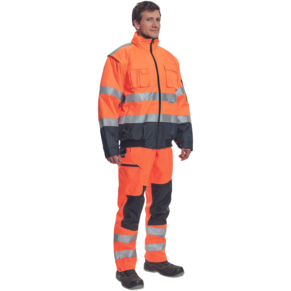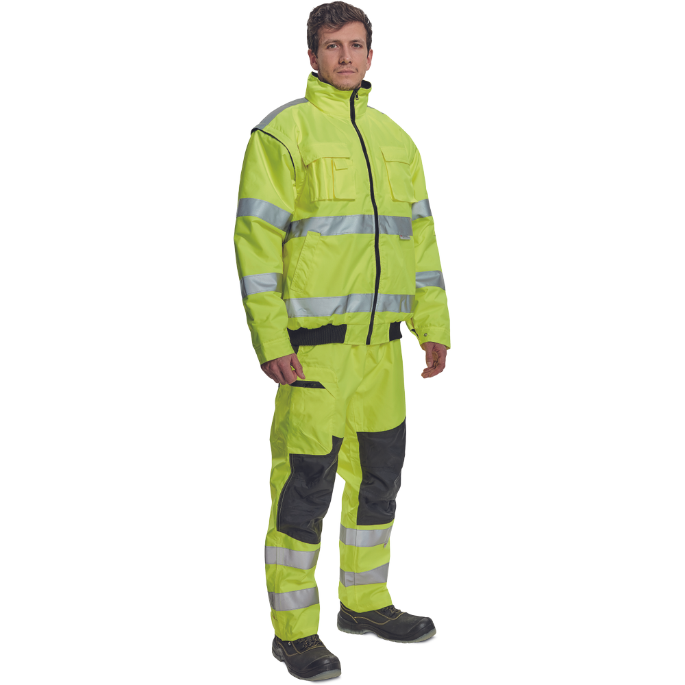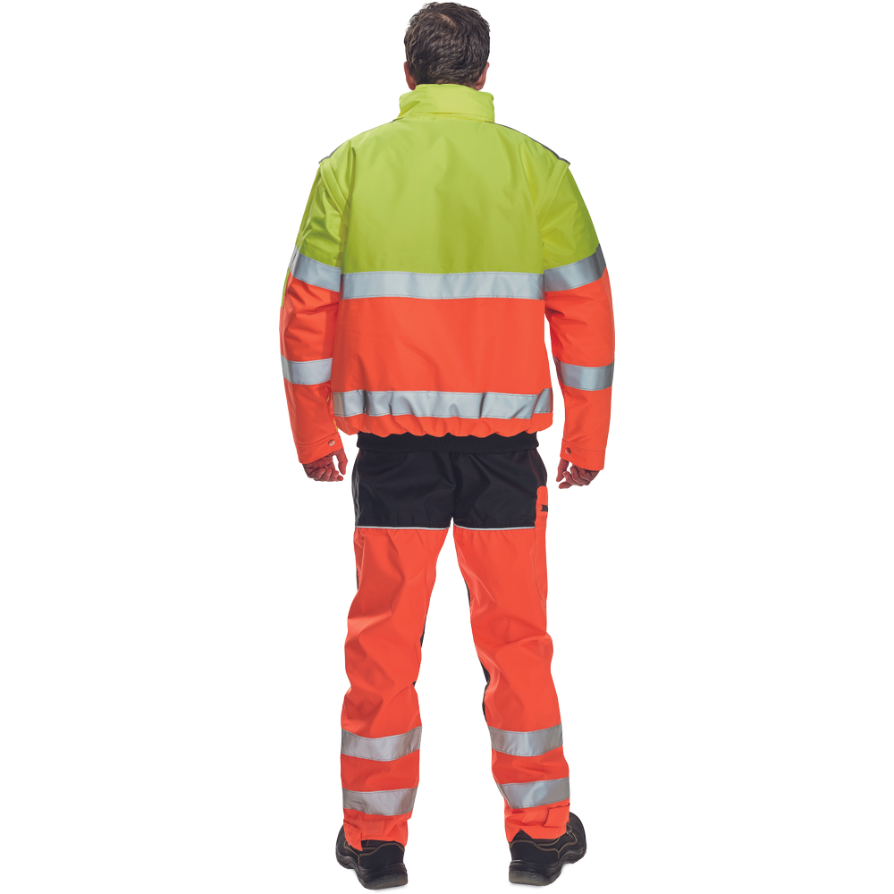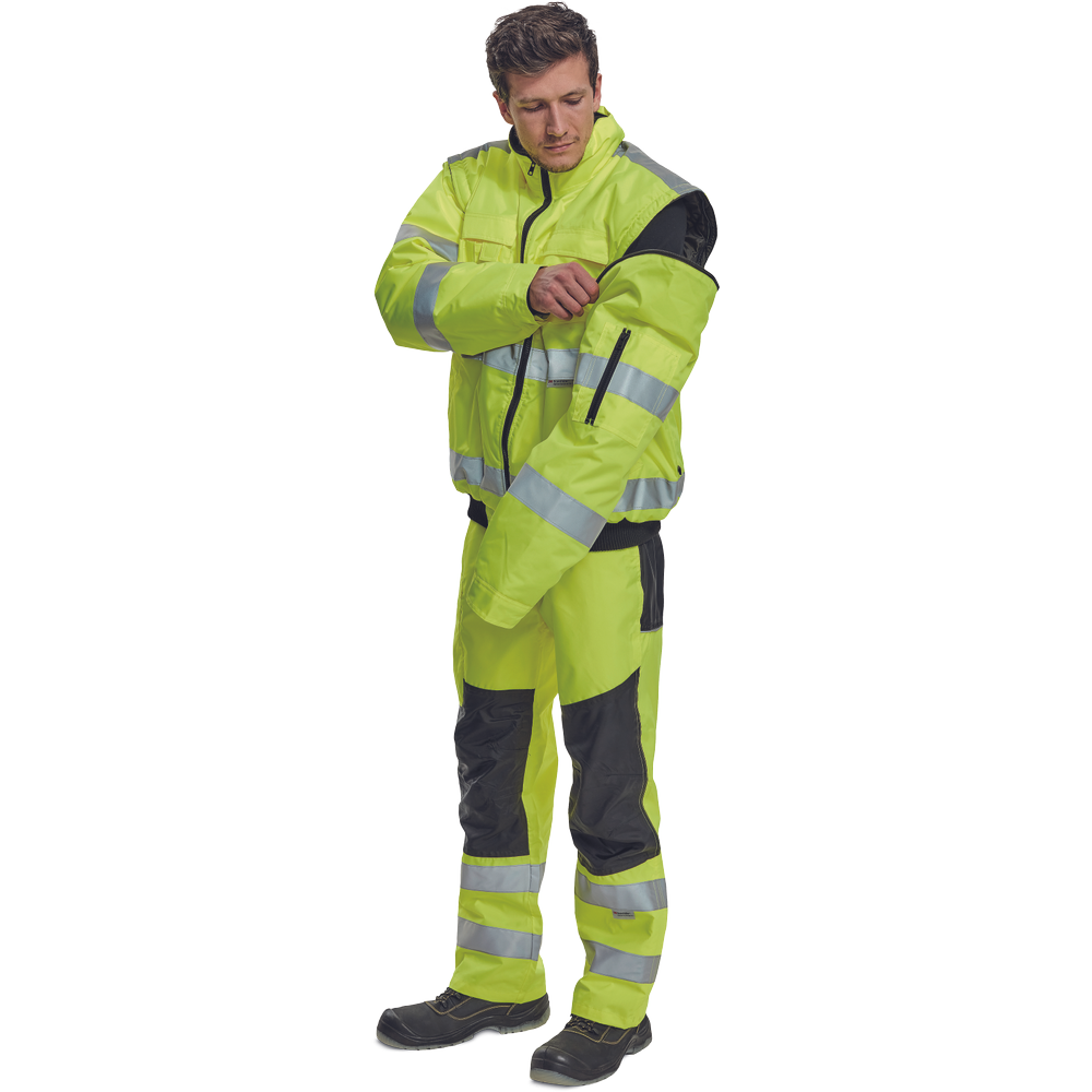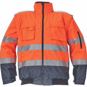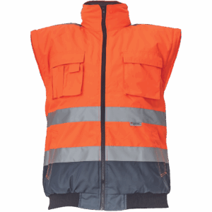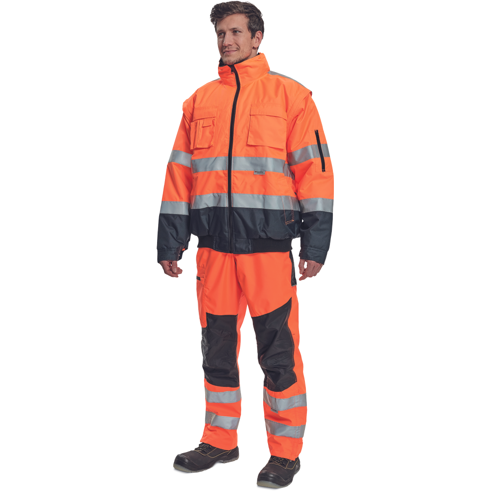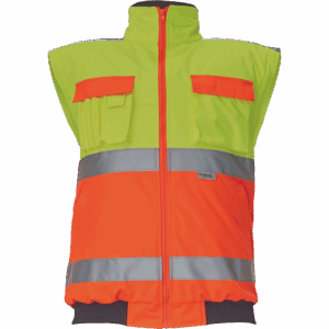– moška HI-VIS in vodoodporna zimska jakna s snemljivimi rokavi – kapuca v ovratniku – zračna – zatesnjeni šivi – 3M odsevne črte okoli pasu in rokavov – 2 stranska žepa – 2 prsna žepa – 1 žep na levem rokavu – nastavitev spodnjega roba rokavov – elastičen rob pasu