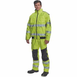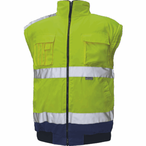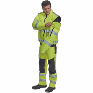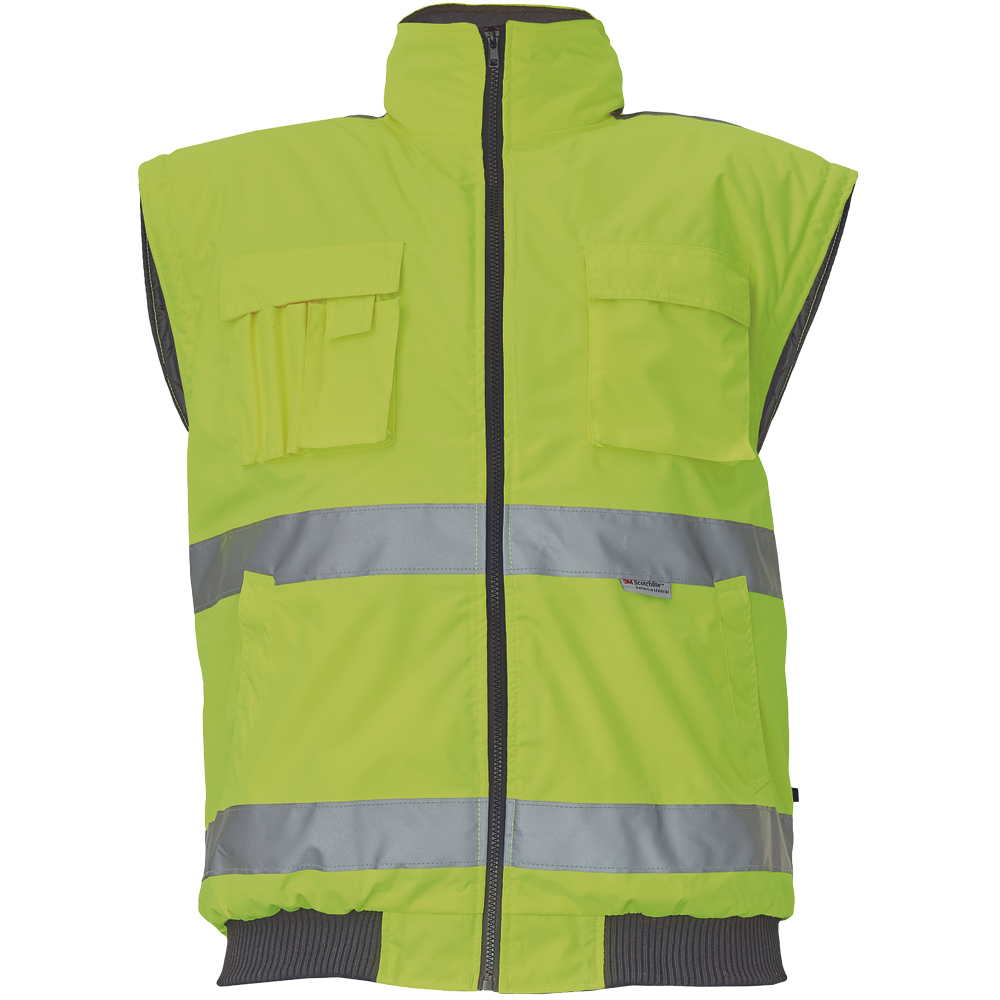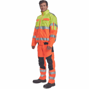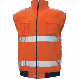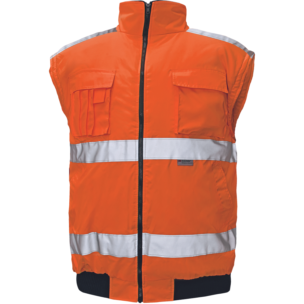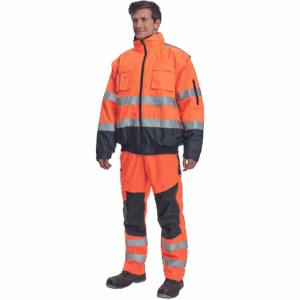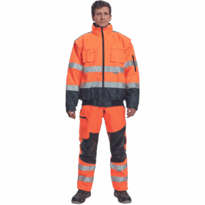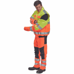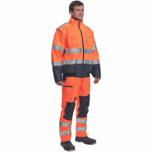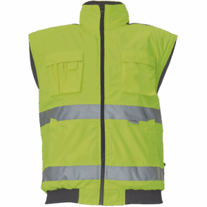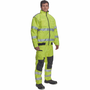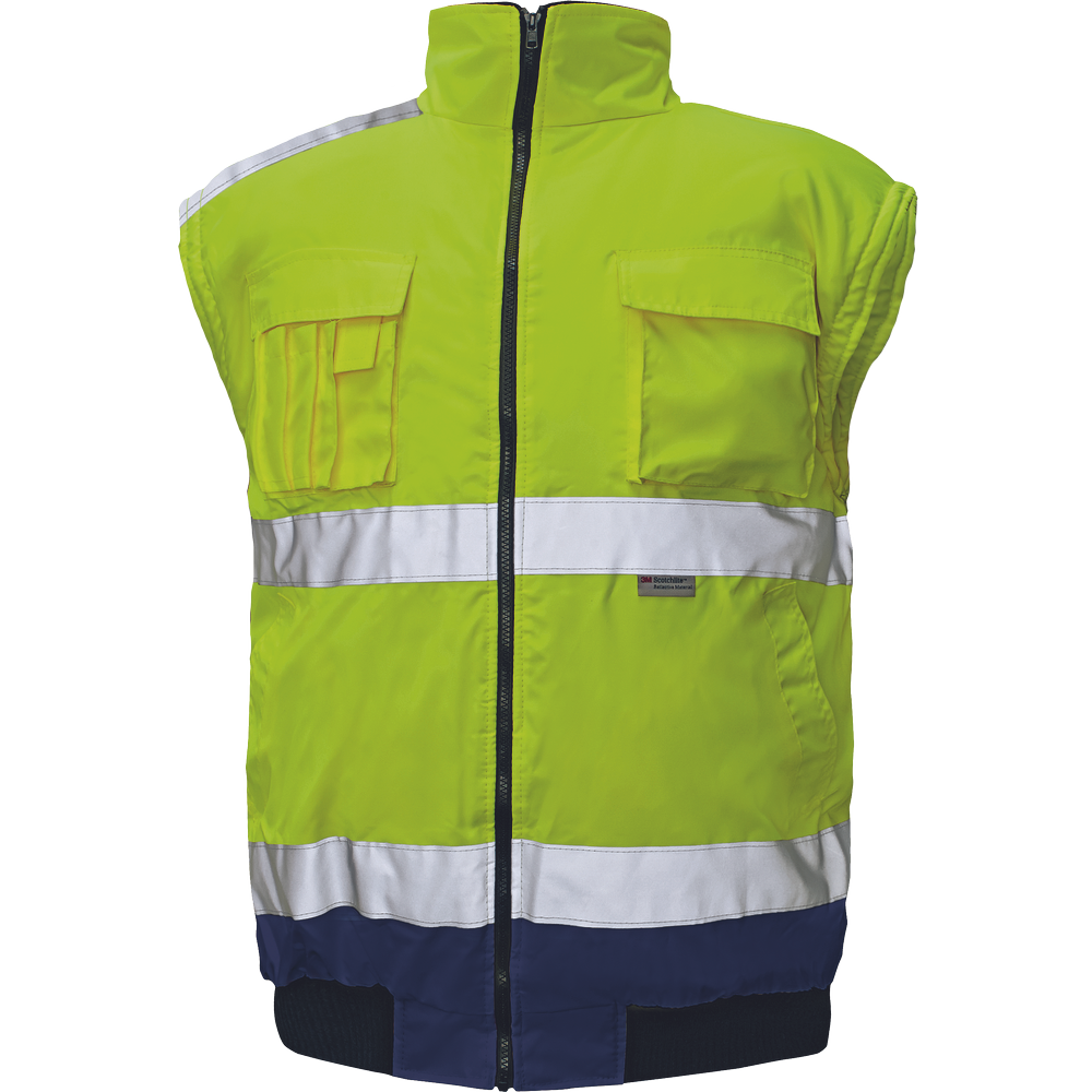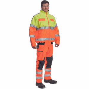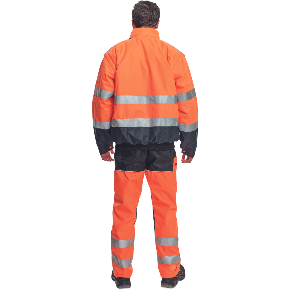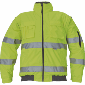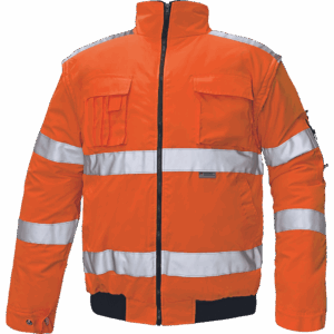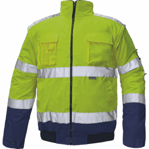 – moška HI-VIS in vodoodporna zimska jakna s snemljivimi rokavi – kapuca v ovratniku – zračna – zatesnjeni šivi – 3M odsevne črte okoli pasu in rokavov – 2 stranska žepa – 2 prsna žepa – 1 žep na levem rokavu – nastavitev spodnjega roba rokavov – elastičen rob pasu