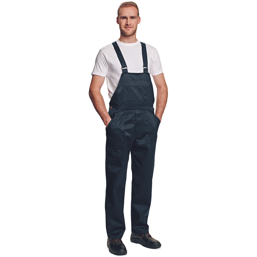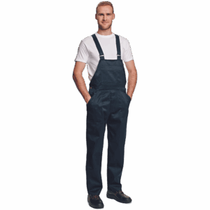 – moške hlače z naprsnikom, odporne proti vročini, ognju in antistatičnim delovanjem, izdelane iz bombaža s trajno zaščito proti ognju – prsni žep z zavihkom – 2 stranska žepa z našitkom pri pasu, pokrita z zavihkom