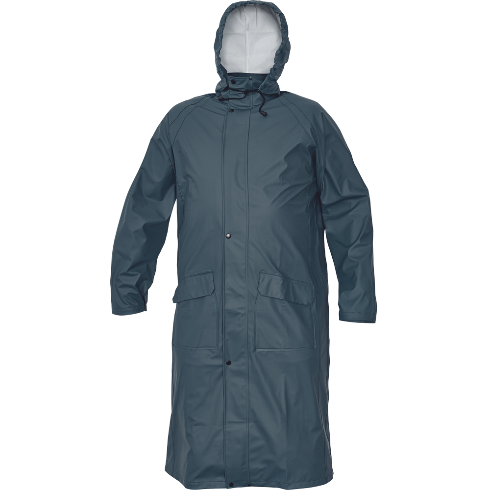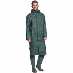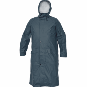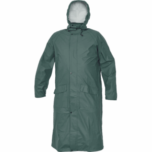 – nepremočljiv in vetru odporen plašč s kapuco v ovratniku, dolg 120 cm – vrvica na kapuci – 2 žepa s poklopcem spredaj – nastavitev spodnjega roba rokavov z zaskočnimi gumbi