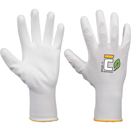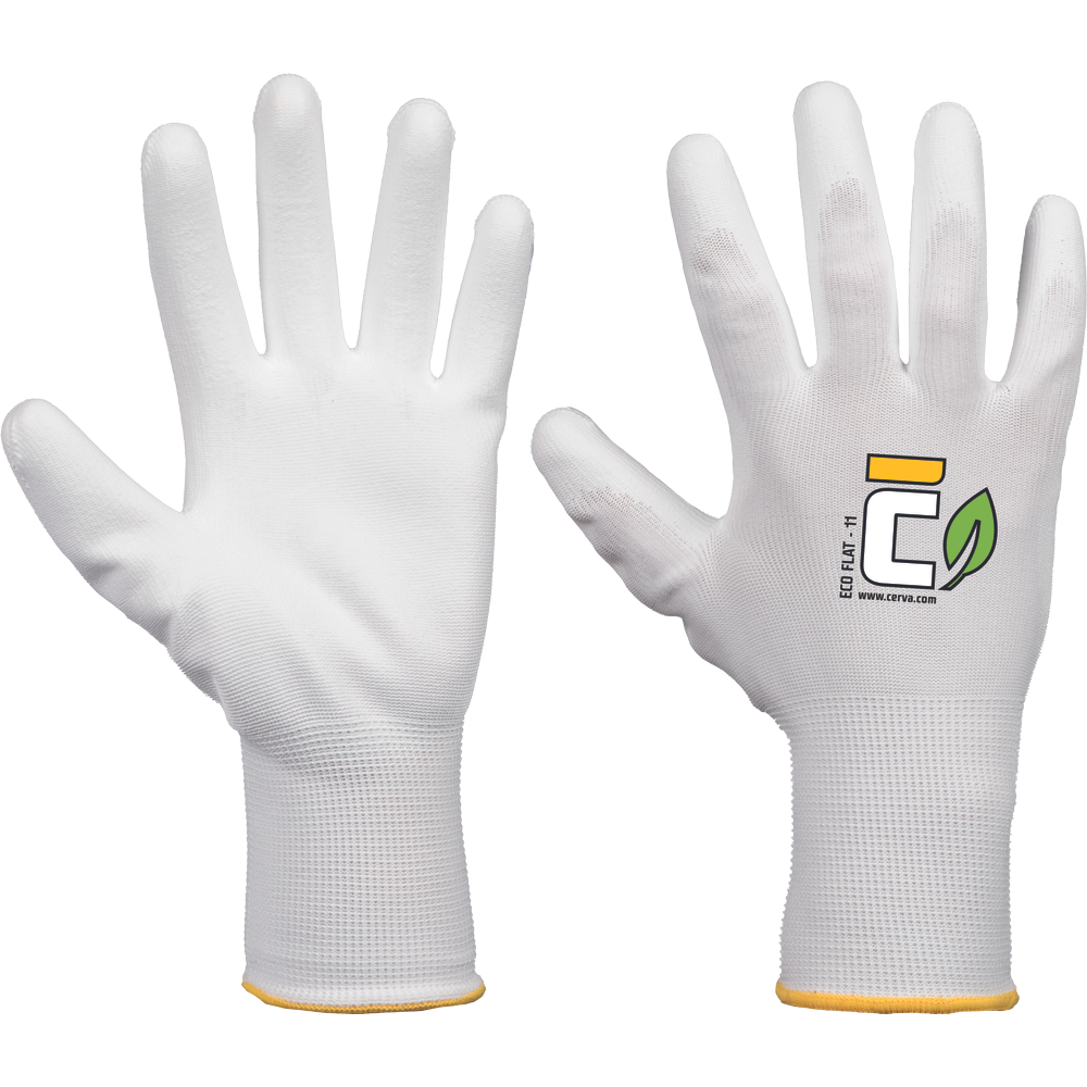 Te petprstne brezšivne rokavice so izdelane iz bele reciklirane poliestrske preje, ki diha in je lahka. Dlan je potopljena v bel poliuretan (PU) na vodni osnovi za boljši oprijem in trpežnost brez zmanjšanja prožnosti. Te rokavice so idealne za natančna opravila, saj združujejo zmogljivost in okoljsko odgovornost. Rokavice ne vsebujejo DMF.