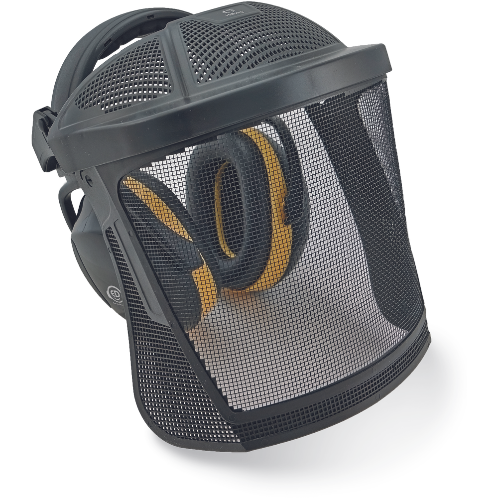 Kombinacija naglavnih slušalk Hellberg z obraznim ščitnikom iz žične mreže iz nerjavečega jekla in ščitniki za ušesa ED 2H Ear Defender; največje udobje in zaščita za uporabnike, ki hkrati ne potrebujejo zaščite glave; izpolnjujejo standard EN 352-1: 2002