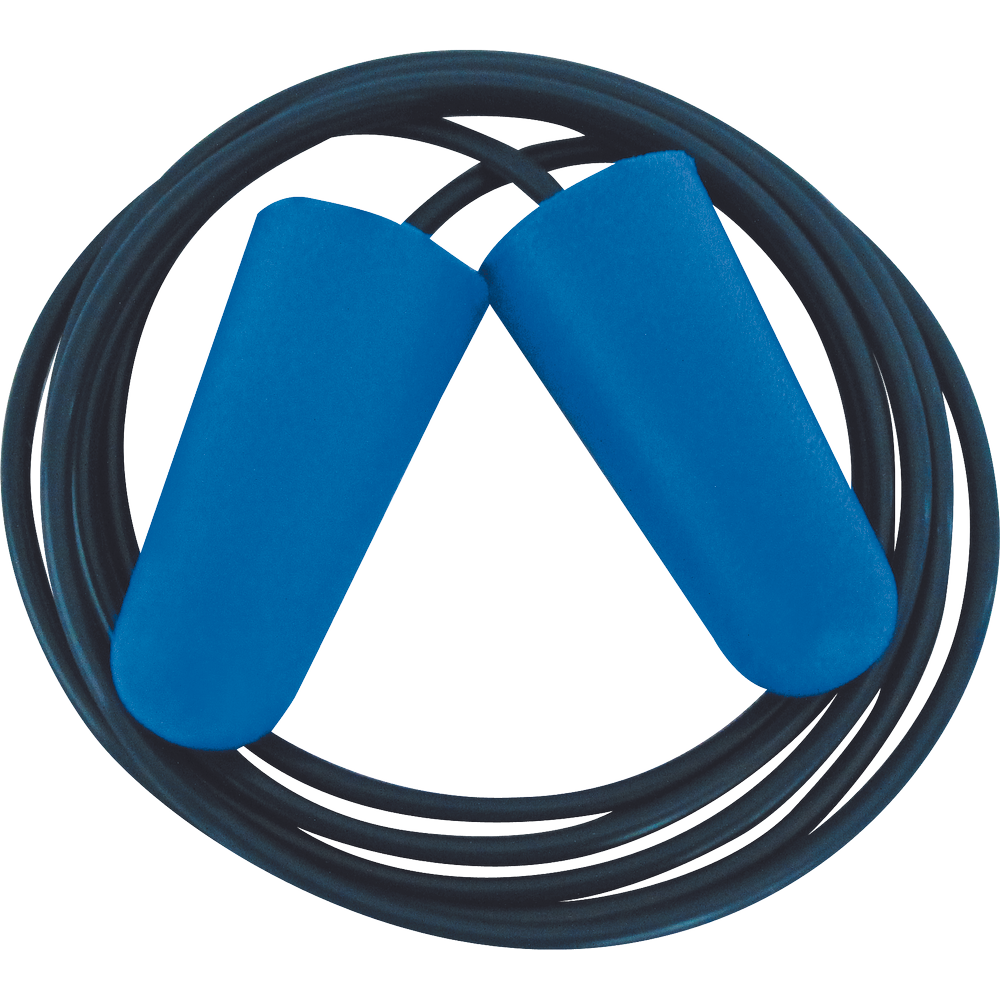 ušesni čepki za enkratno uporabo iz zelo mehke PU pene v modri barvi, z vrvico in kovinsko kroglico, ki jo je mogoče zaznati z detektorjem kovin; ergonomska oblika za lažje vstavljanje v sluhovod in popoln oprijem na njegove stene za visoko udobje pri uporabi; primerni za uporabo v živilski industriji; EN 352-2