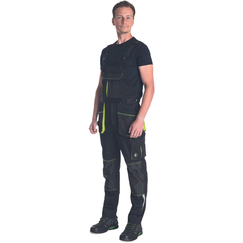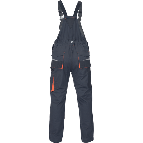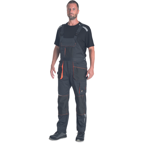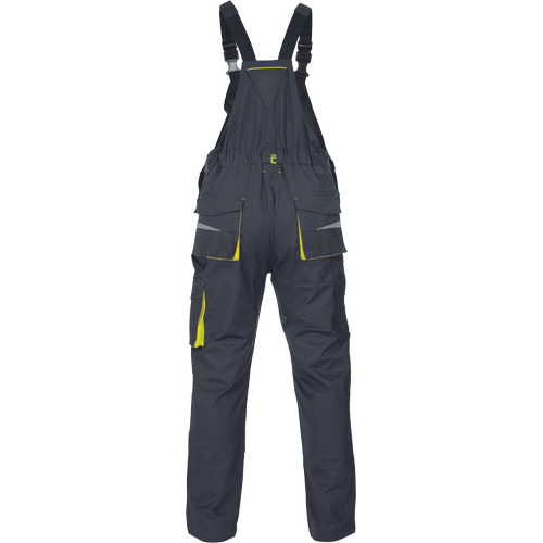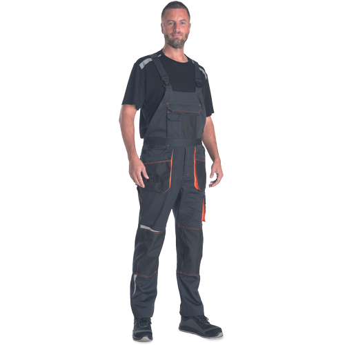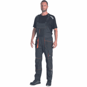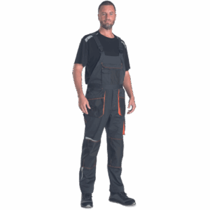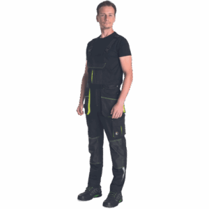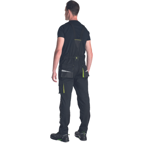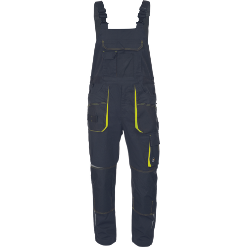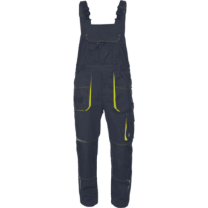 – moške delovne hlače z naprsnikom iz zelo trpežne raztegljive tkanine – elastični pas – večnamenski žepi – 1 velik prsni žep – ojačitev kolenskih žepov Oxford 600D za vstavljanje kolenskih blazinic – potiskani odsevni elementi – nastavljiva dolžina noge