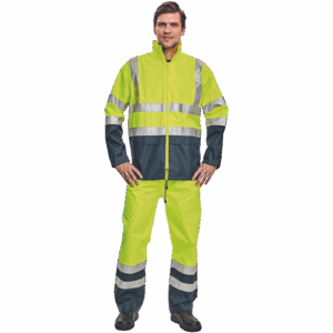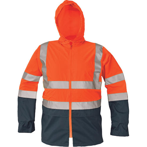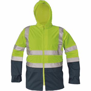 – moška jakna Hi-VIS brez podloge in kapuce v ovratniku, lepljeni šivi – visoka vodoodpornost, prepustna – odsevne črte 3M čez ramena ter okoli bokov in rokavov – 2 sprednji pokrovi z zavihki – spodnji rob in kapuca z vrvico