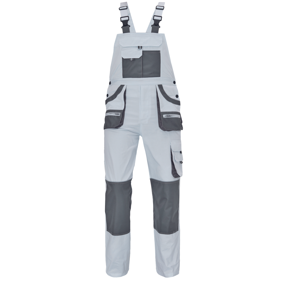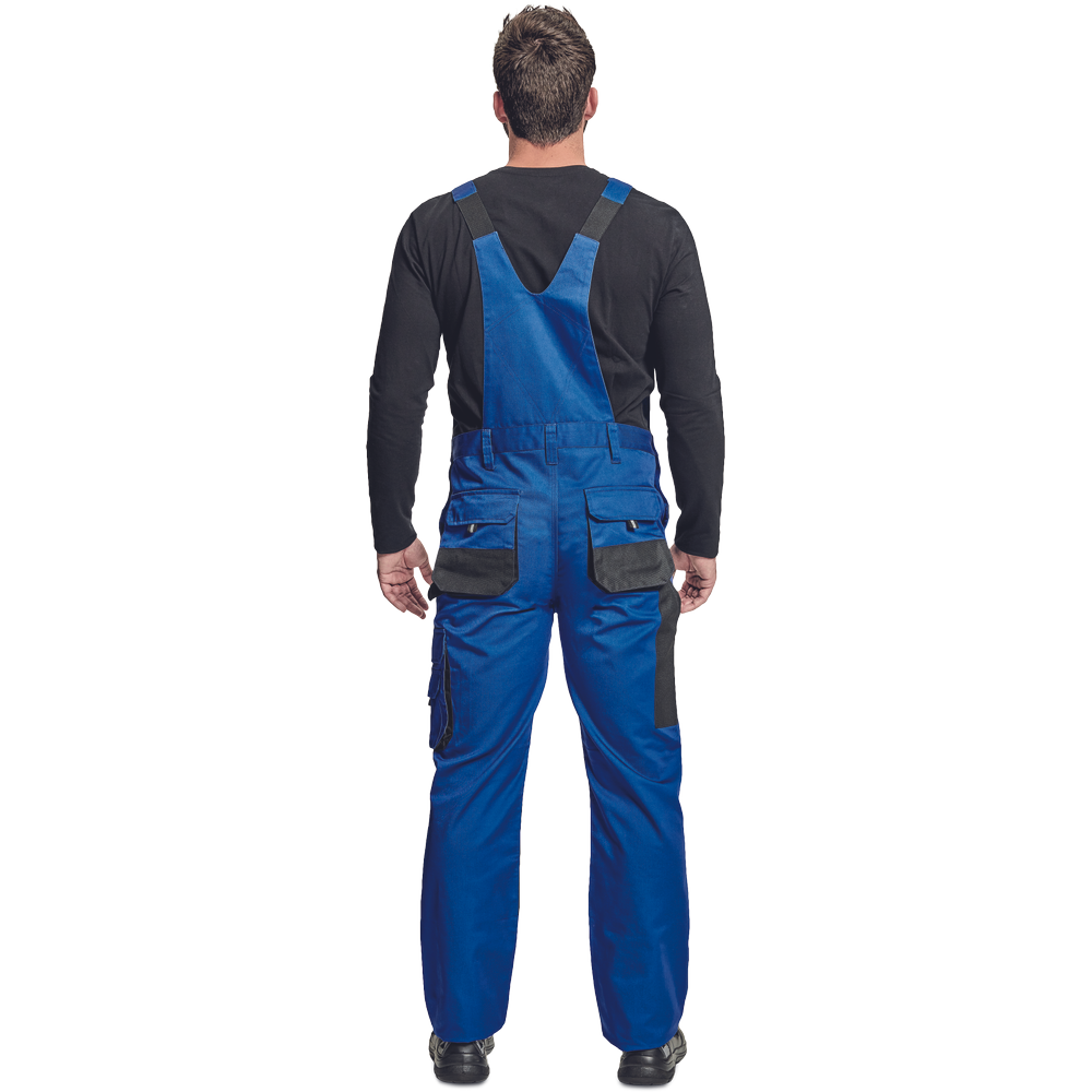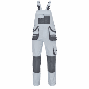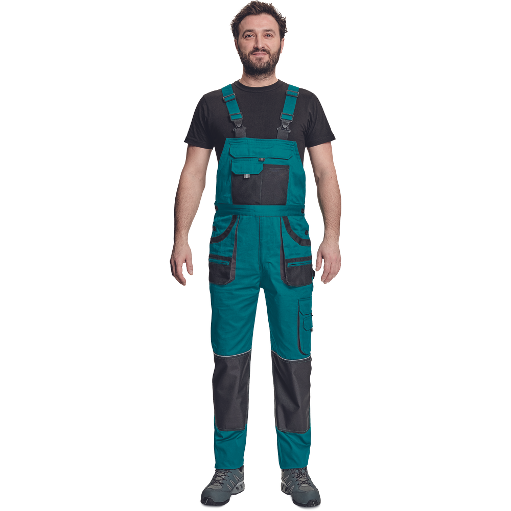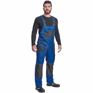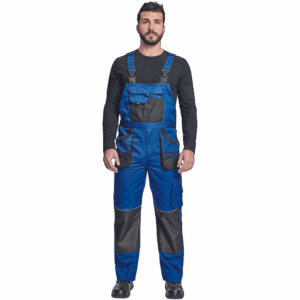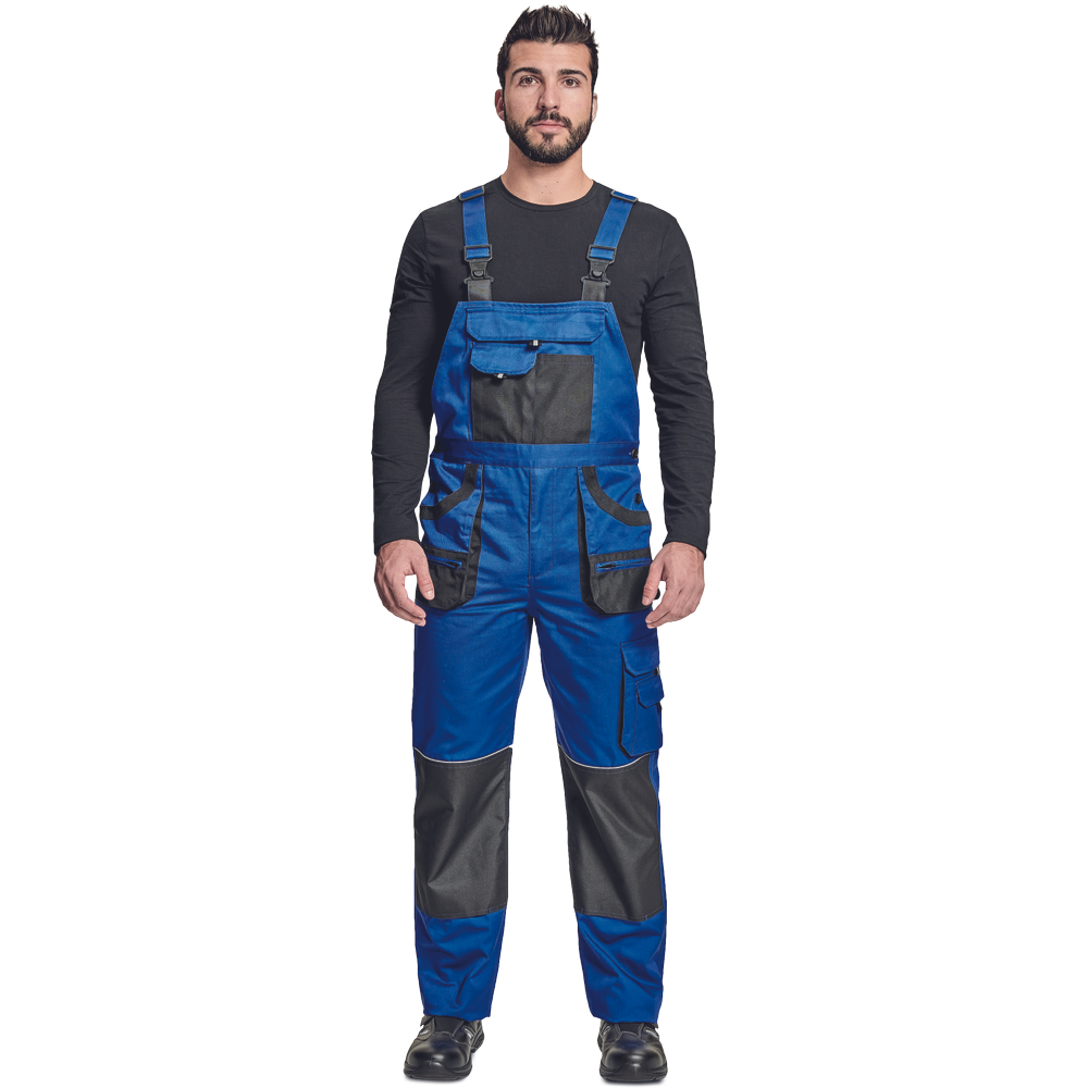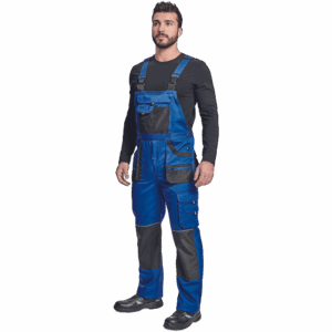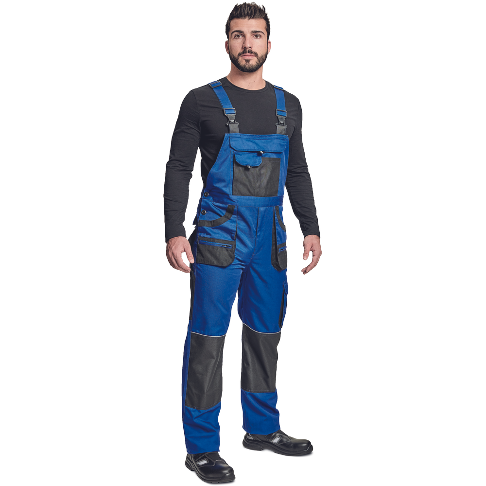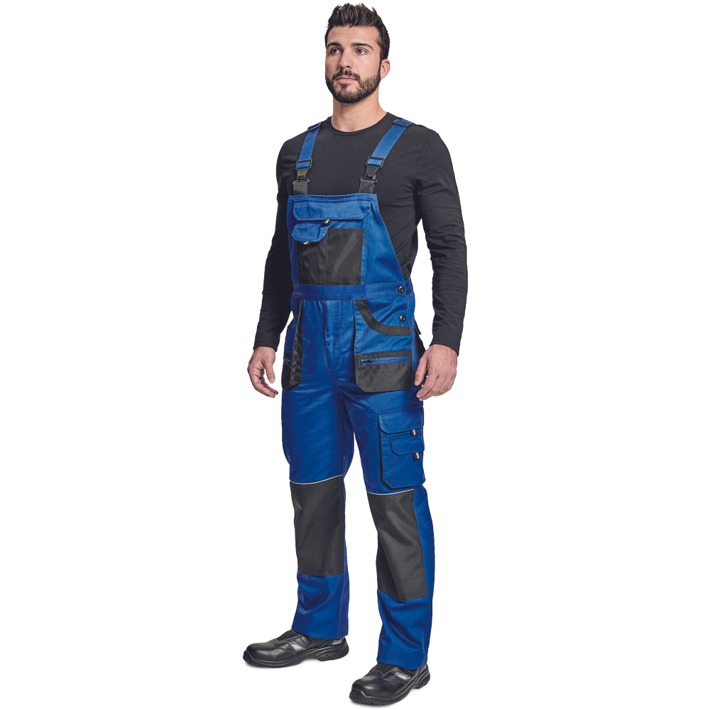 – moške delovne hlače z naprsnikom in večnamenskimi žepi – obe strani pasu se zapenjata na gumb – poliester Oxford, ojačani deli kolen z žepi za vstavljanje ščitnikov za kolena
