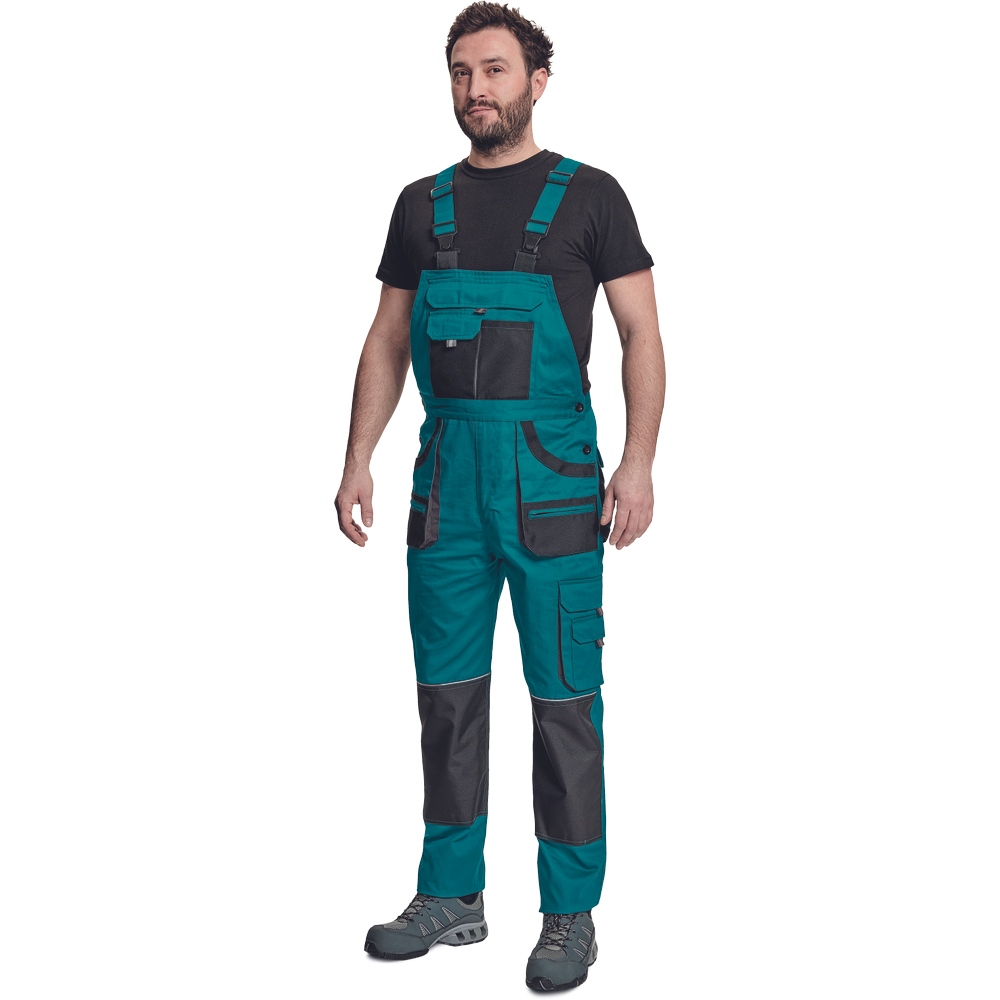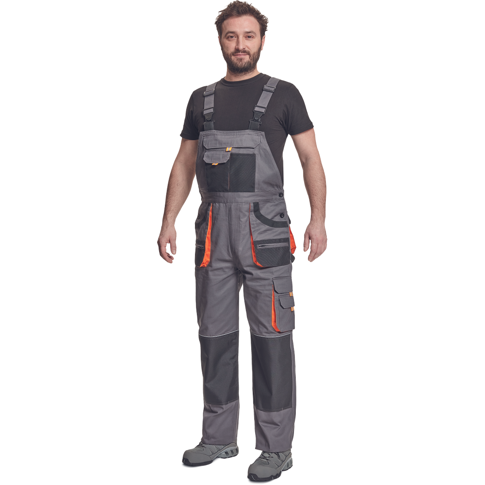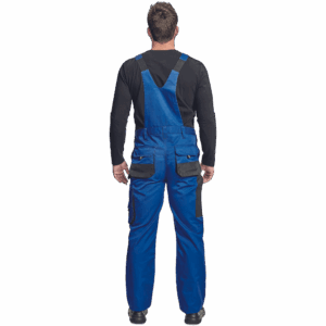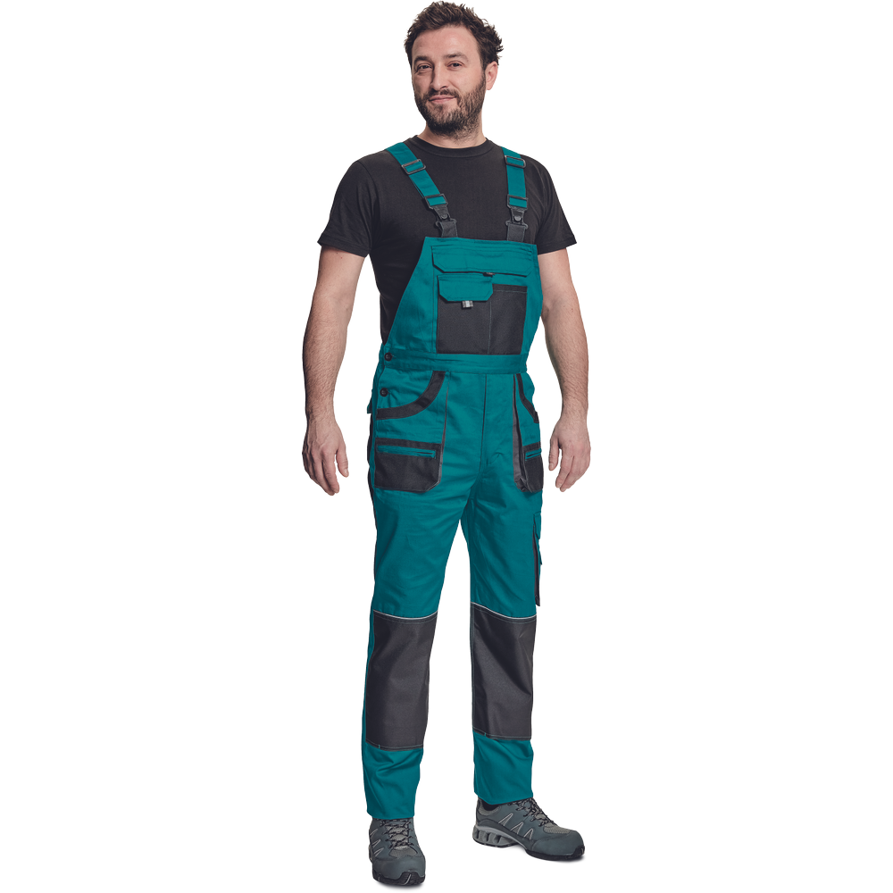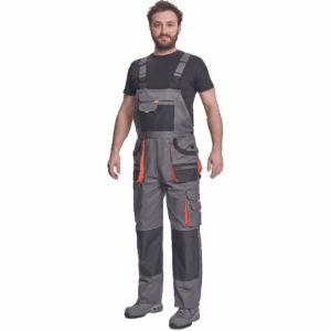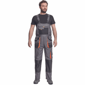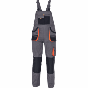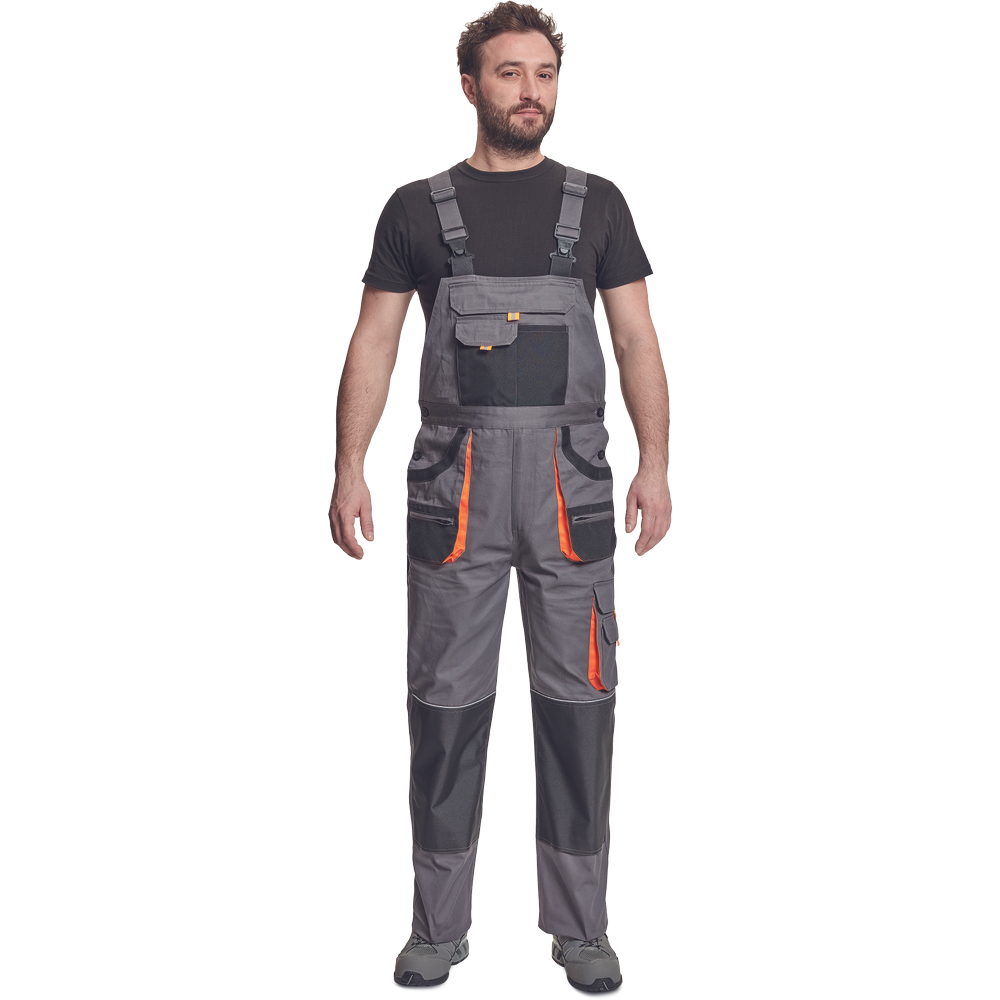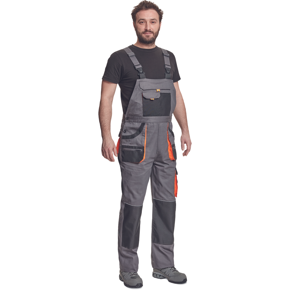 – moške delovne hlače z naprsnikom in večnamenskimi žepi – obe strani pasu se zapenjata na gumb – poliester Oxford, ojačani deli kolen z žepi za vstavljanje ščitnikov za kolena