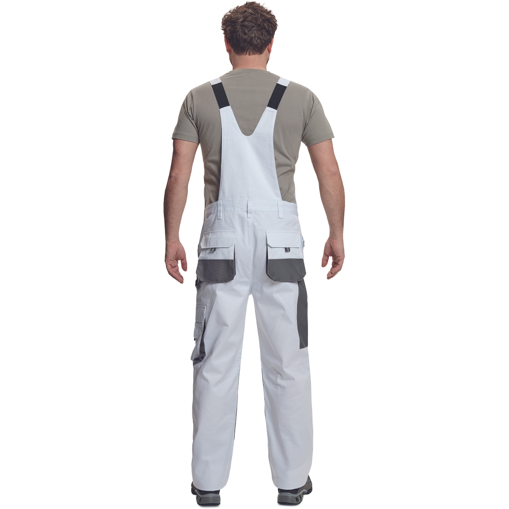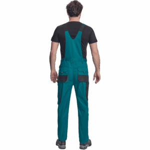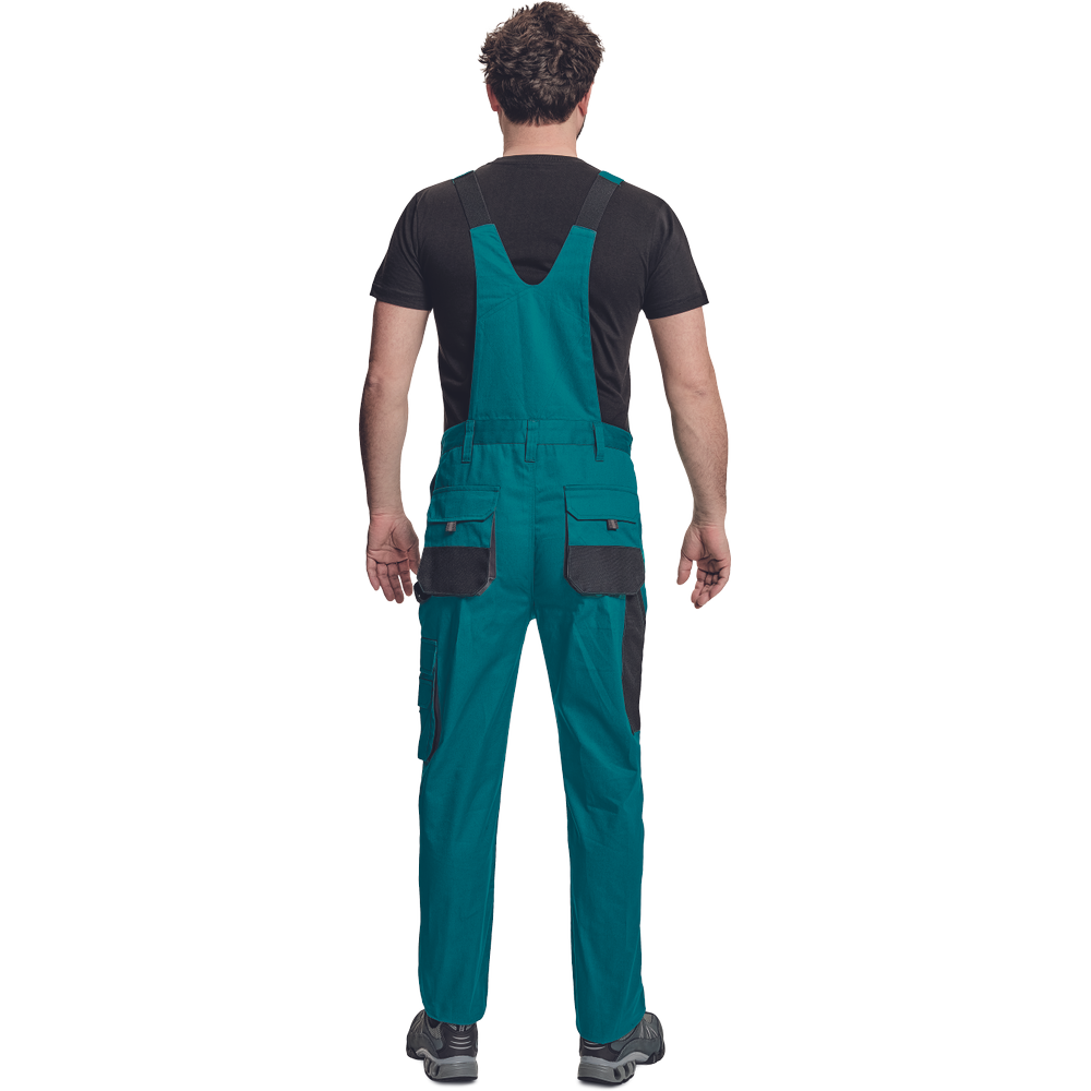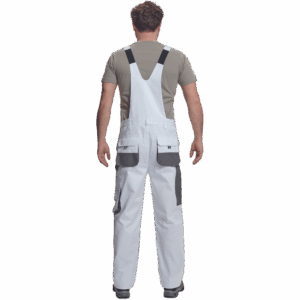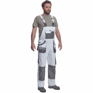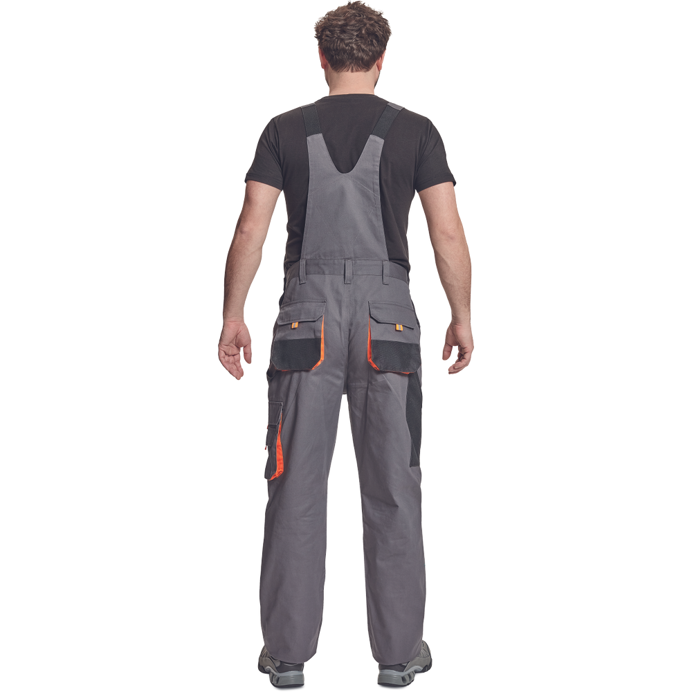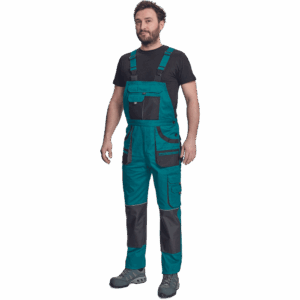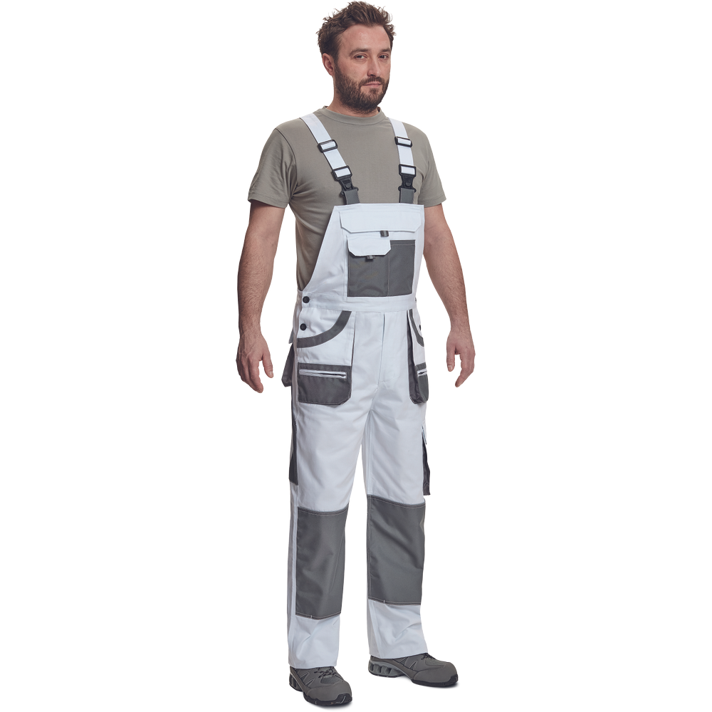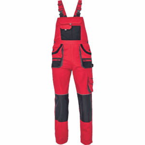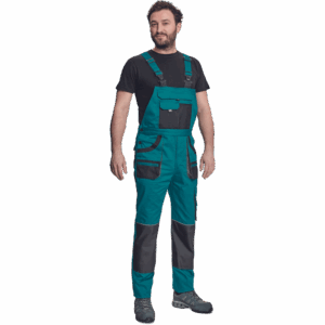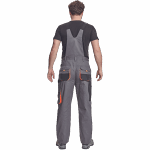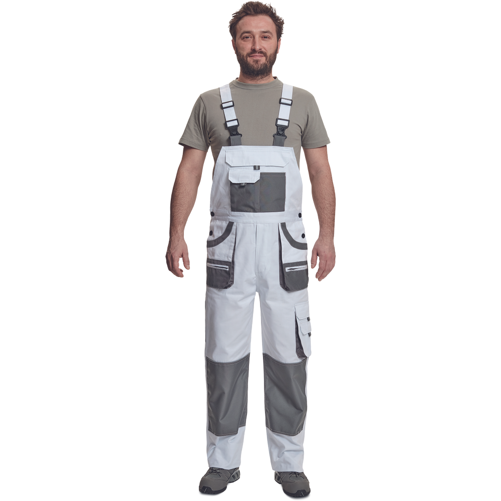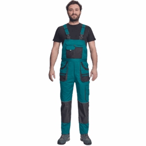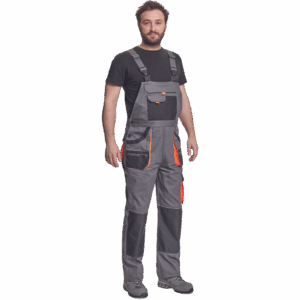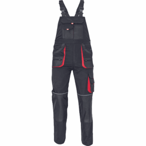 – moške delovne hlače z naprsnikom in večnamenskimi žepi – obe strani pasu se zapenjata na gumb – poliester Oxford, ojačani deli kolen z žepi za vstavljanje ščitnikov za kolena