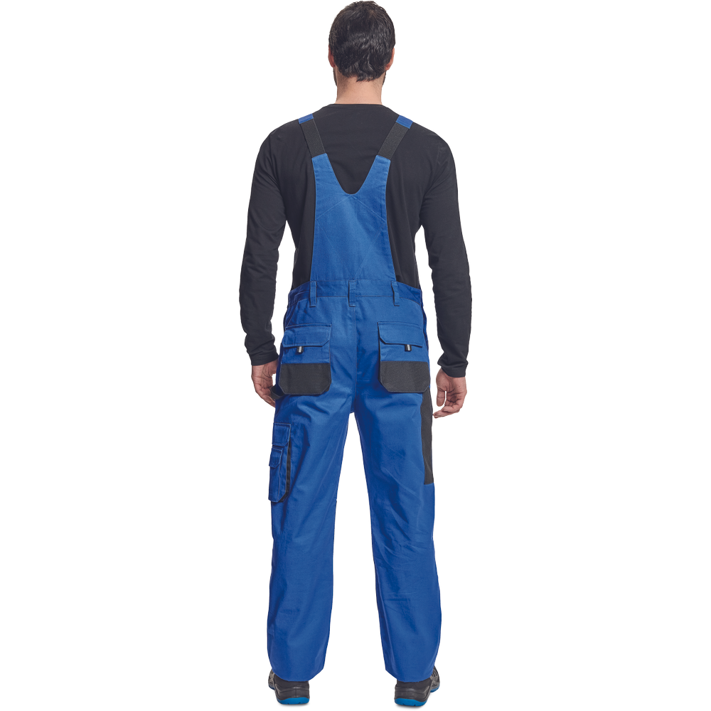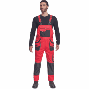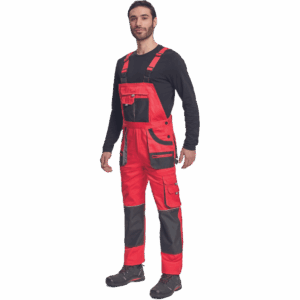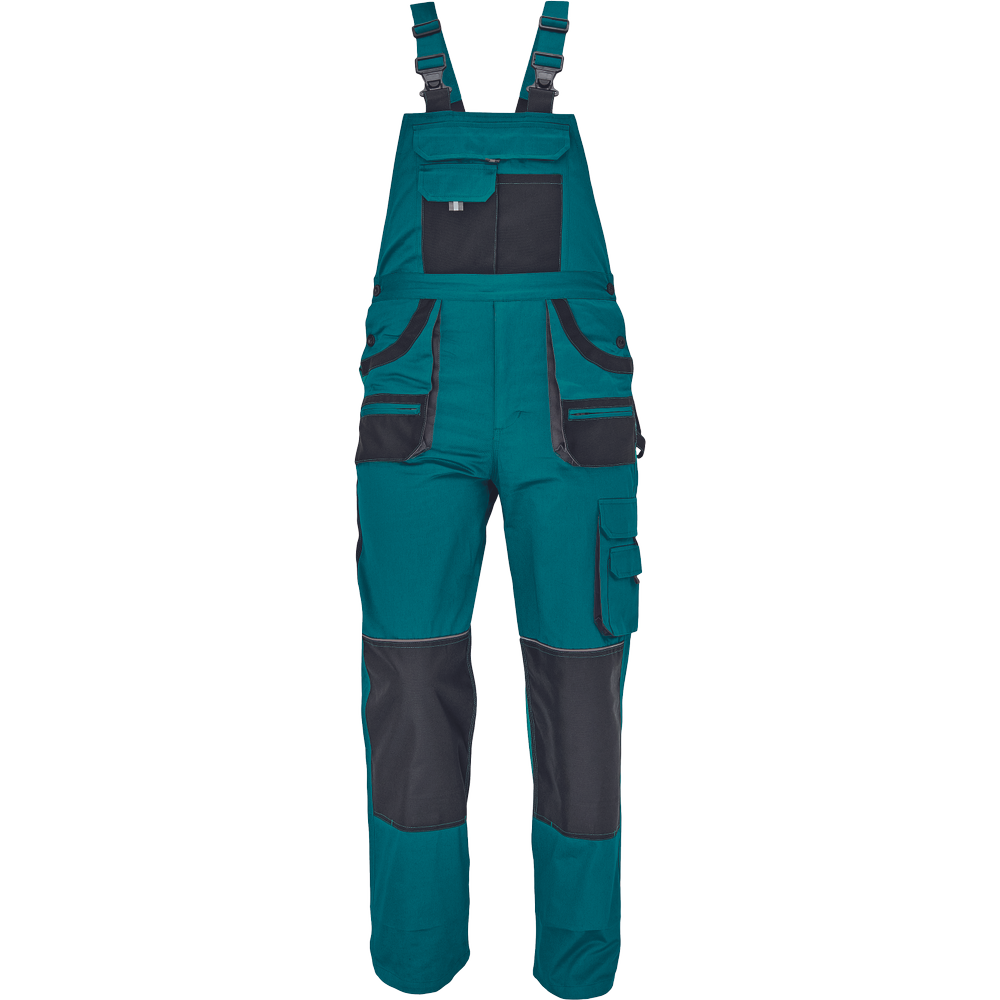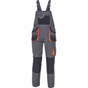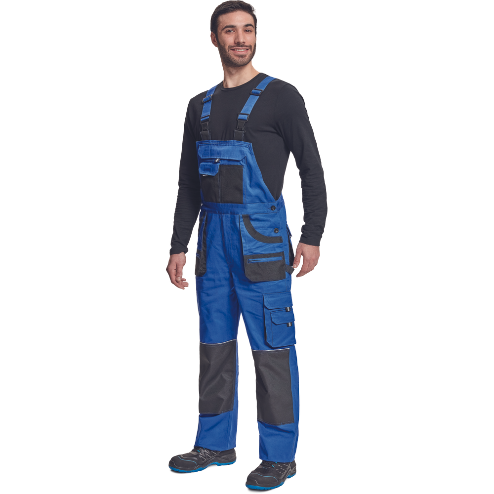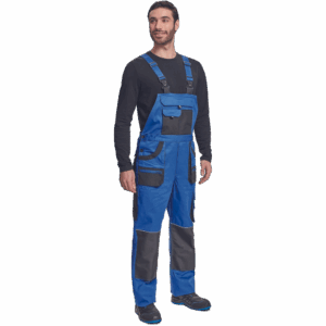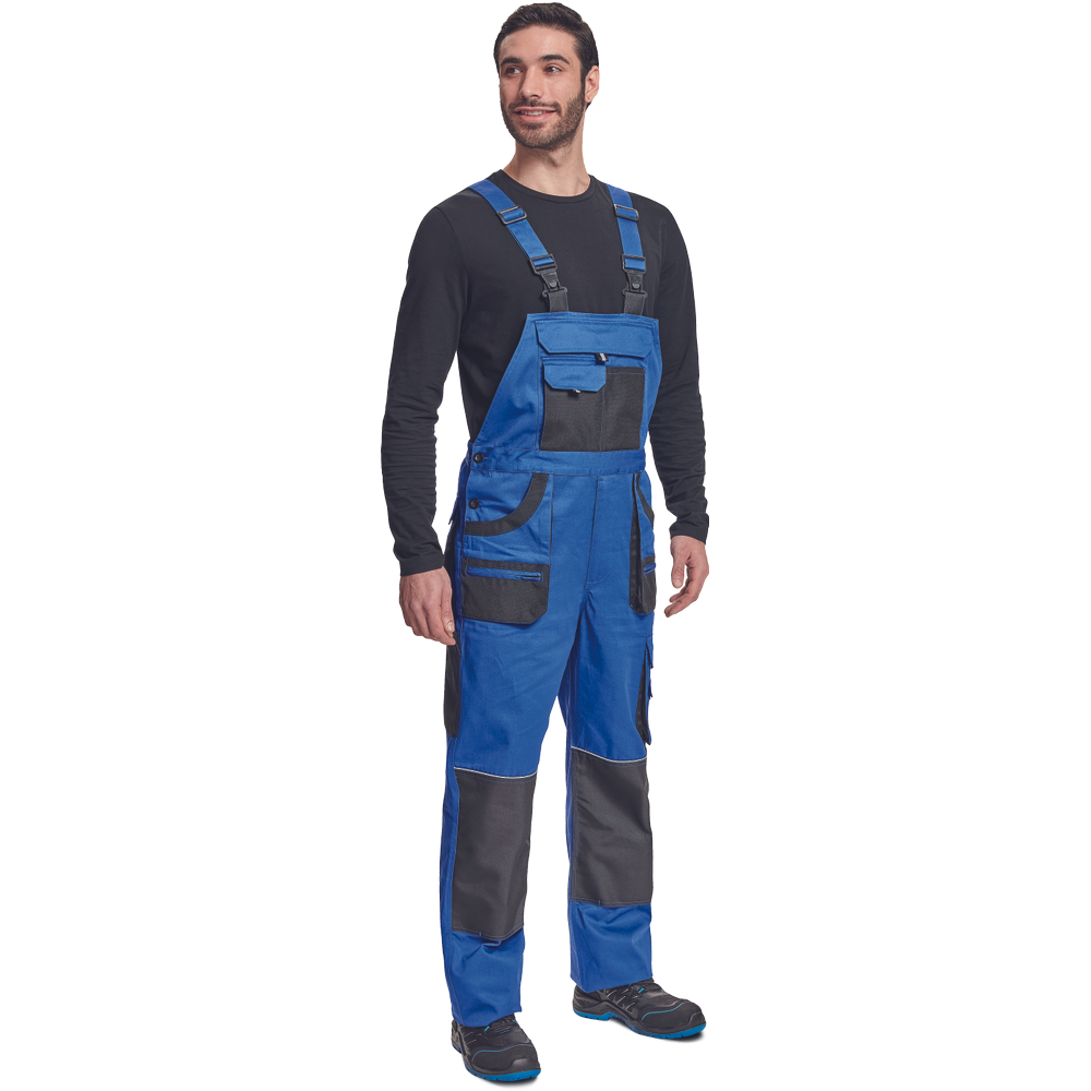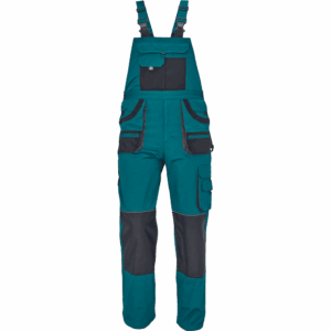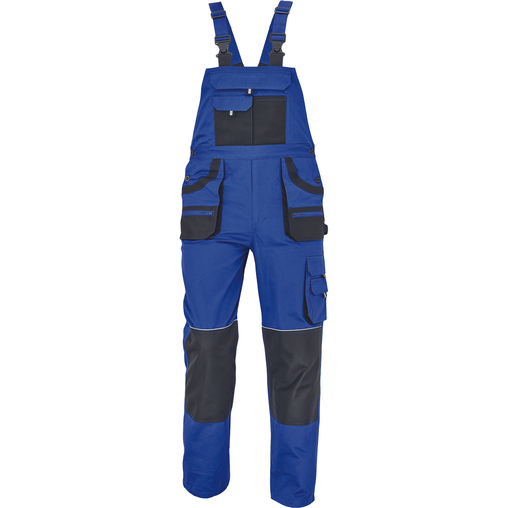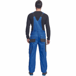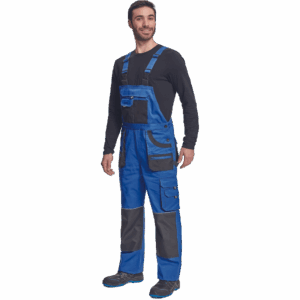 – moške delovne hlače z naprsnikom iz bombaža – 7 funkcionalnih vrečk – zapenjanje pasu na oba stranska gumba – ojačani kolenski deli iz poliestra Oxford z žepi za vstavljanje ščitnikov za kolena – podaljšana dolžina nog.
