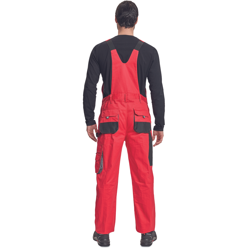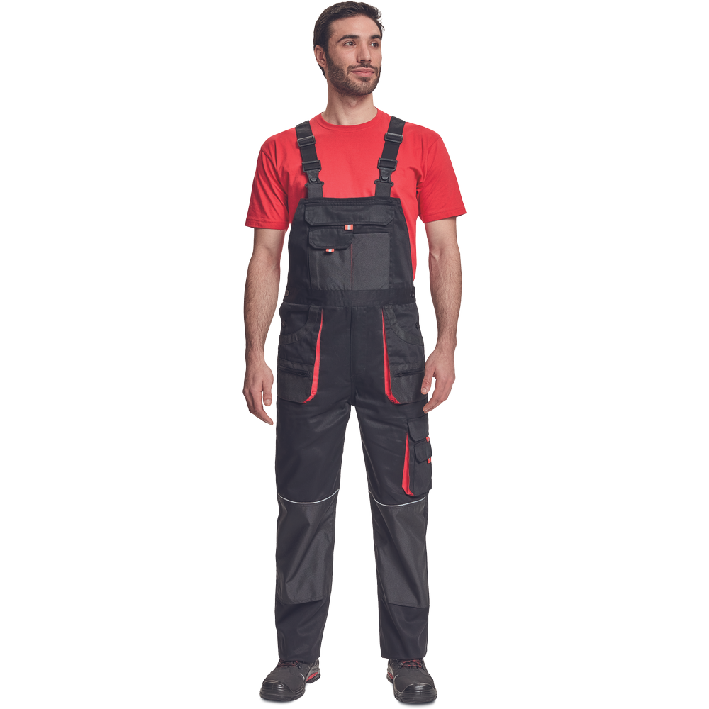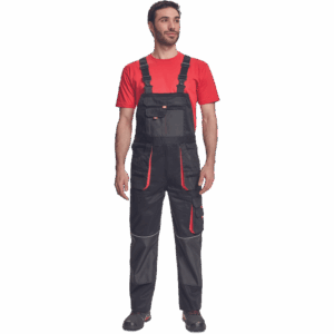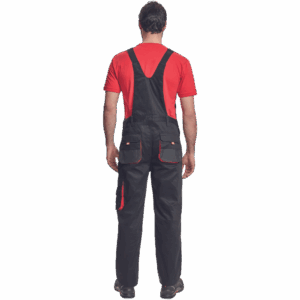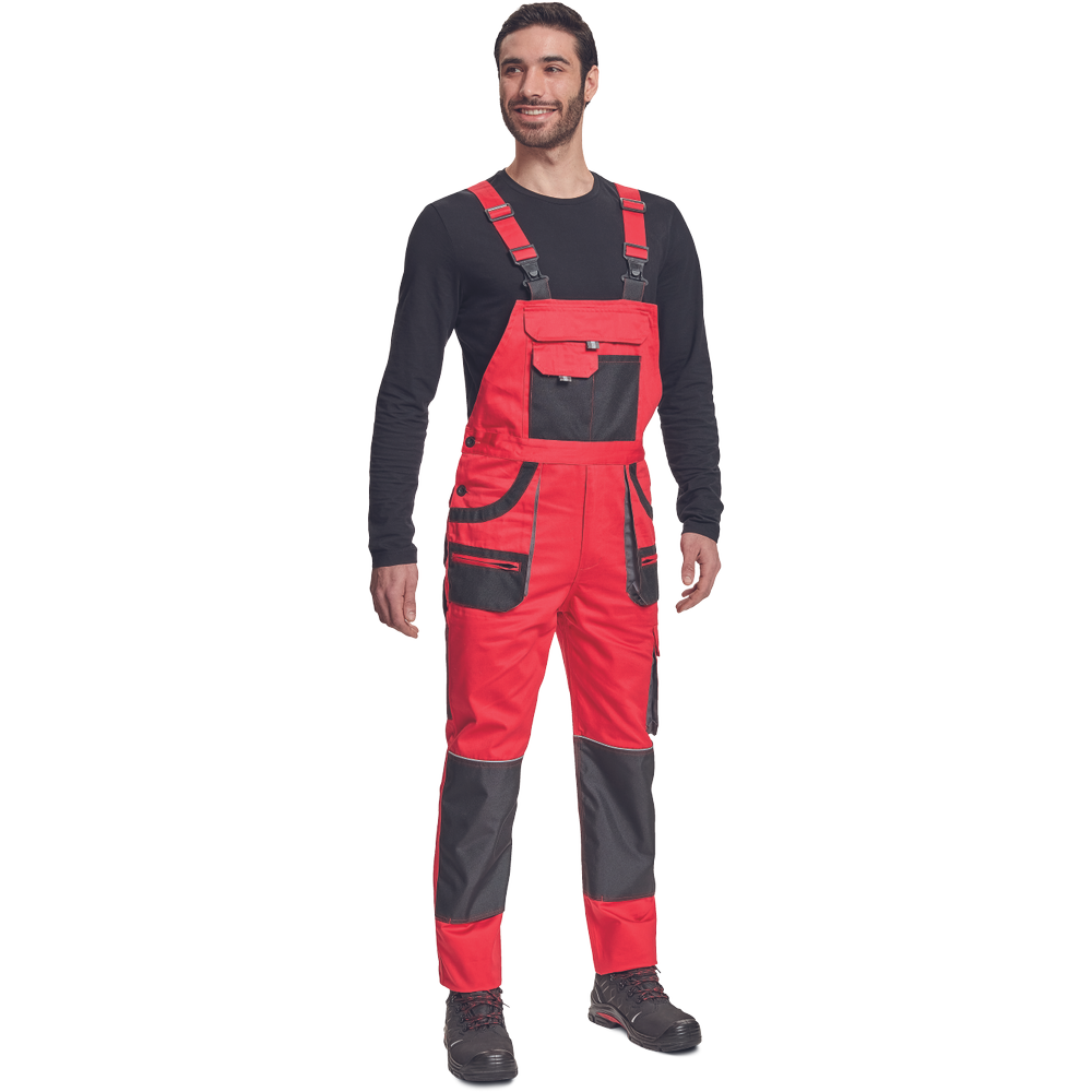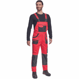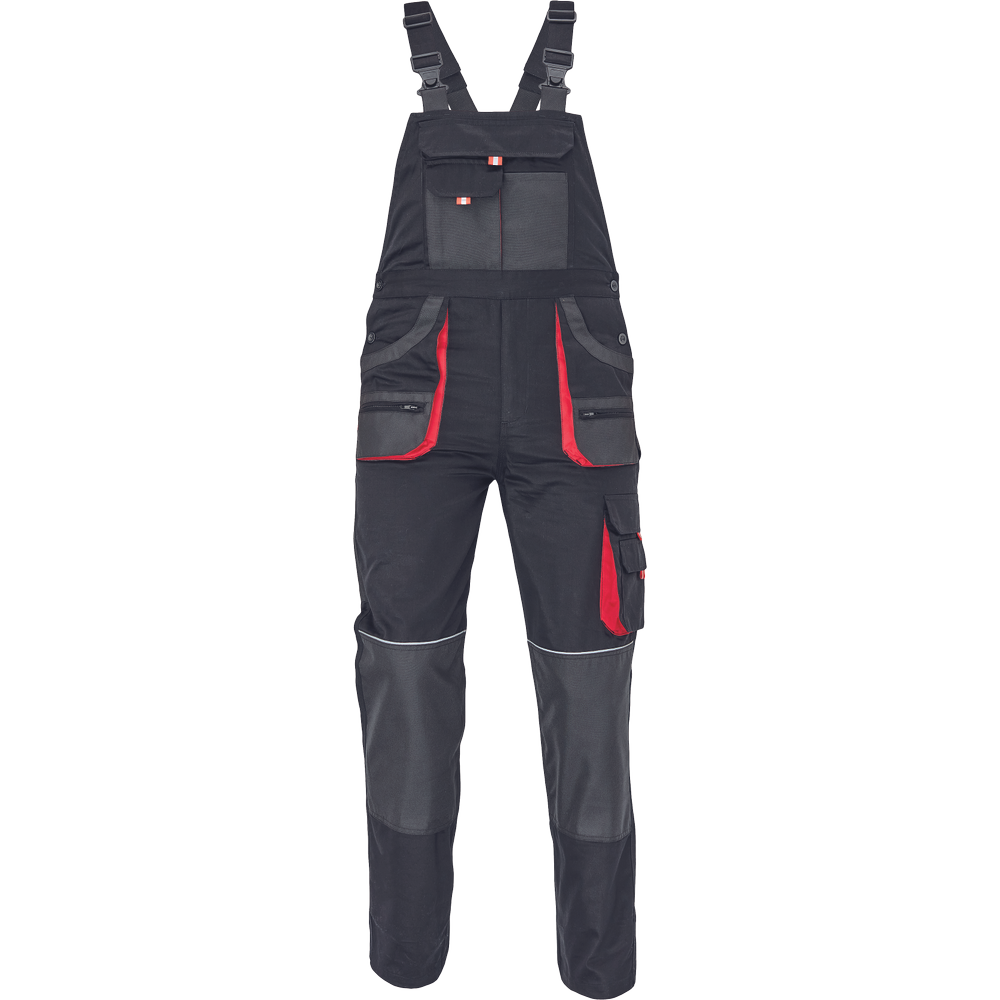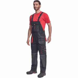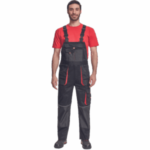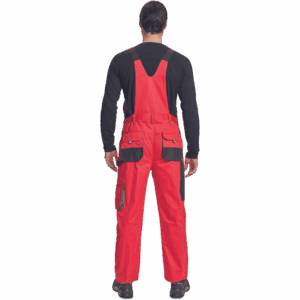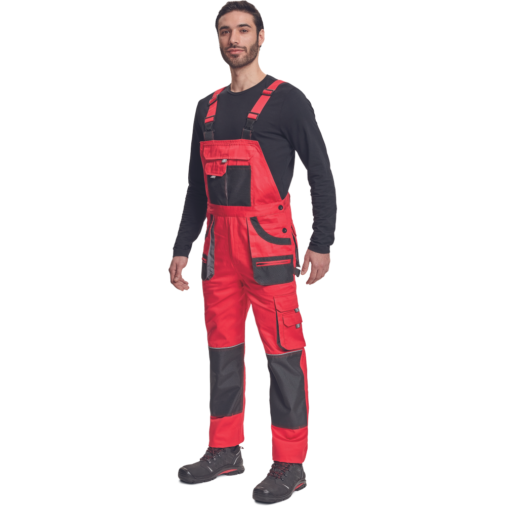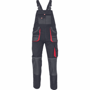 – moške delovne hlače z naprsnikom iz bombaža – 7 funkcionalnih vrečk – zapenjanje pasu na oba stranska gumba – ojačani kolenski deli iz poliestra Oxford z žepi za vstavljanje ščitnikov za kolena – podaljšana dolžina nog.