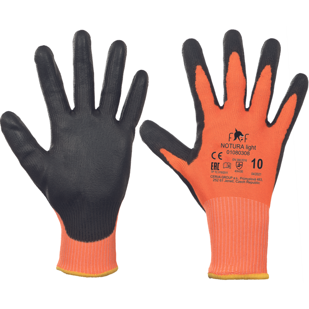 – pletene brezšivne rokavice, na dlaneh in prstih premazane s črnim poliuretanom – najvišja stopnja zaščite pred urezninami E
