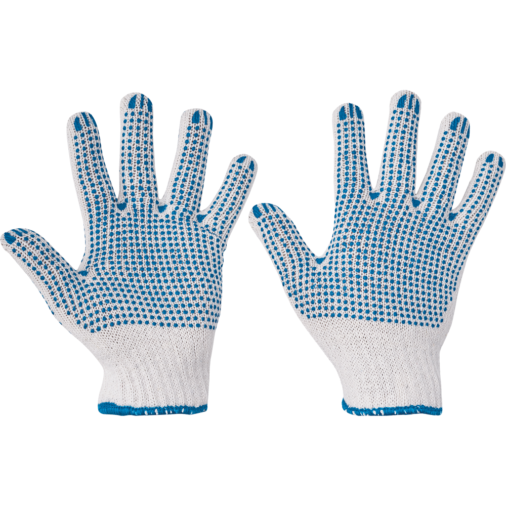 – pletene brezšivne rokavice iz mešanice poliestra in bombaža – PVC pike na dlani, hrbtu in prstih