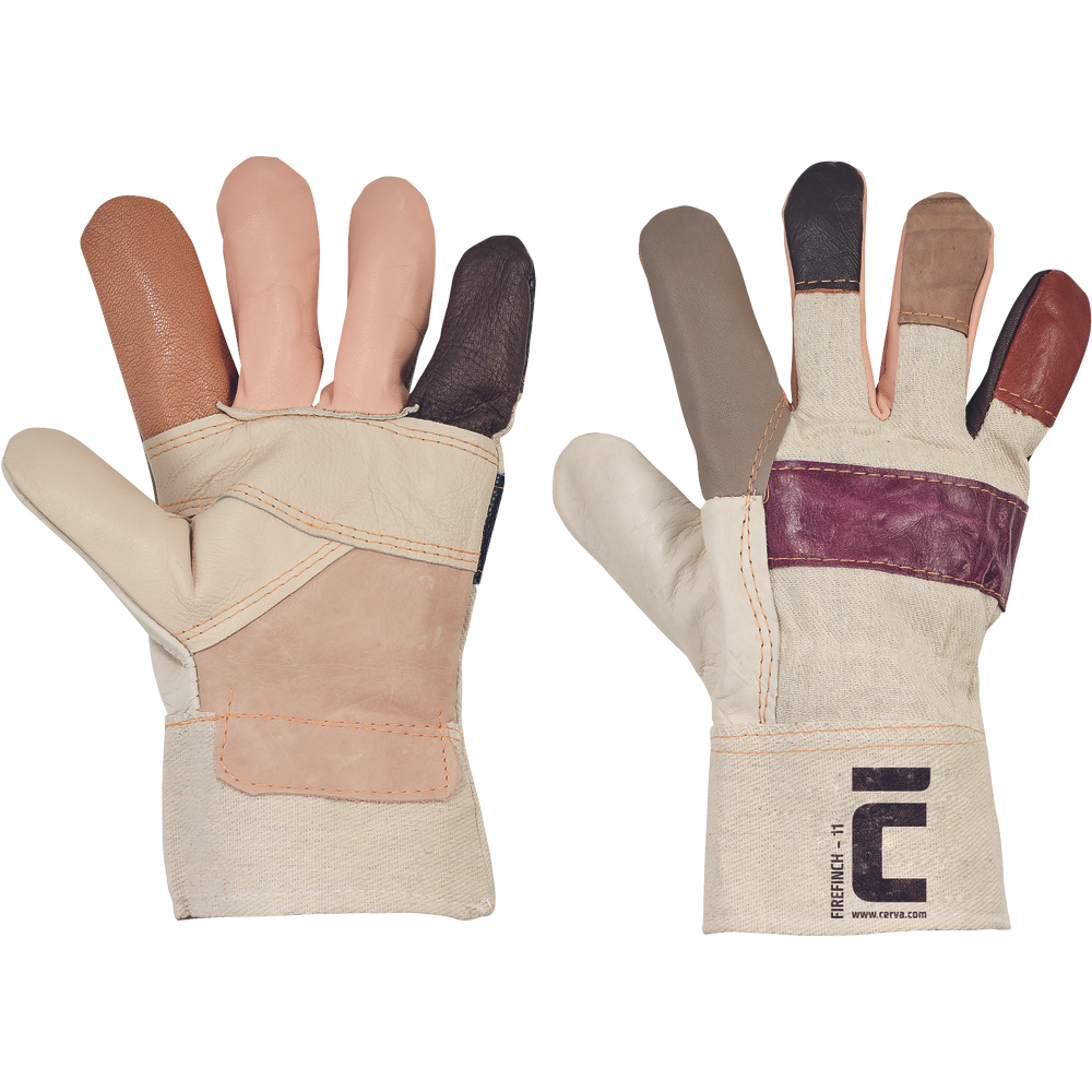 – rokavice iz večbarvne pohištvene goveje kože – topla podloga na dlani in hrbtu – manšeta iz bombažne tkanine