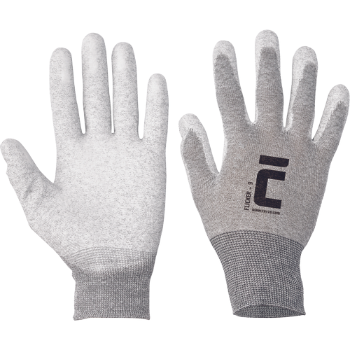 – pletene brezšivne antistatične rokavice iz najlona – integrirana ogljikova vlakna – poliuretanska plast na dlani in prstih – elastična manšeta
