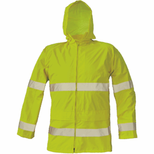 – lahka moška nepremočljiva jakna HI-VIS z odsevnimi črtami – kapuca v ovratniku – visoka vodoodpornost, prepustna – 2 sprednja žepa z zavihki – spodnji rob z vrvico – zračenje pod pazduho in na hrbtu – lepljeni šivi