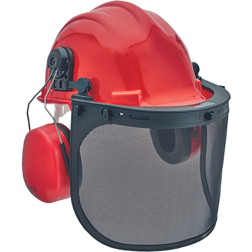 Gozdarski komplet vsebuje: rdečo čelado iz ABS z nastavljivo velikostjo s pomočjo drsnega nastavka. Velikost 55-62 cm. Obešena na 4 točkah, PE križ za obešanje. Nosilec vizirja, mrežast vizir, rdeči zaščitni ščitniki za ušesa, 26 SNR, EN 352-3: 2002. Čelada – EN 397: 2012+A1: 2012, ANSI Z89.1