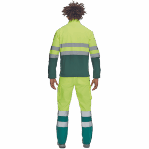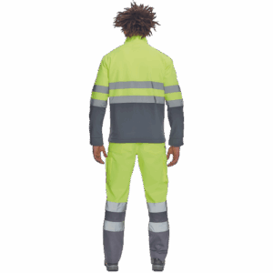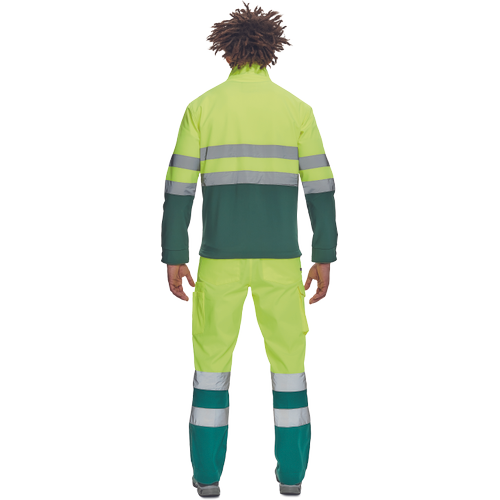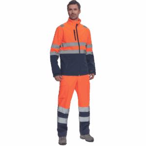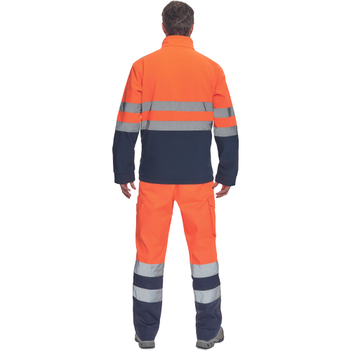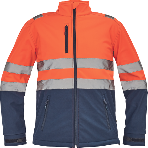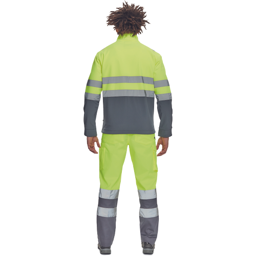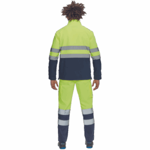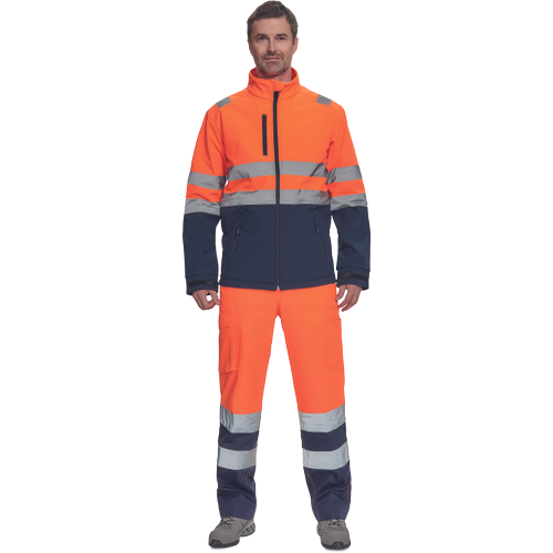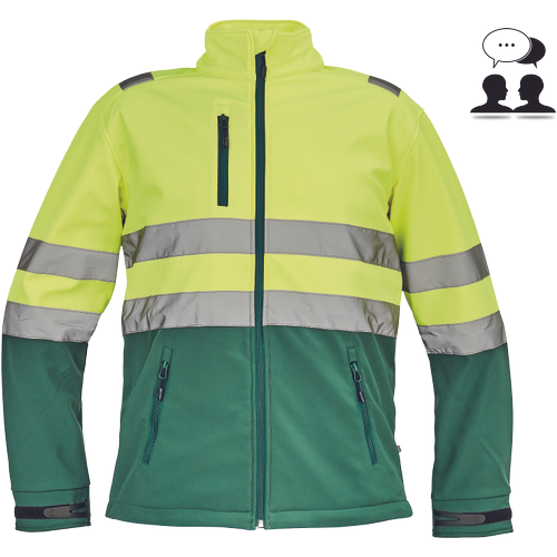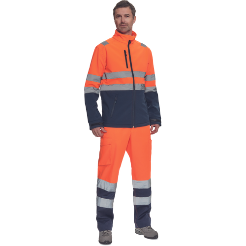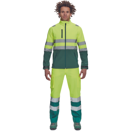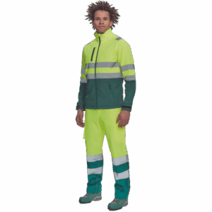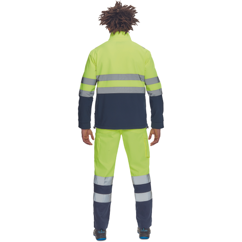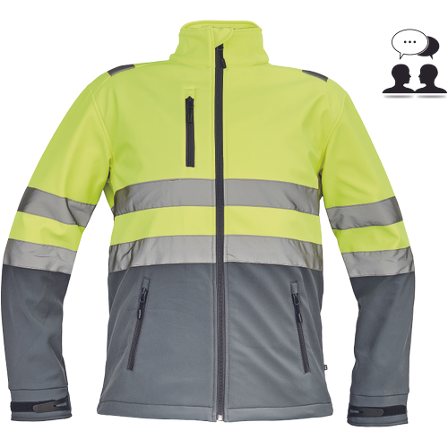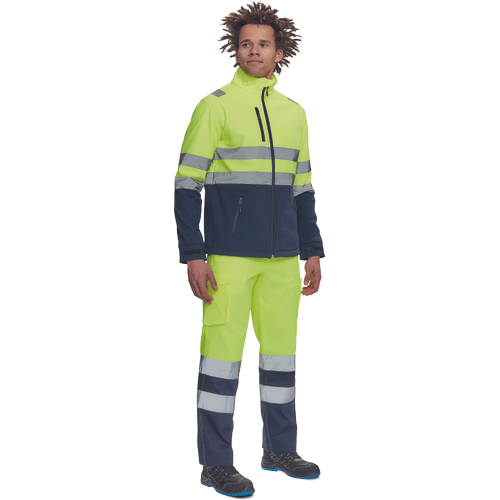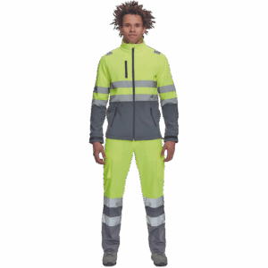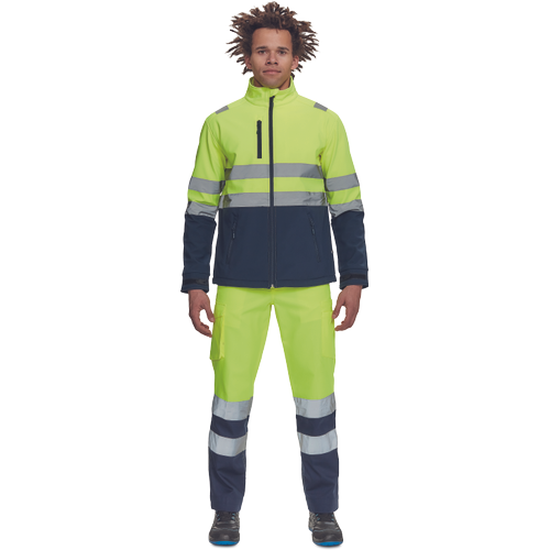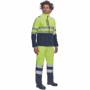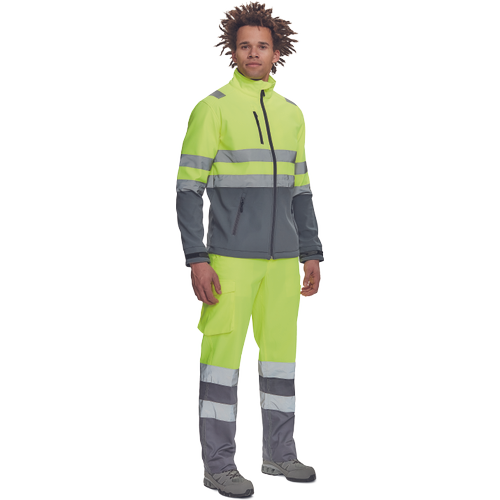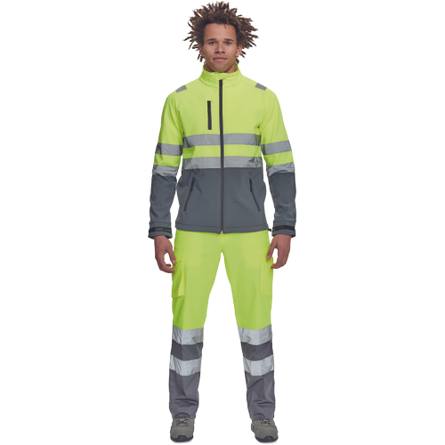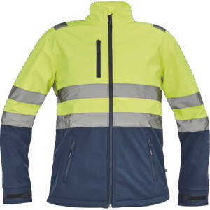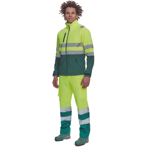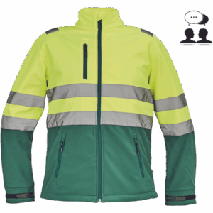 – moška sofstell jakna HI-VIS z zračno membrano TPU, odporno na vodo – odsevne črte na ramenih ter okoli rokavov in bokov – zadrga – 1 prsni in 2 stranska žepa na zadrgo – zapiranje rokavov z velcro in vrvico na dnu