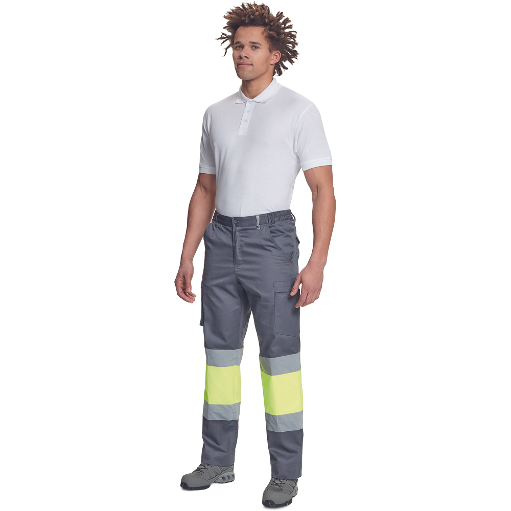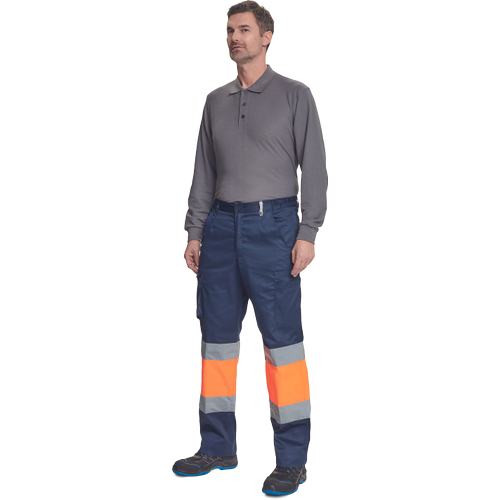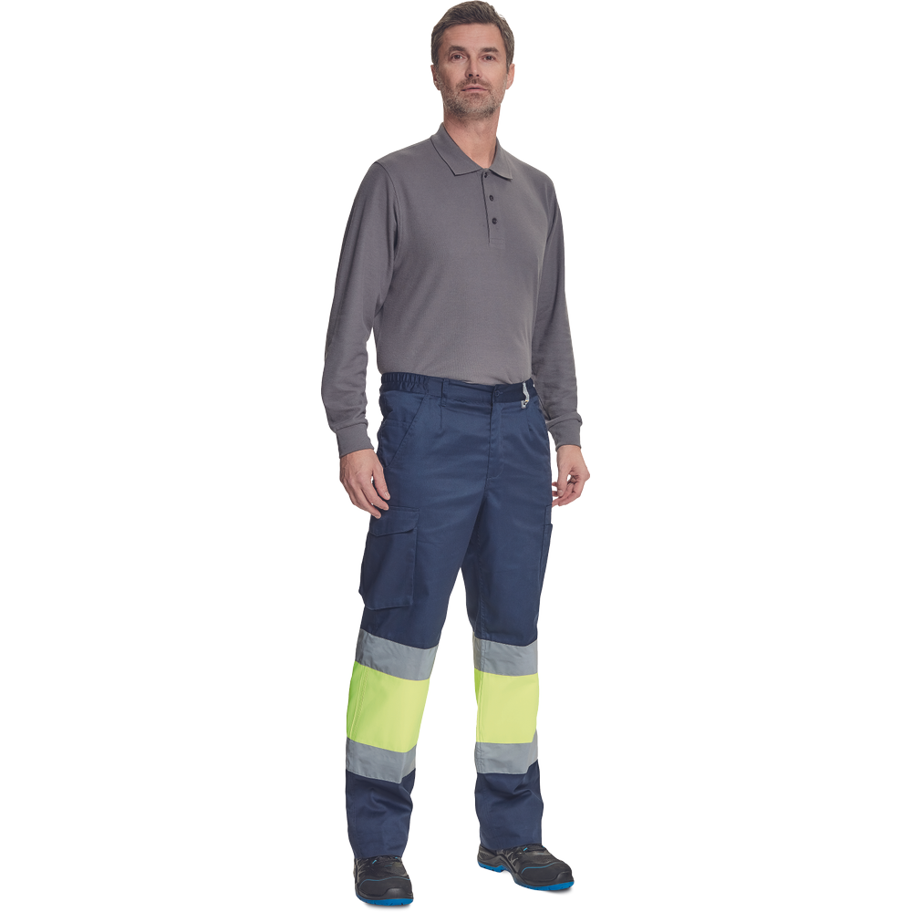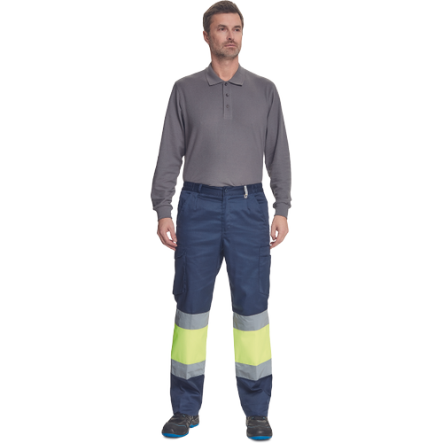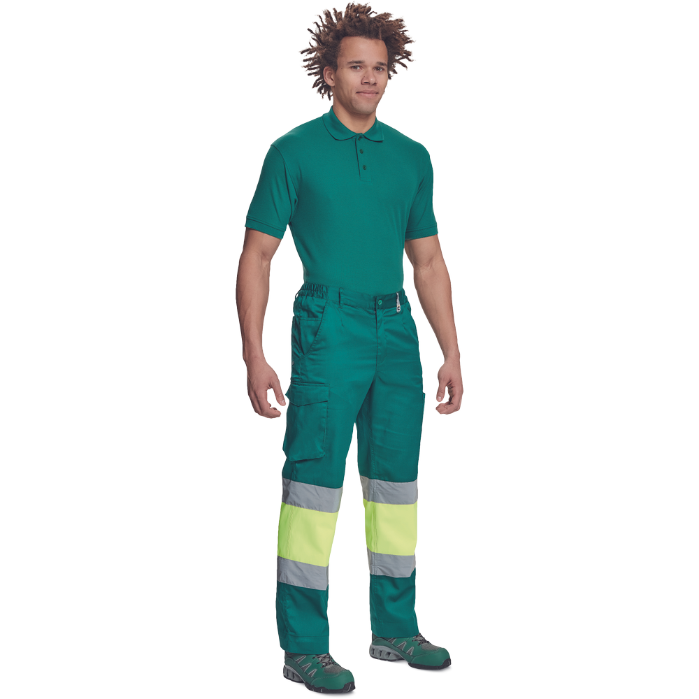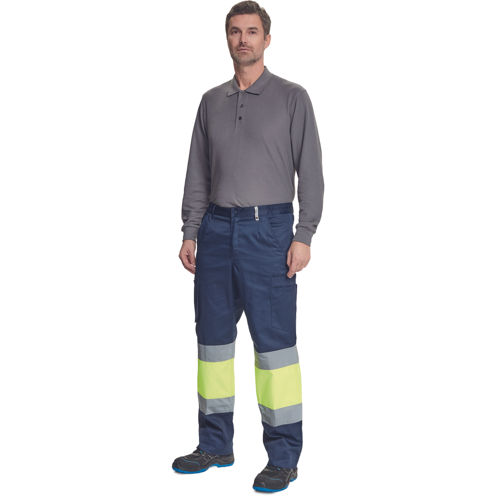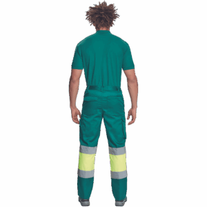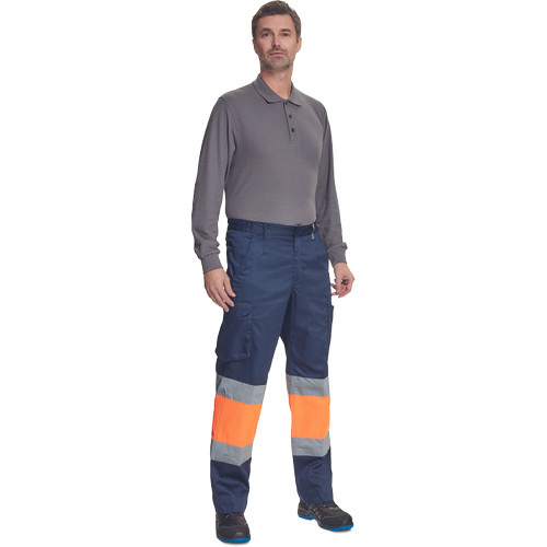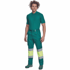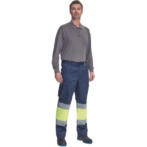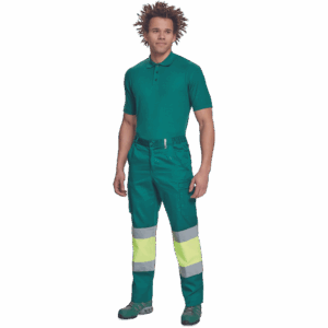 – lahke moške delovne hlače v kombinaciji z delom HI-VIS in odsevnimi črtami – elastičen pas – 2 stranska žepa – 1 žep za kovance – 2 žepa na stegnih – 2 zadnja žepa – podaljšana dolžina nog