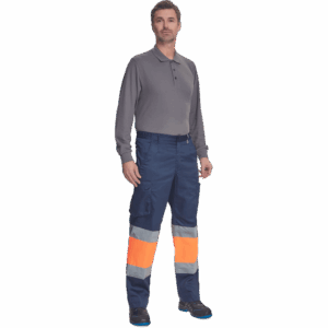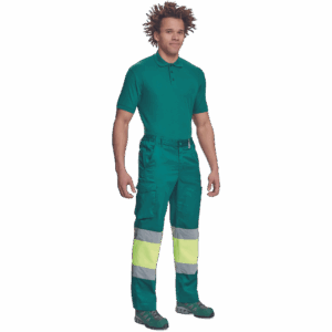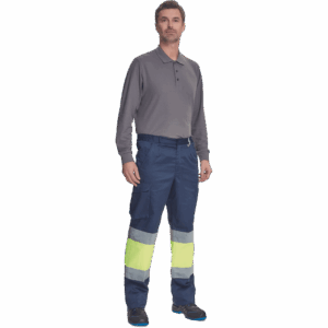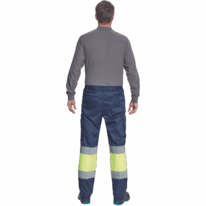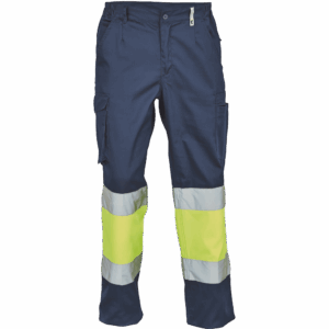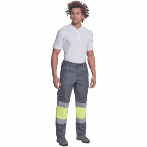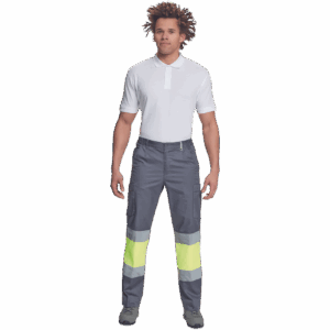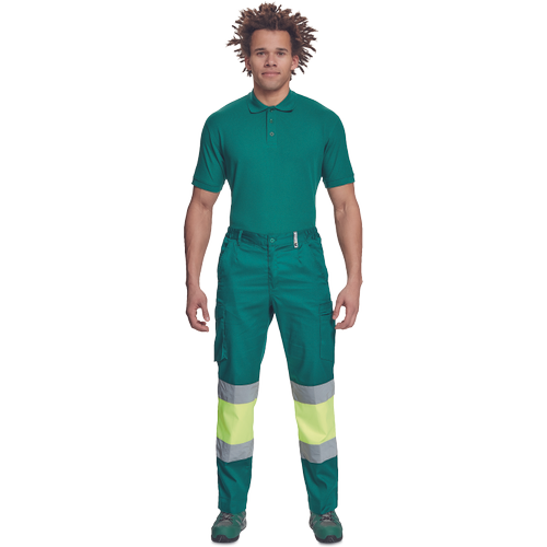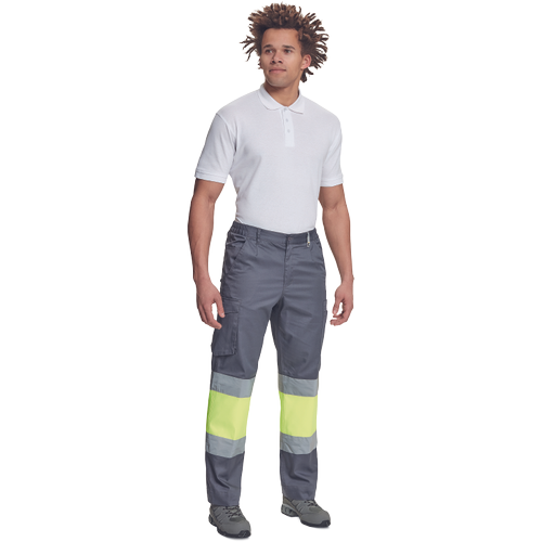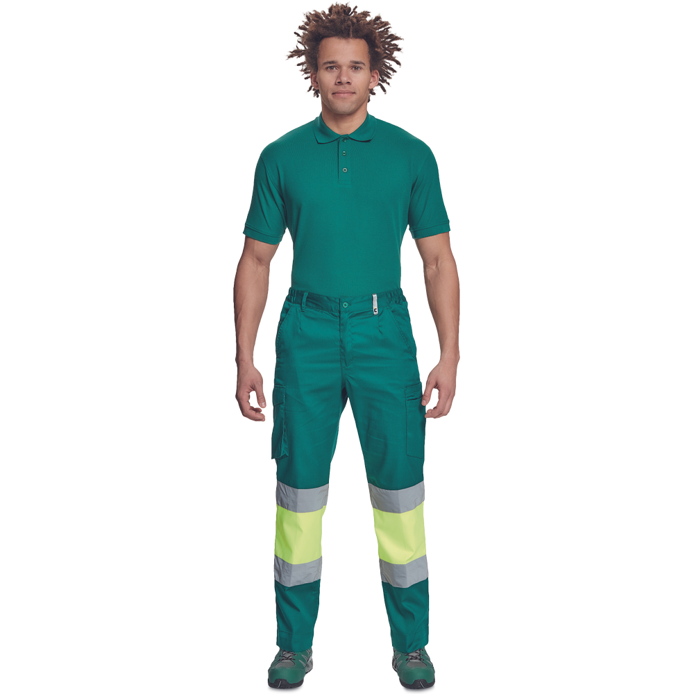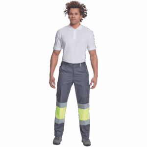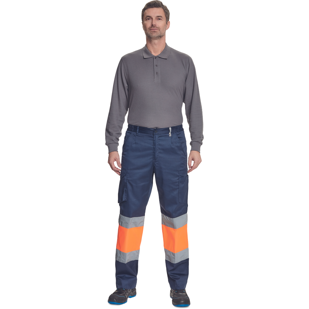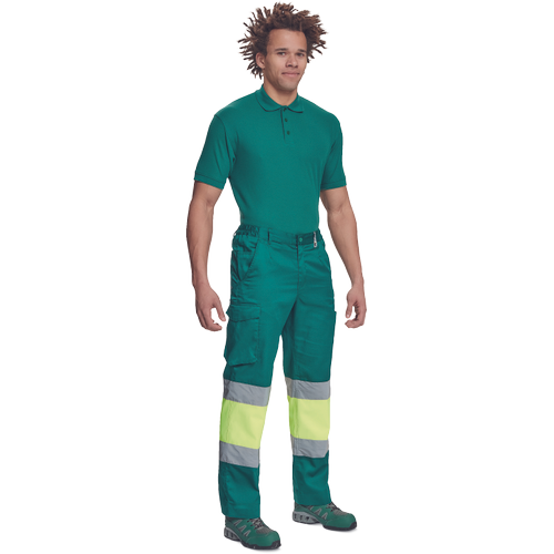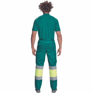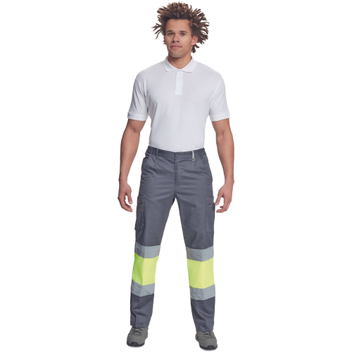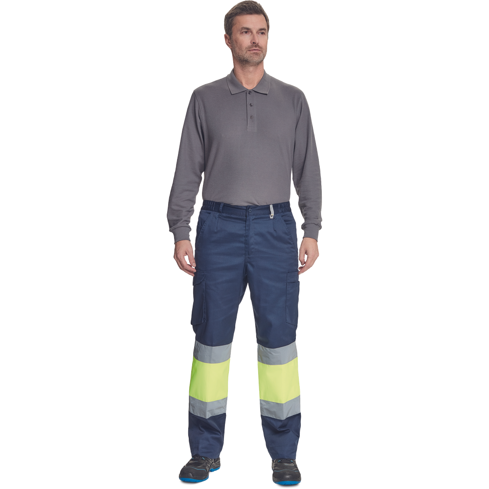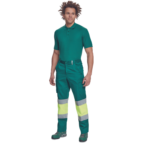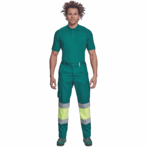 – lahke moške delovne hlače v kombinaciji z delom HI-VIS in odsevnimi črtami – elastičen pas – 2 stranska žepa – 1 žep za kovance – 2 žepa na stegnih – 2 zadnja žepa – podaljšana dolžina nog