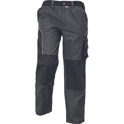 – moške delovne hlače s pasom, večnamenski stranski žepi na nogah – veliki žepi z zavihkom z velcro zapiranjem na zadnjem delu – kolenski žepi za vnos kolenskih blazinic – trojni šivi in trakovi za ojačitev – nastavljiva dolžina nog – okrasne cevi iz odsevnega materiala – prilagodljiv pas