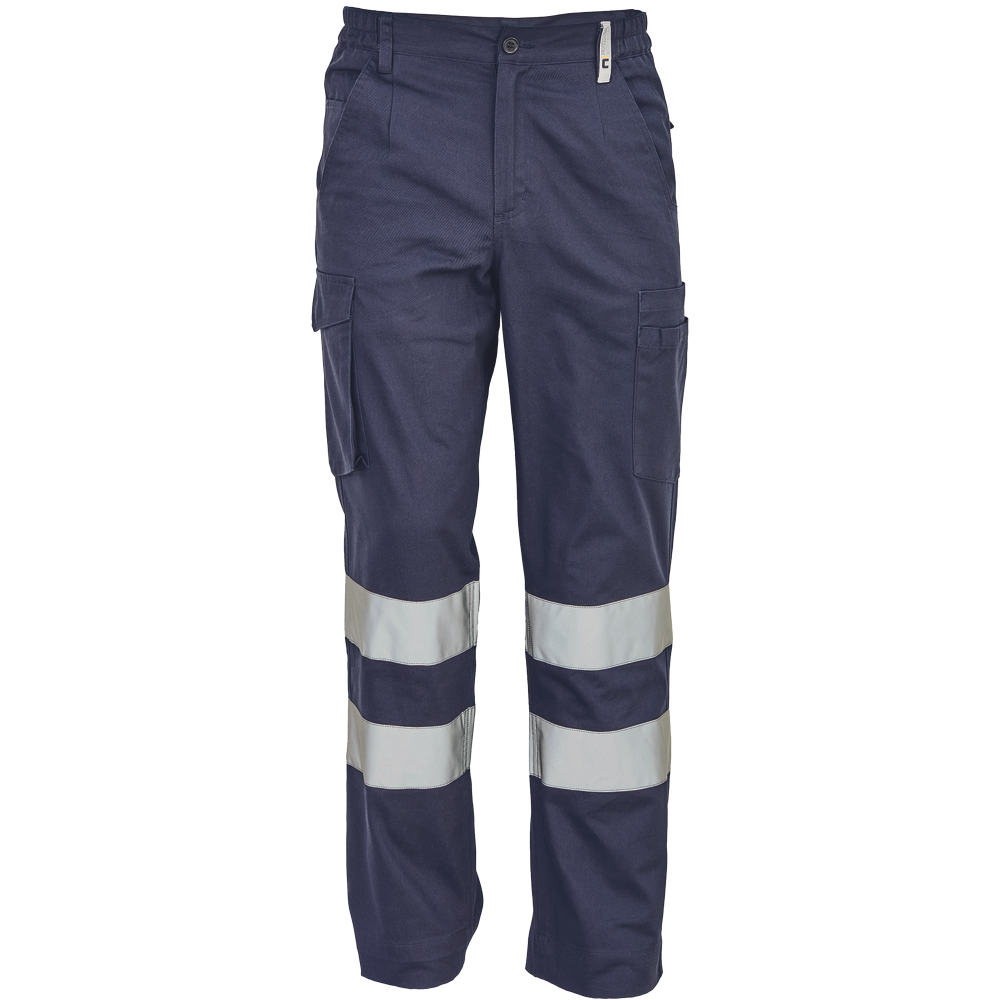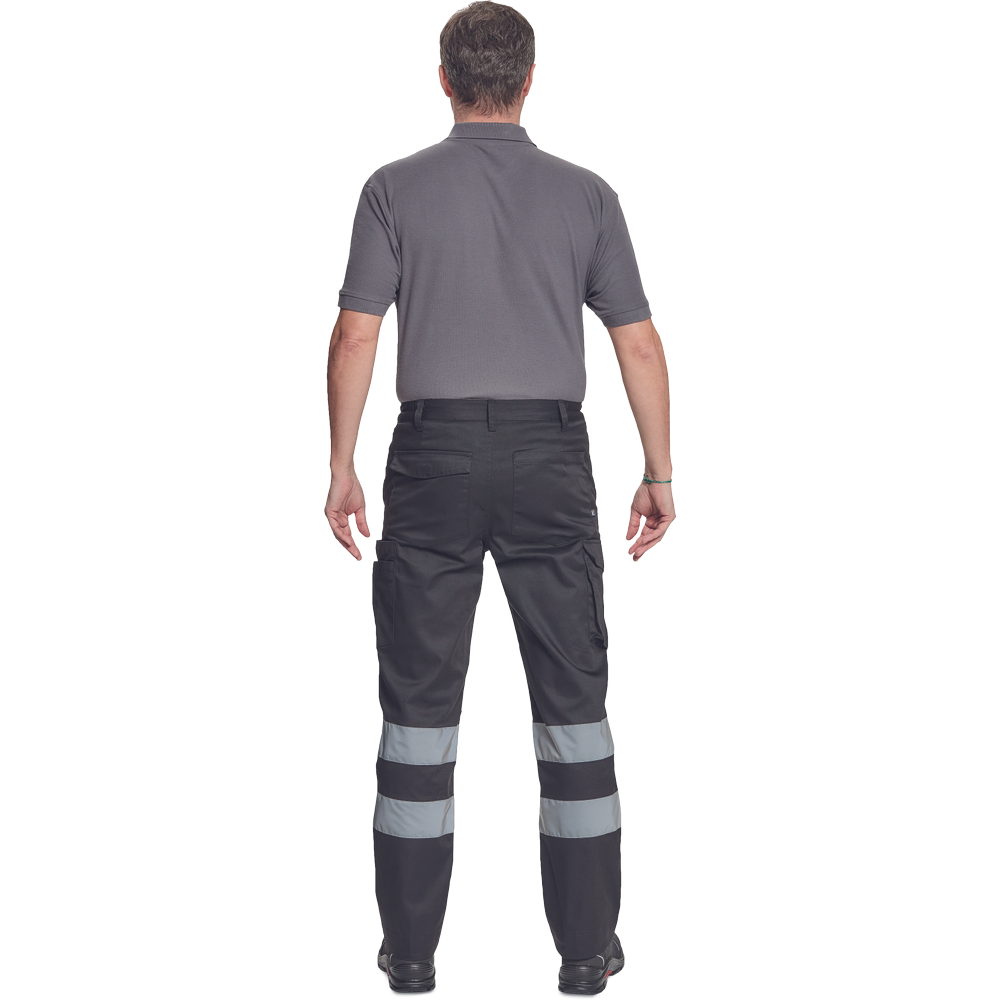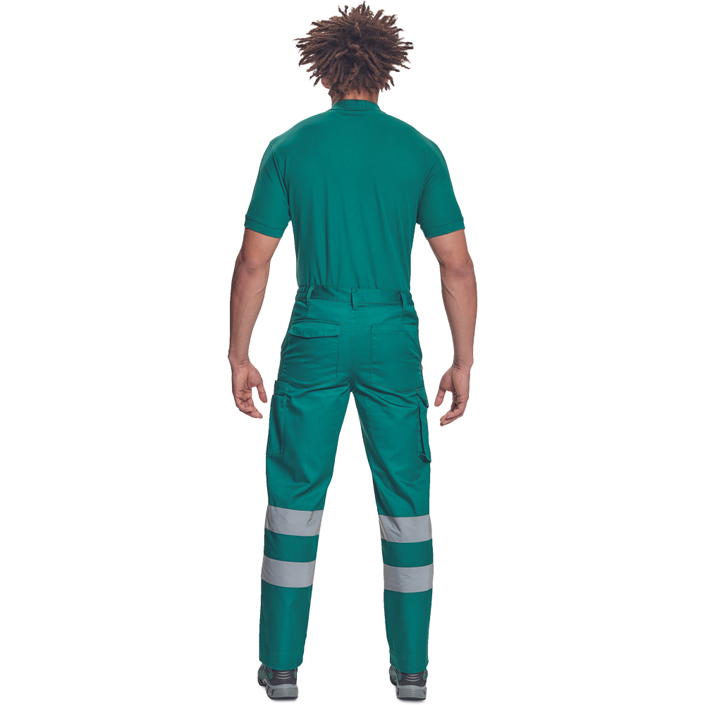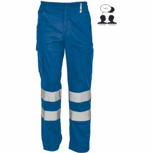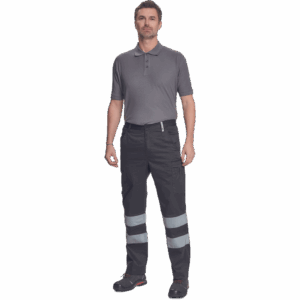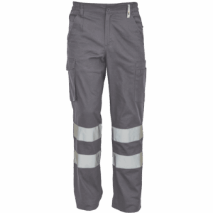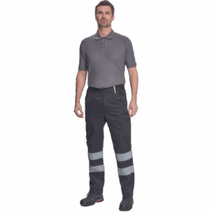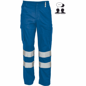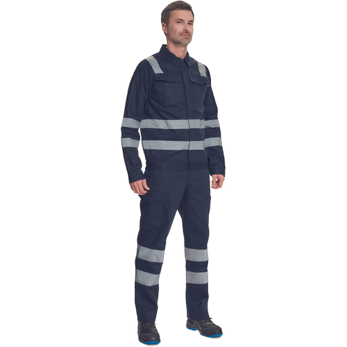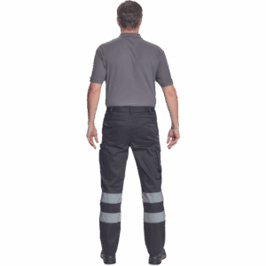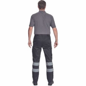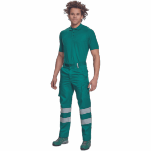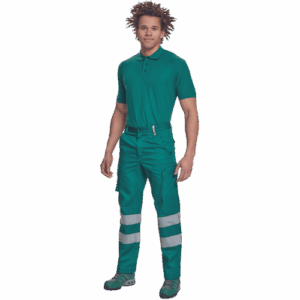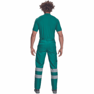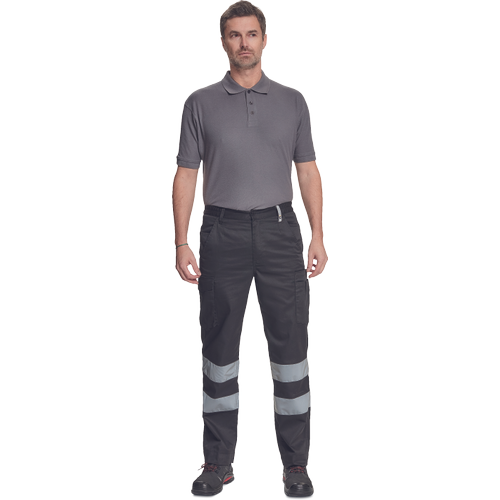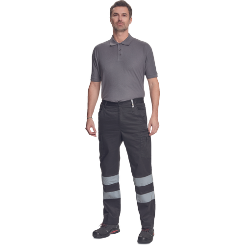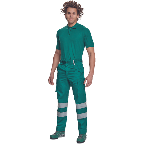 – lahke moške delovne hlače z odsevnimi črtami – 2 stranska žepa – 1 žep za kovance – 2 žepa na stegnih – 2 zadnja žepa – elastičen pas na straneh – podaljšana dolžina nog