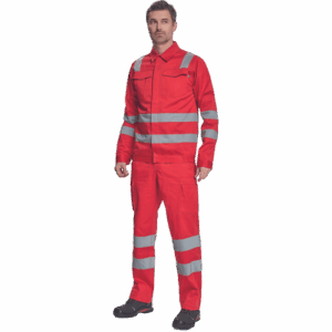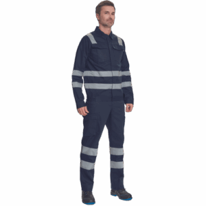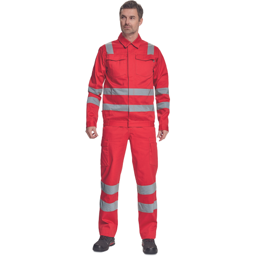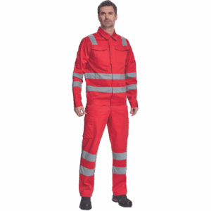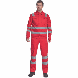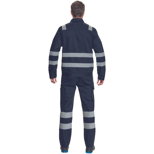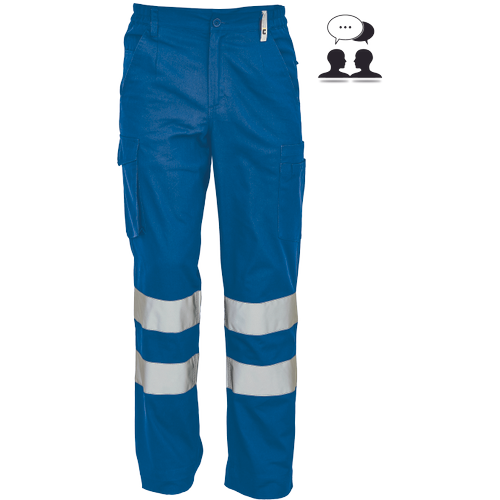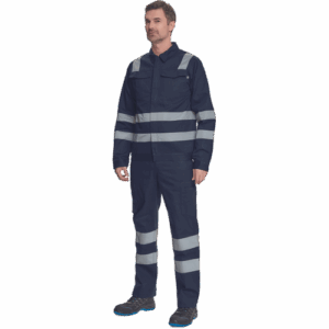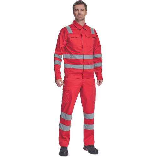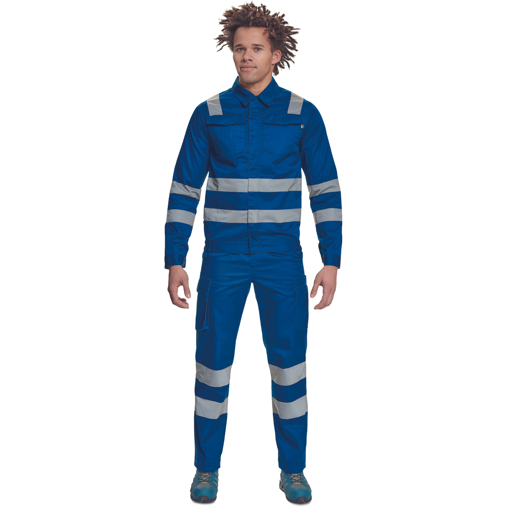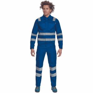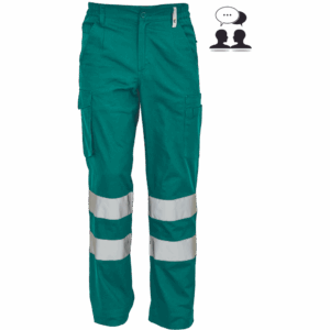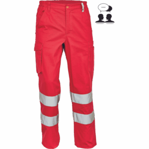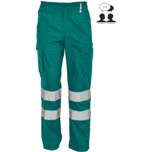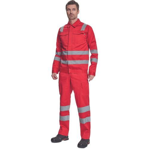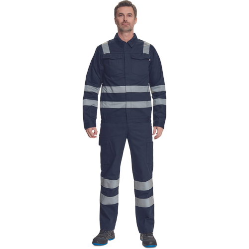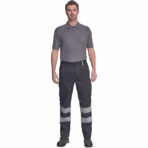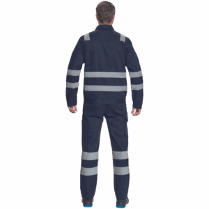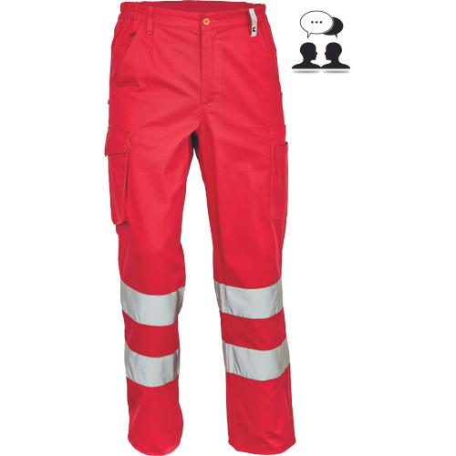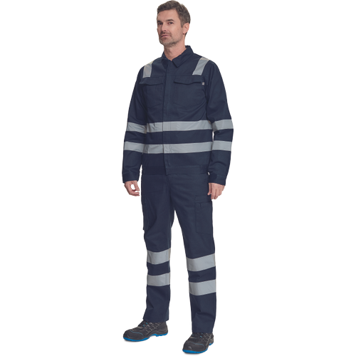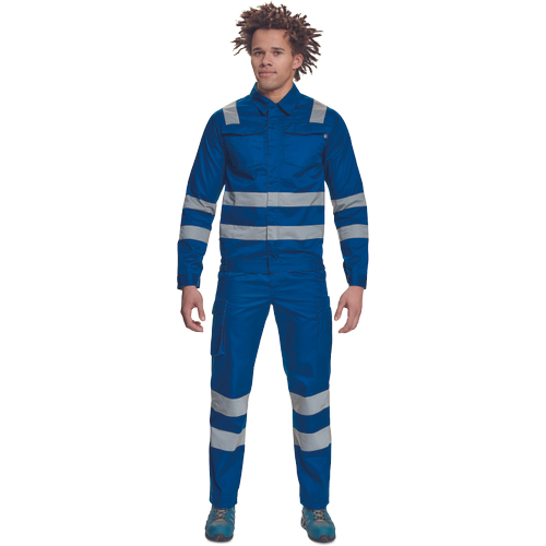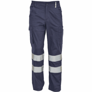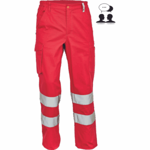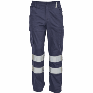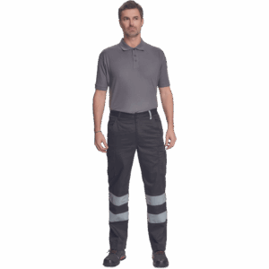 – lahke moške delovne hlače z odsevnimi črtami – 2 stranska žepa – 1 žep za kovance – 2 žepa na stegnih – 2 zadnja žepa – elastičen pas na straneh – podaljšana dolžina nog