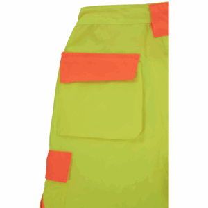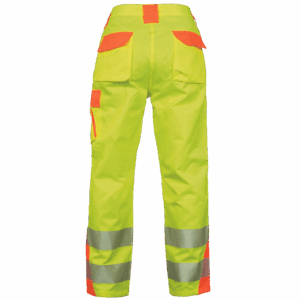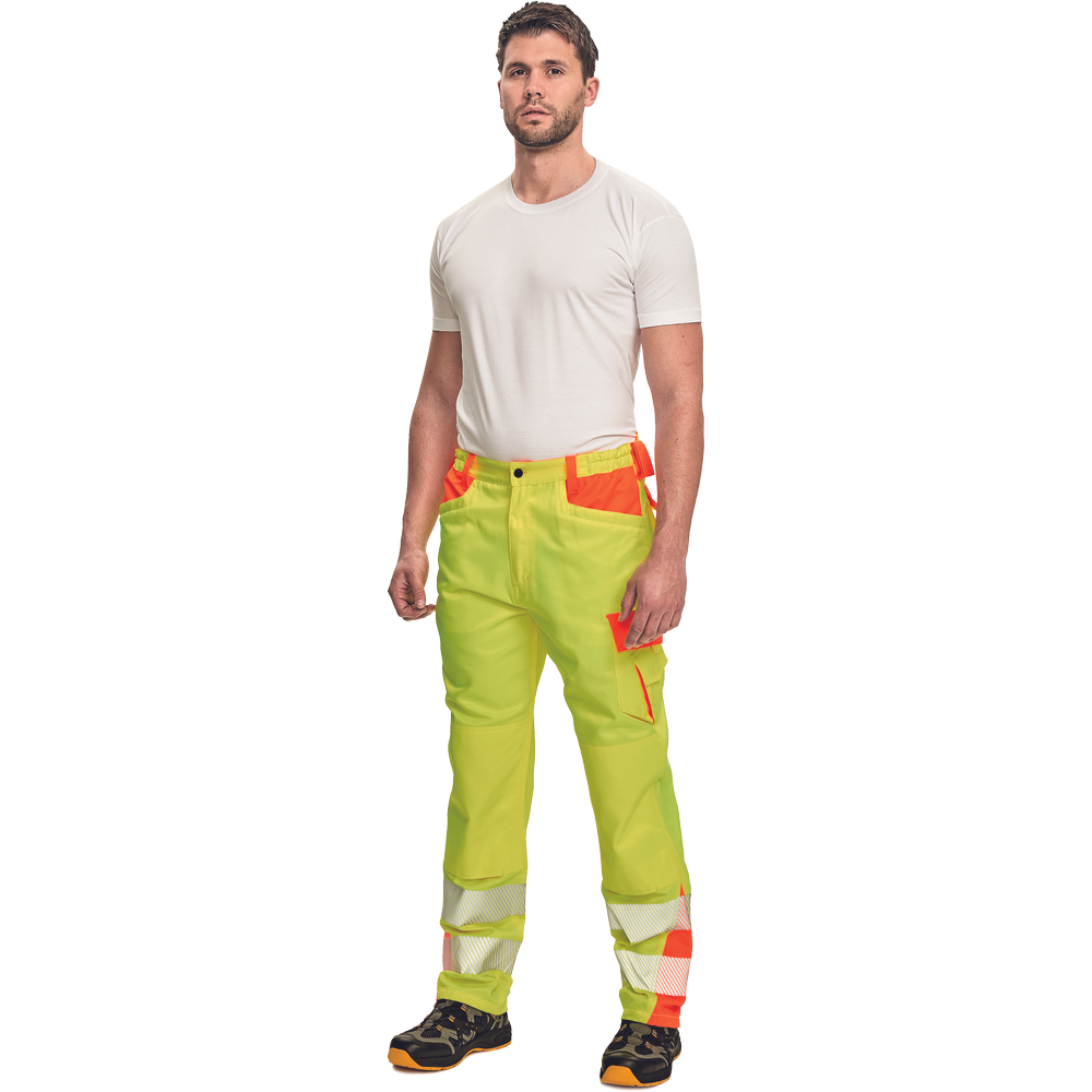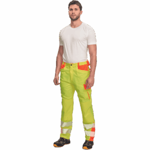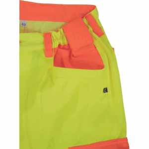 – visokokakovostne moške delovne hlače v kombinaciji dveh barv HI-VIS – segmentno potiskane odsevne črte okoli spodnjega dela nog – 2 velika sprednja žepa – 1 dvojni večnamenski žep na levi strani noge – 2 zadnja žepa z zavihkom – kolenska žepa za vstavljanje kolenskih blazinic – elastičen pas