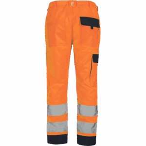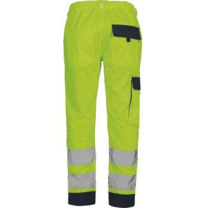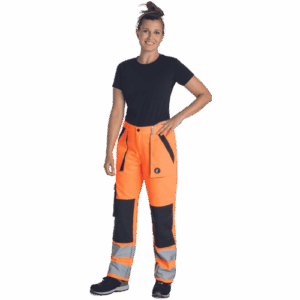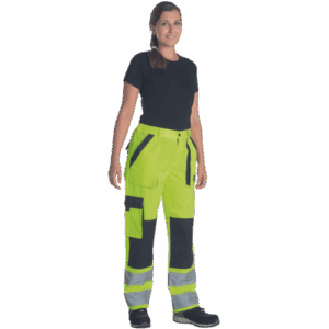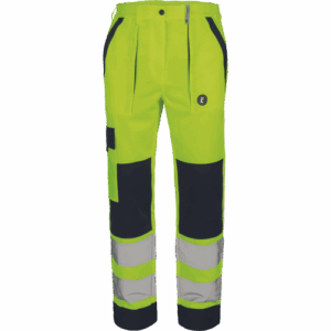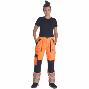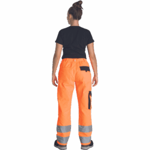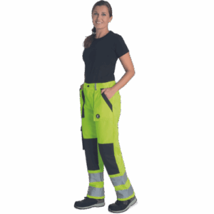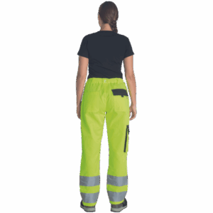 – ženske delovne hlače HI-VIS z elastičnim pasom – 2 stranska žepa – 1 žep na stegnu – 2 zadnja žepa z velcro zapiranjem – 2 všita 7,5 cm široka odsevna trakova na vsaki spodnji nogi – ojačitev kolena – nastavljiva dolžina noge