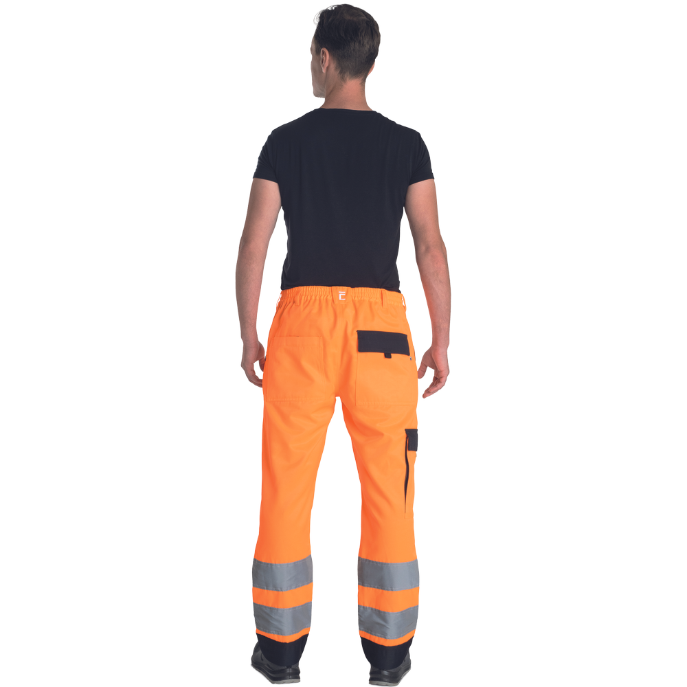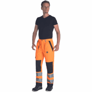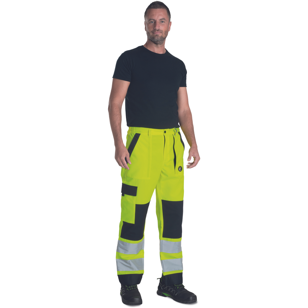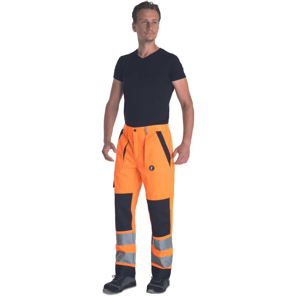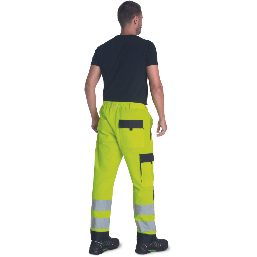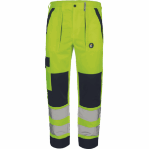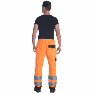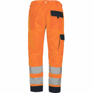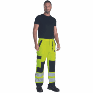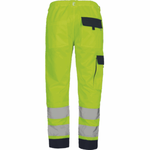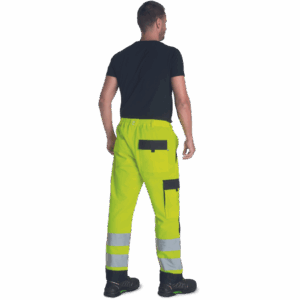 – moške delovne hlače HI-VIS z elastičnim pasom – 2 stranska žepa – 1 žep na stegnu – 2 zadnja žepa z velcro zapiranjem – 2 všita 7,5 cm široka odsevna trakova na vsaki spodnji nogi – ojačitev kolena – nastavljiva dolžina noge