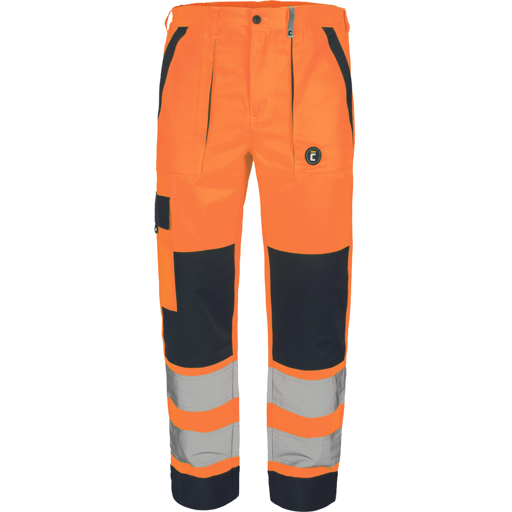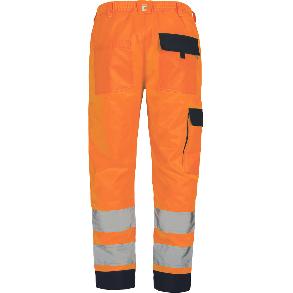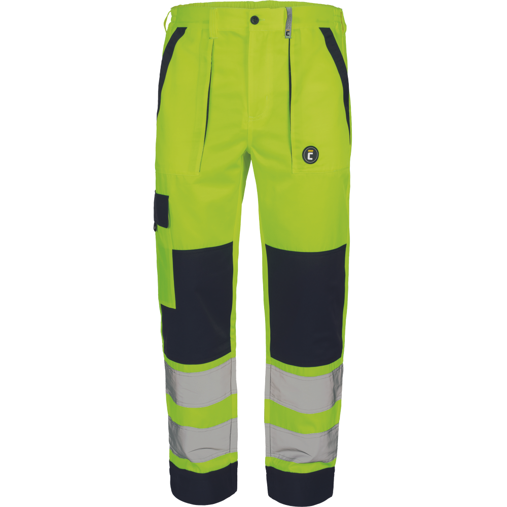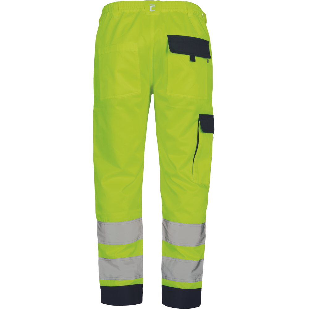 – moške delovne hlače HI-VIS z elastičnim pasom – 2 stranska žepa – 1 žep na stegnu – 2 zadnja žepa z velcro zapiranjem – 2 všita 7,5 cm široka odsevna trakova na vsaki spodnji nogi – ojačitev kolena – nastavljiva dolžina noge