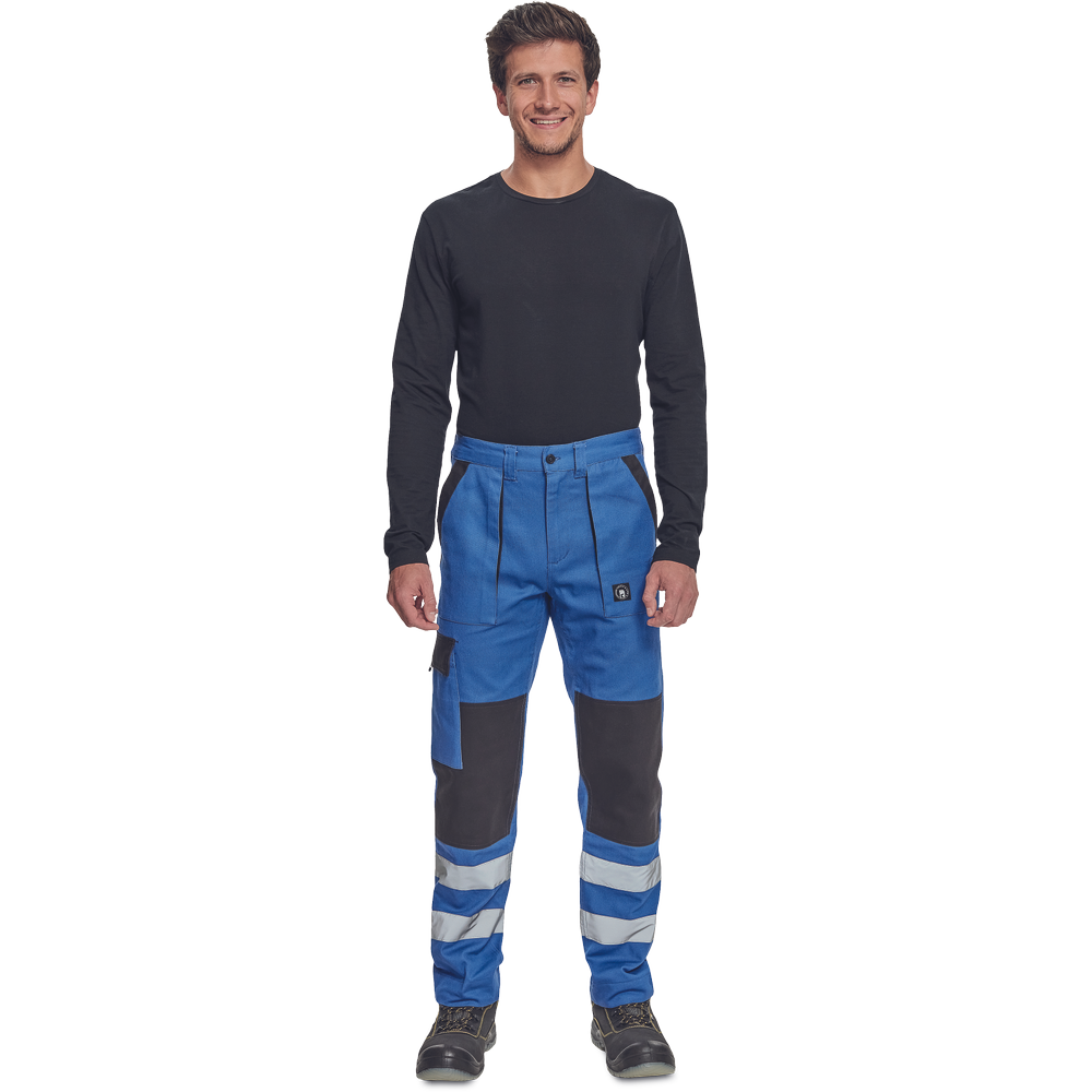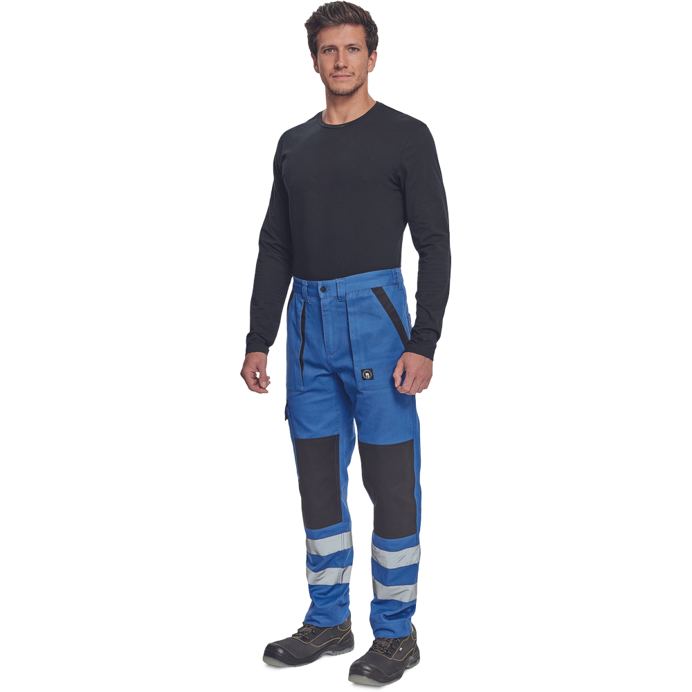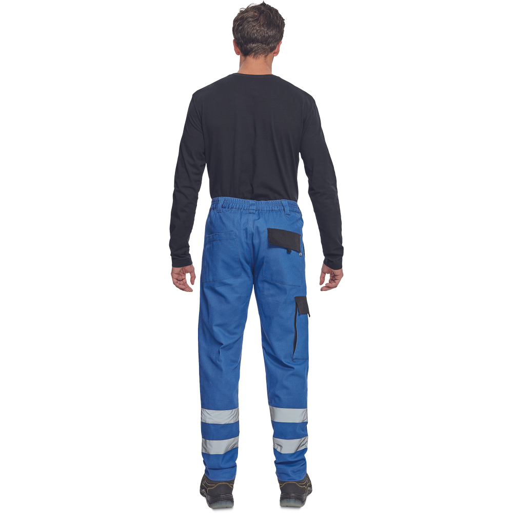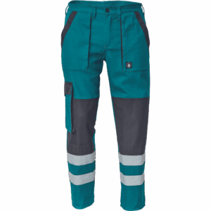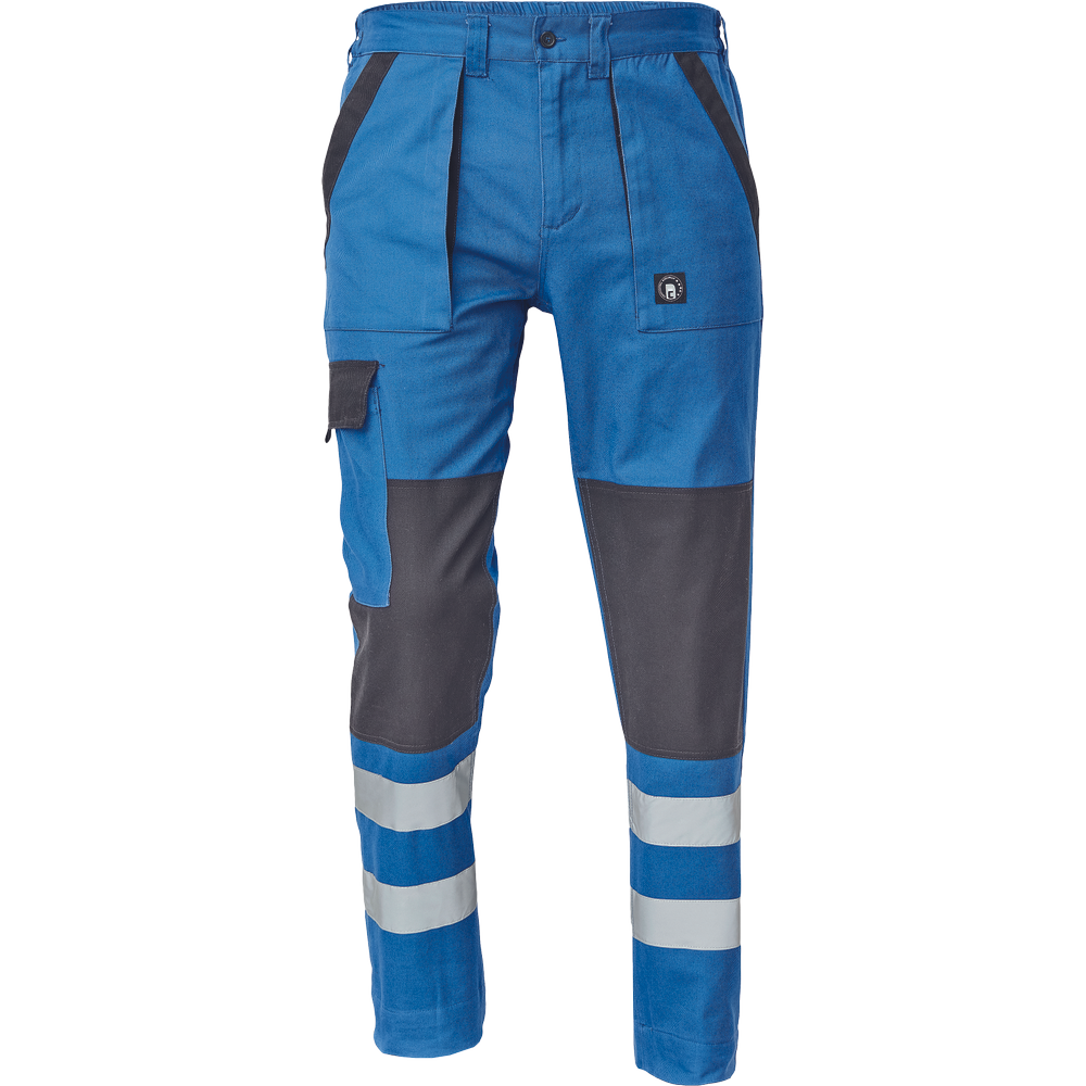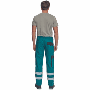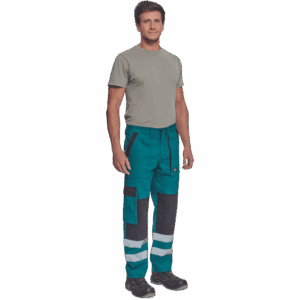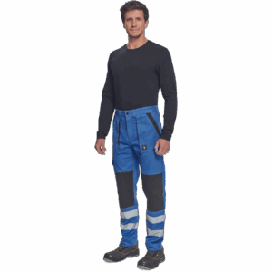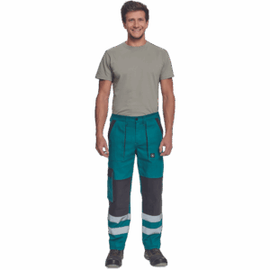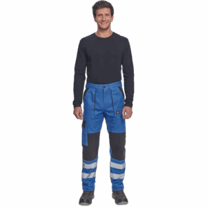 – moške delovne hlače z elastičnim pasom – 2 stranska žepa – 1 žep na stegnu – 2 zadnja žepa – odsevne črte na spodnjih delih nog – ojačana kolena – podaljšana dolžina nog