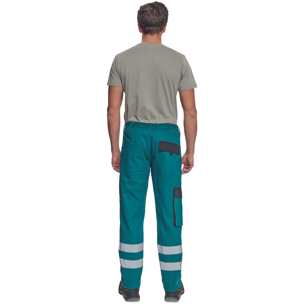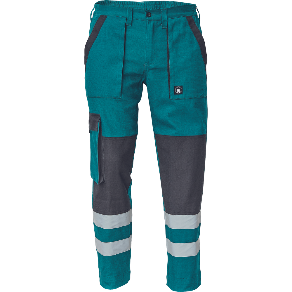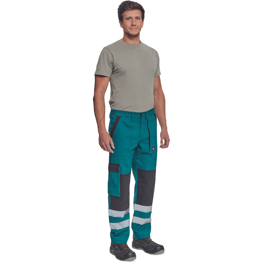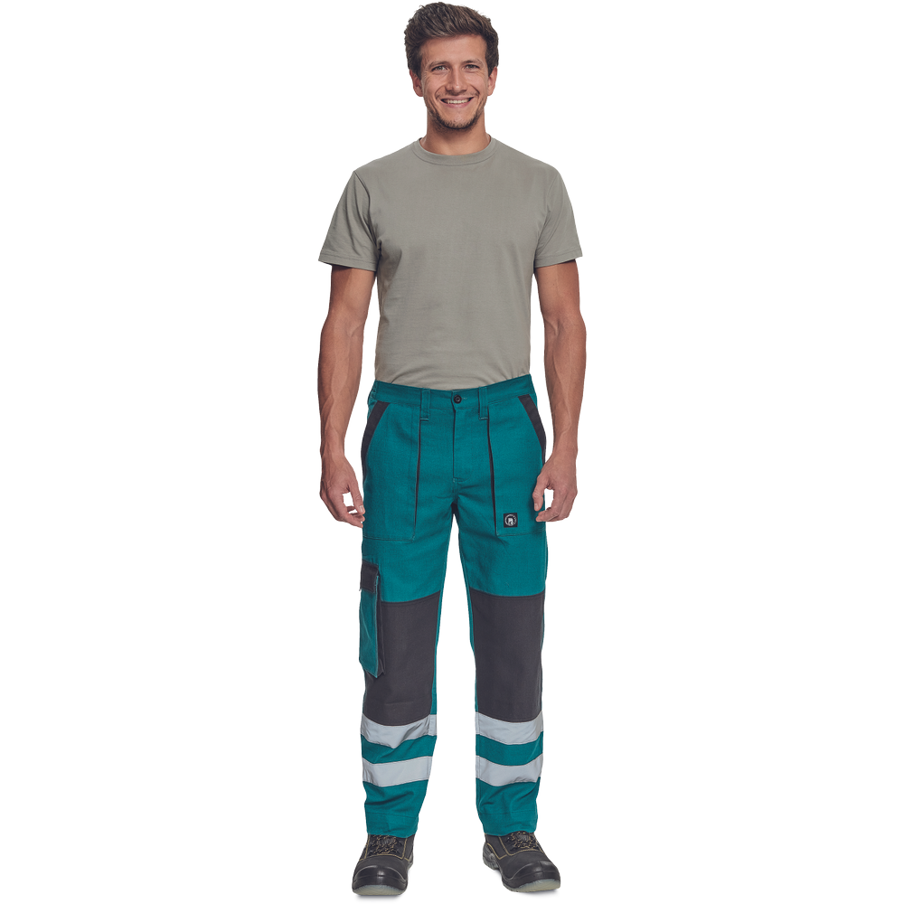 – moške delovne hlače z elastičnim pasom – 2 stranska žepa – 1 žep na stegnu – 2 zadnja žepa – odsevne črte na spodnjih delih nog – ojačana kolena – podaljšana dolžina nog