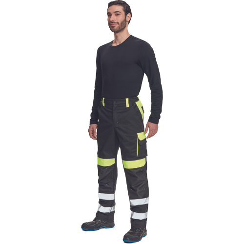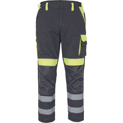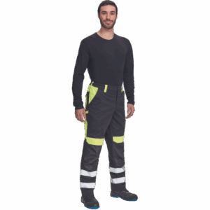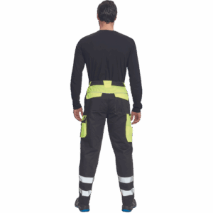 – moške odsevne delovne hlače z elastičnim pasom – 2 stranska žepa – 1 dvojni žep na levem stegnu – 2 zadnja žepa – 2 majhna zadnja žepa na desnem stegnu – dve 5 cm všiti odsevni črti na spodnjih delih nog – odsevne obrobe – ojačeni deli kolen Oxford 600D z žepi z zavihki za vstavljanje kolenskih vložkov – podaljšana dolžina nog