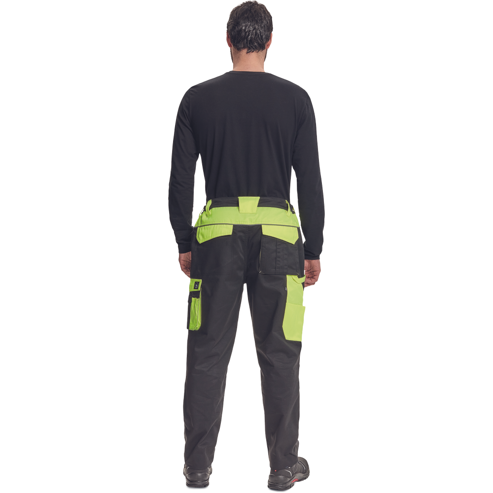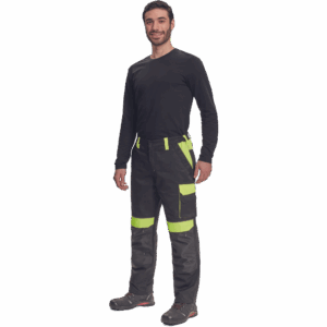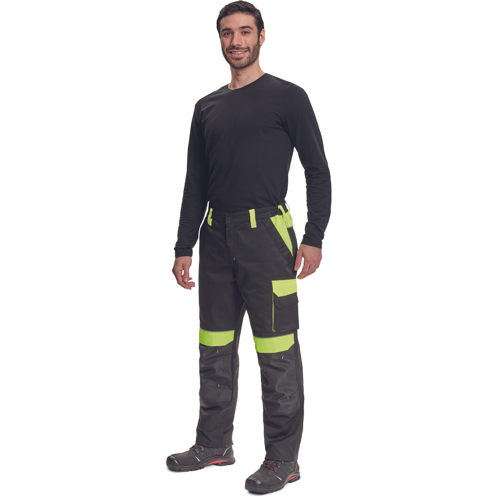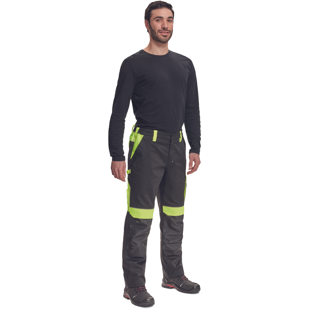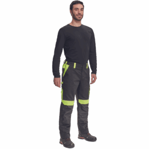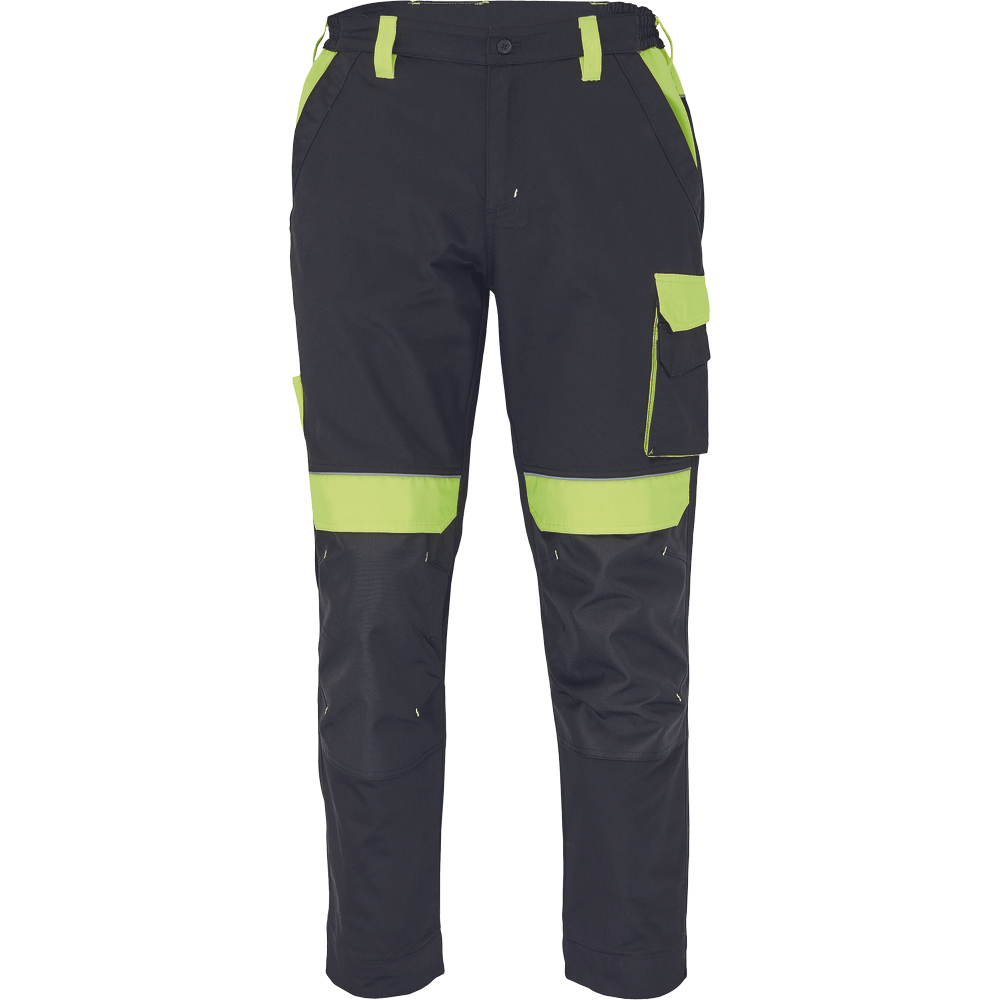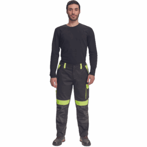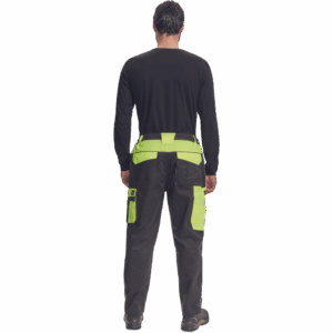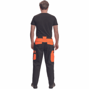 – moške delovne hlače z elastičnim pasom – 2 stranska žepa – 1 dvojni žep na levem stegnu – 2 zadnja žepa – 2 majhna zadnja žepa na desnem stegnu – odsevne obrobe – ojačeni deli kolen Oxford 600D z žepi s poklopci za vstavljanje kolenskih blazinic – podaljšana dolžina nog