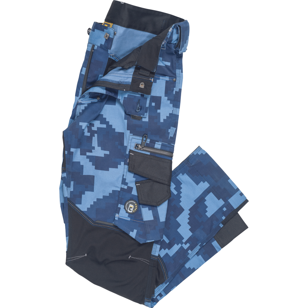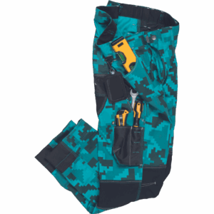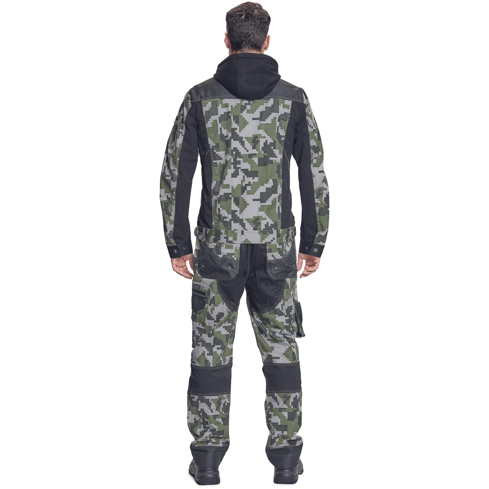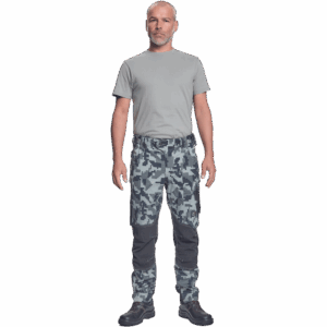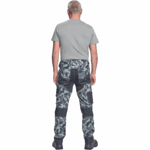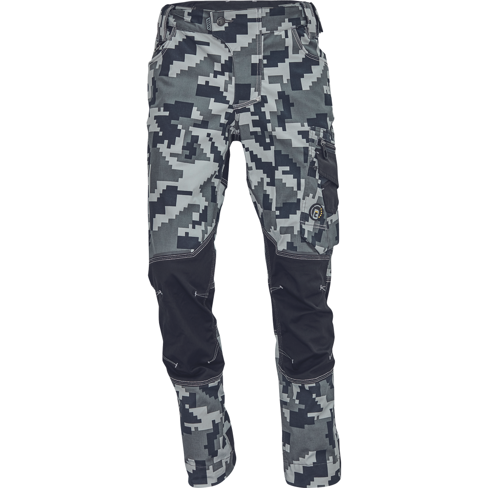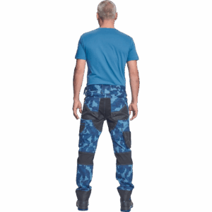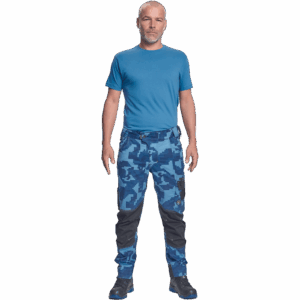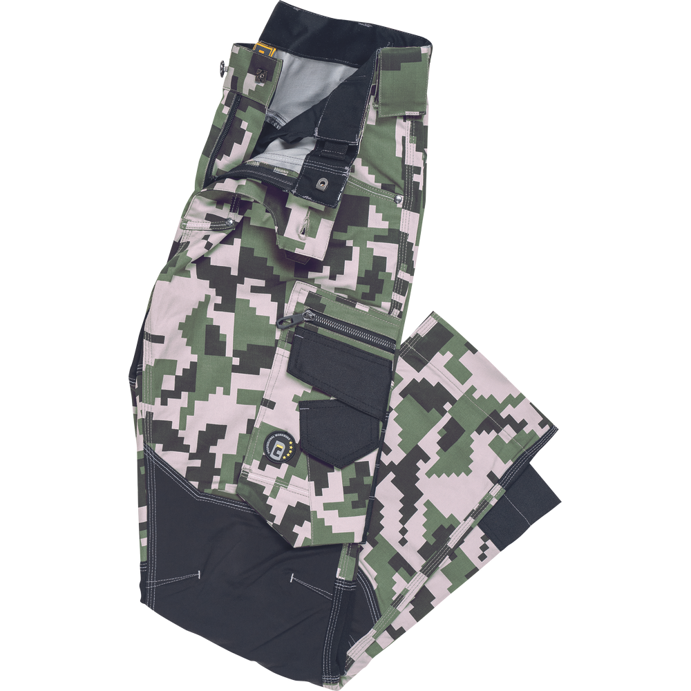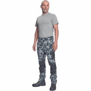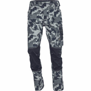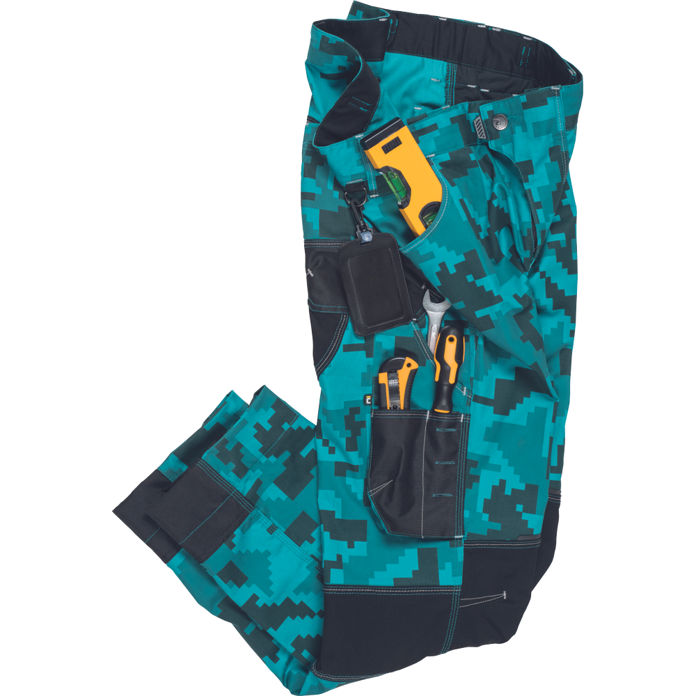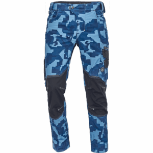 – moške delovne hlače z elastičnim pasom – elastičen inovativen material TRIFIBETEX® s trendovskim kamuflažnim potiskom – trpežen trojni šiv na nogah in mednožju – ojačitve CORDURA® na kolenih – prostorni večnamenski sprednji žepi s trakovi za orodje – odsevne podrobnosti ton v tonu – podaljšana dolžina nog