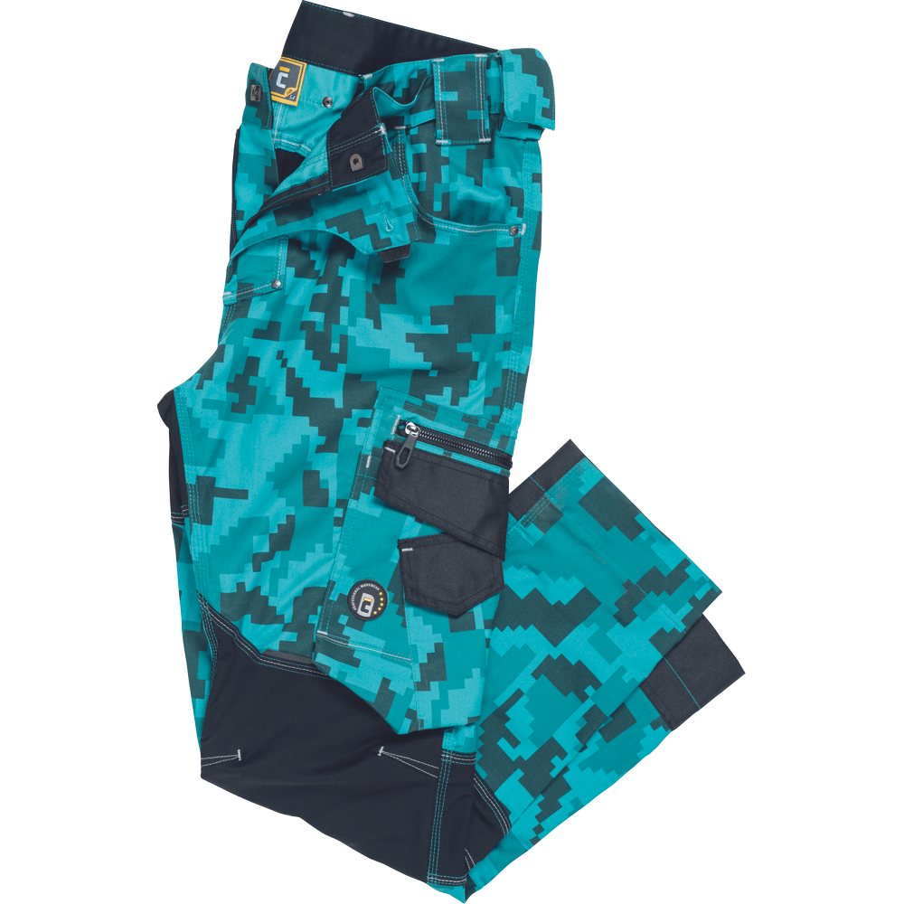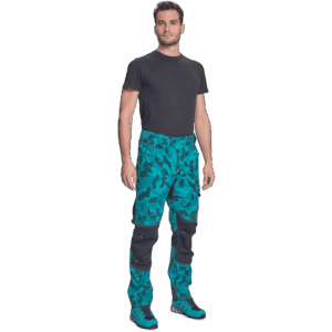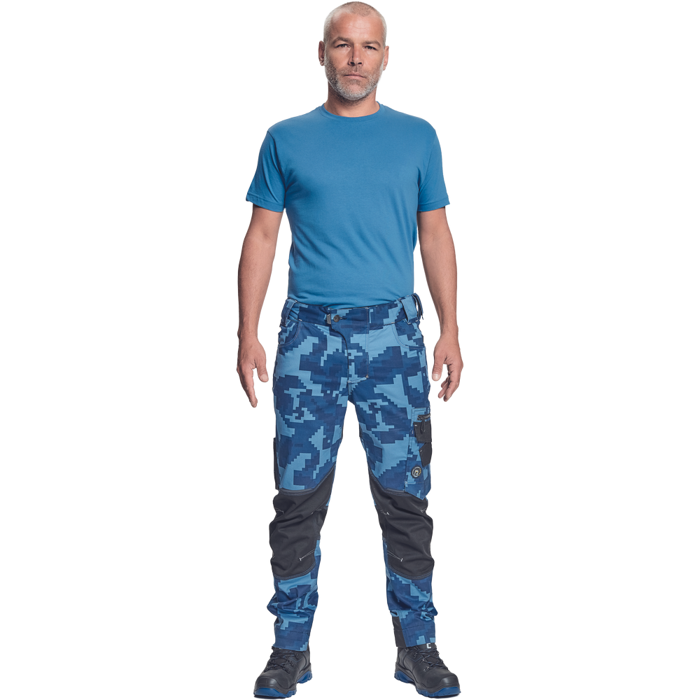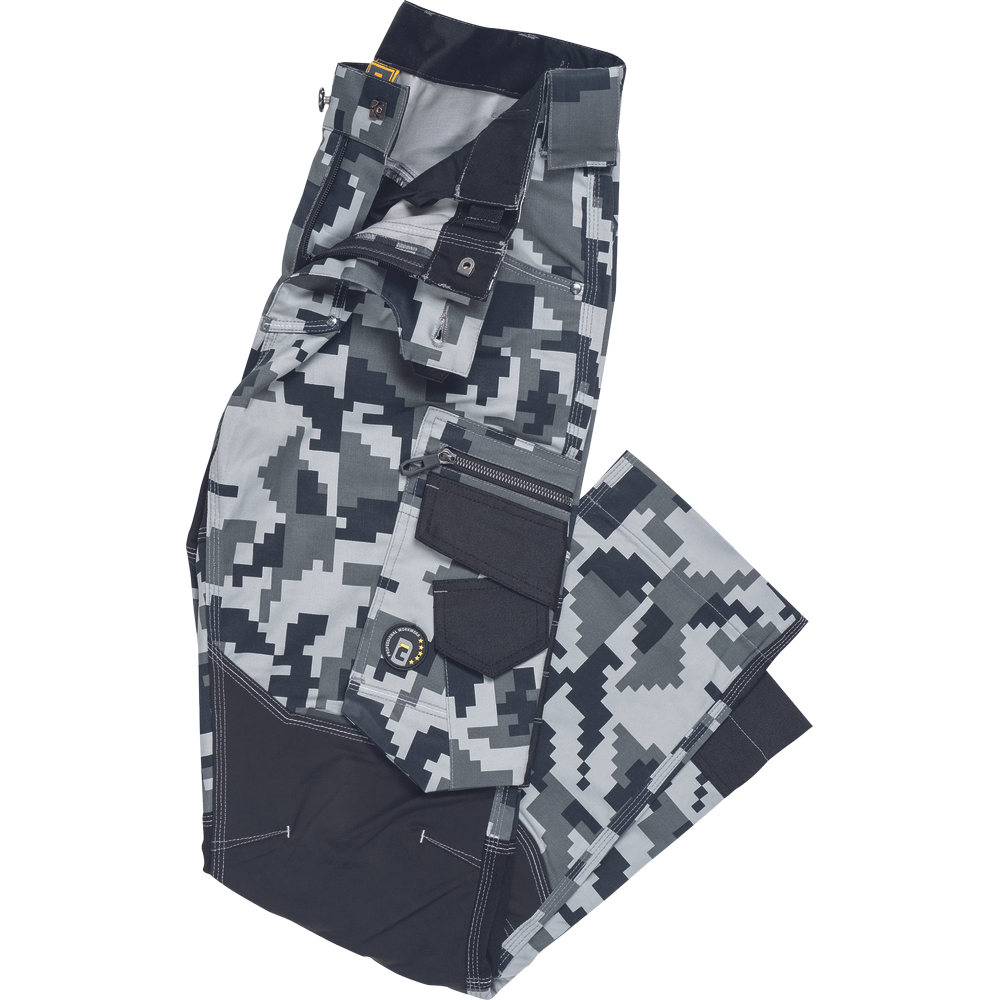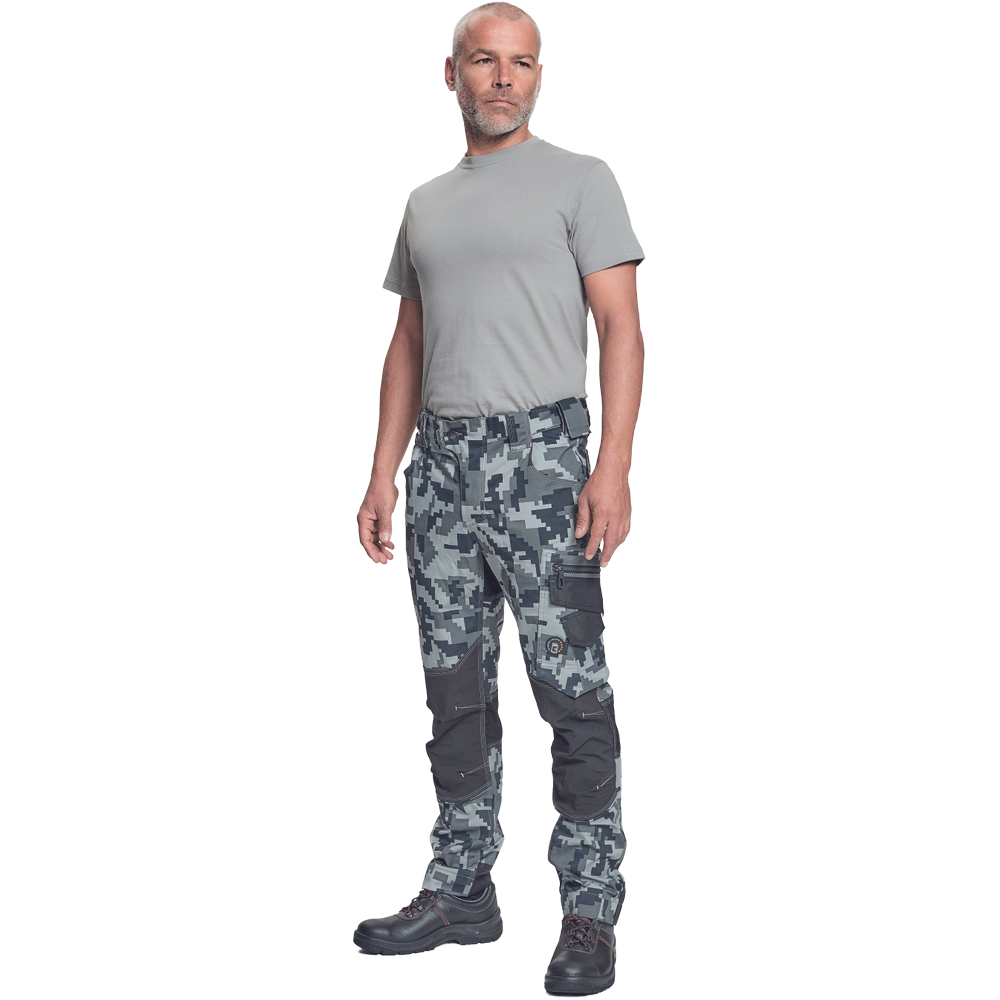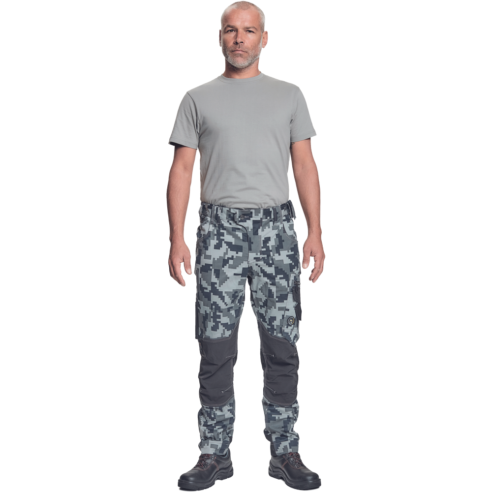 – moške delovne hlače z elastičnim pasom – elastičen inovativen material TRIFIBETEX® s trendovskim kamuflažnim potiskom – trpežen trojni šiv na nogah in mednožju – ojačitve CORDURA® na kolenih – prostorni večnamenski sprednji žepi s trakovi za orodje – odsevne podrobnosti ton v tonu – podaljšana dolžina nog