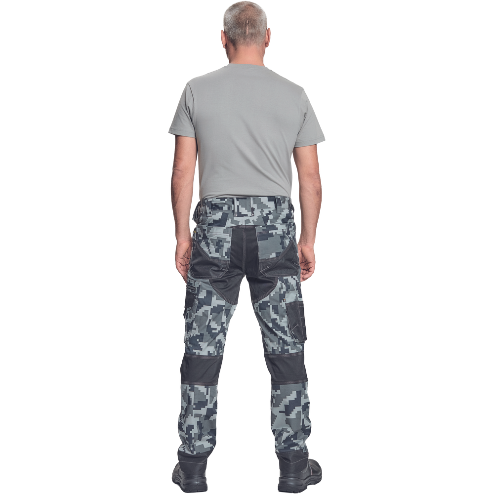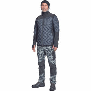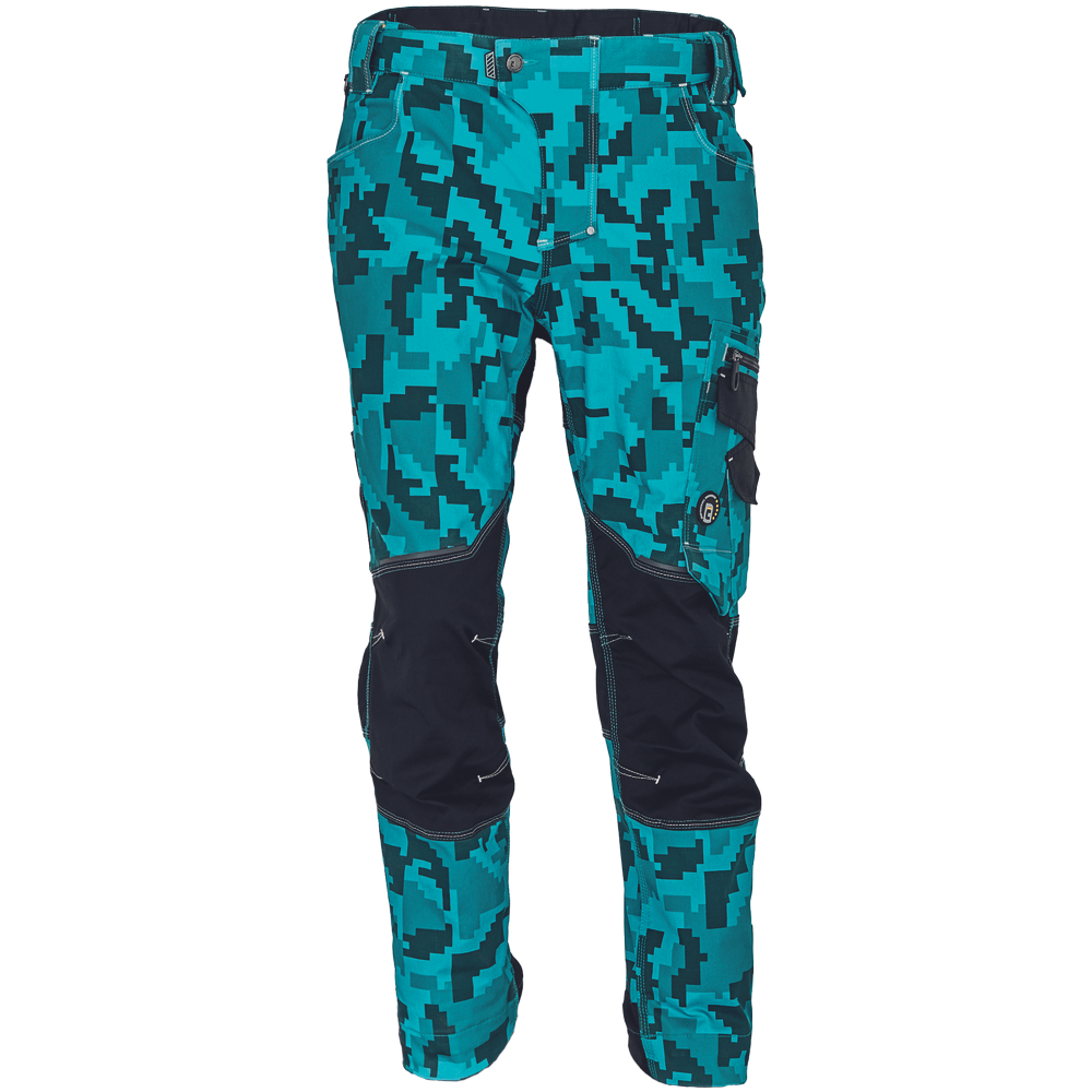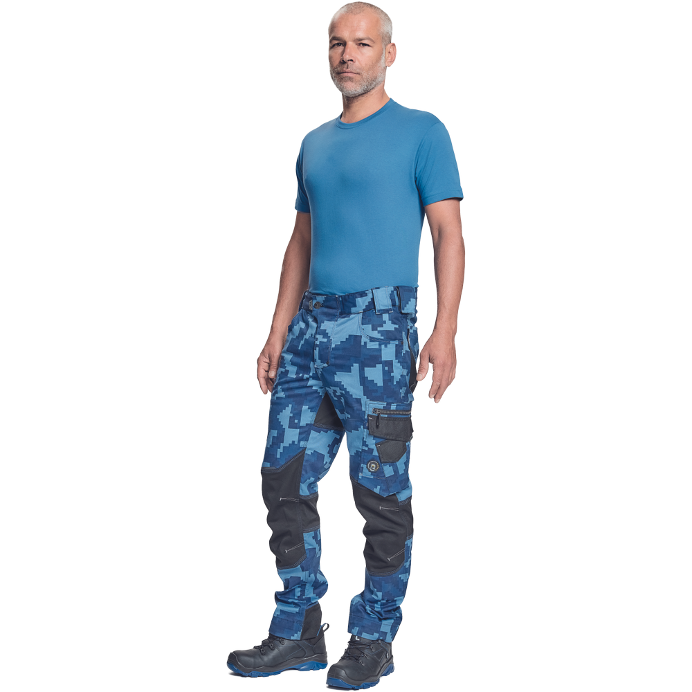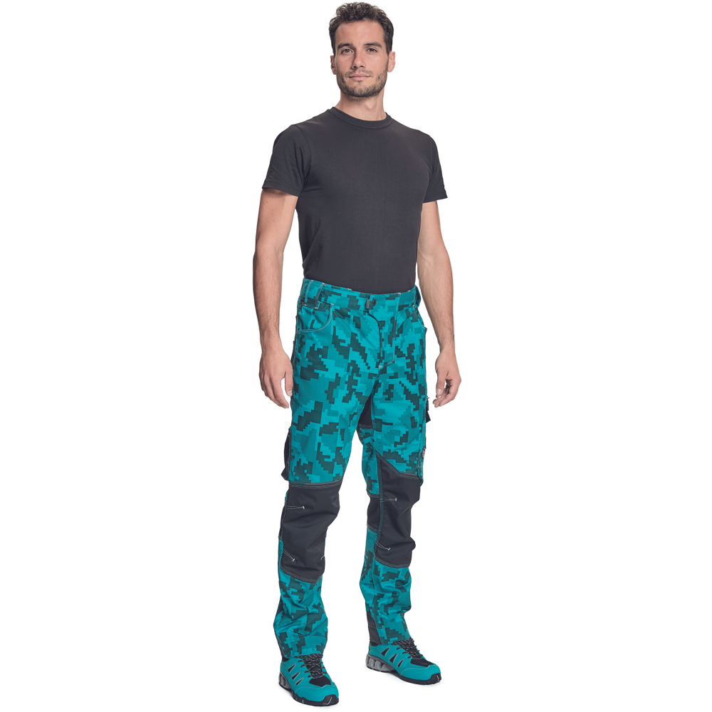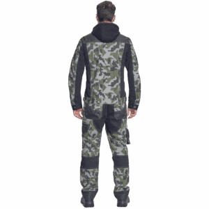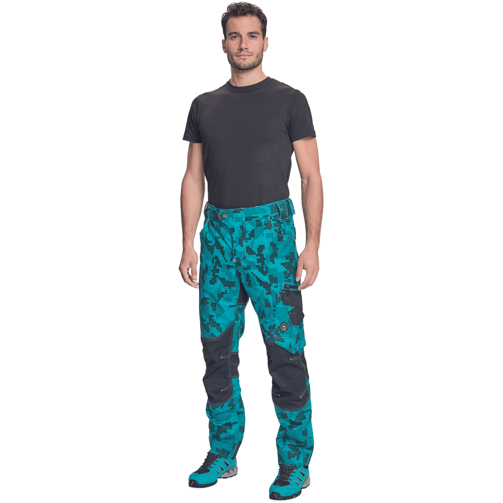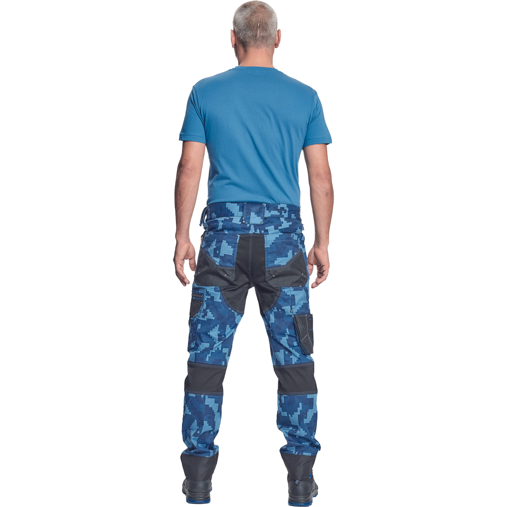 – moške delovne hlače z elastičnim pasom – elastičen inovativen material TRIFIBETEX® s trendovskim kamuflažnim potiskom – trpežen trojni šiv na nogah in mednožju – ojačitve CORDURA® na kolenih – prostorni večnamenski sprednji žepi s trakovi za orodje – odsevne podrobnosti ton v tonu – podaljšana dolžina nog