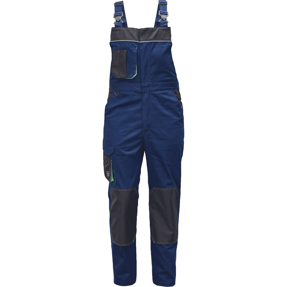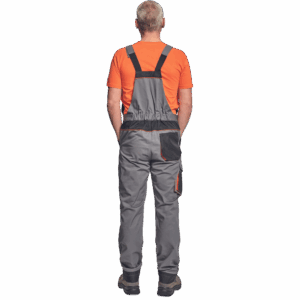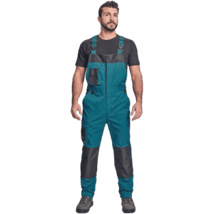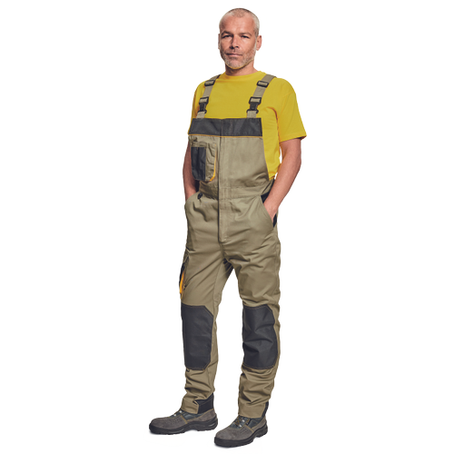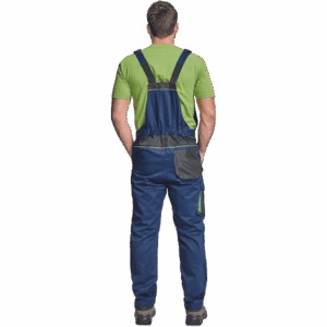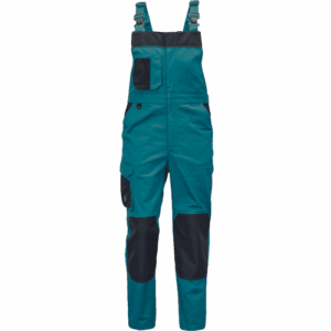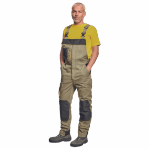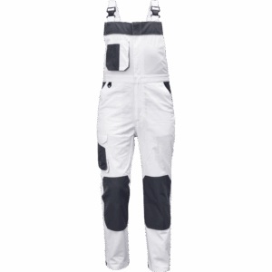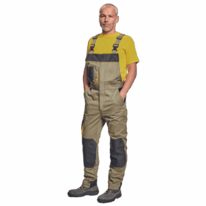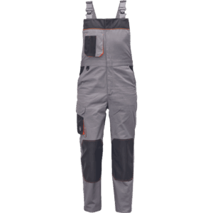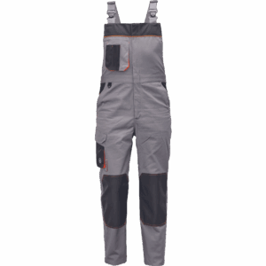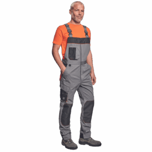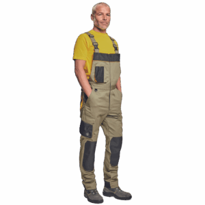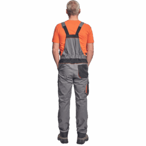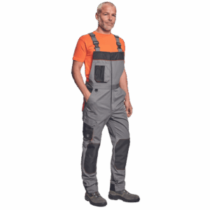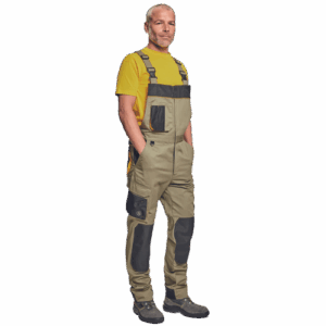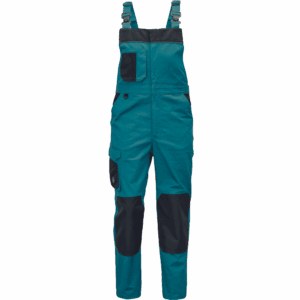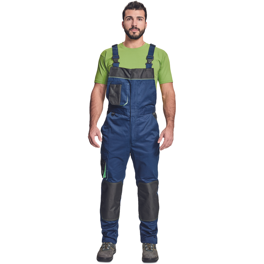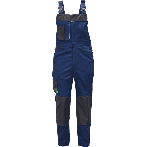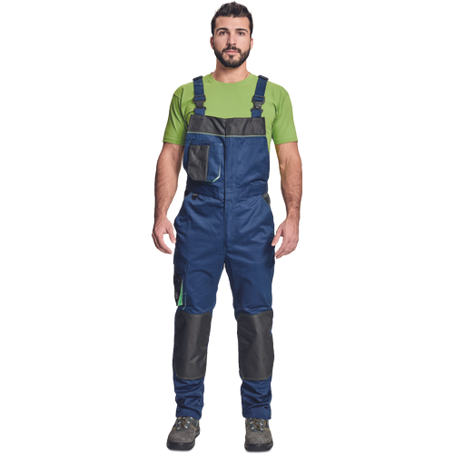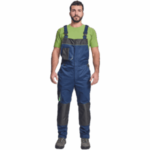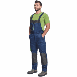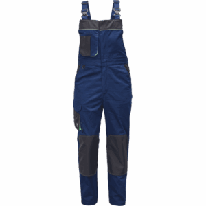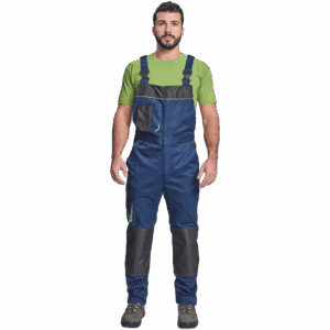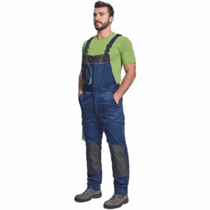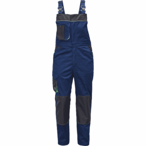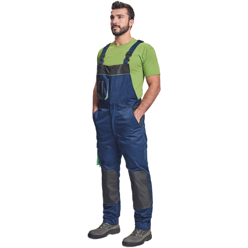 – moške delovne hlače z naprsnikom in elastičnim pasom – ojačani kolenski žepi Oxford 600D z vhodom za kolenske blazinice – 5 večnamenskih žepov – kontrastne obrobe – podaljšana dolžina nogavic