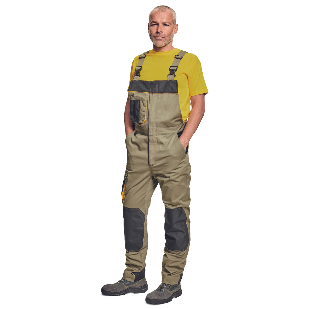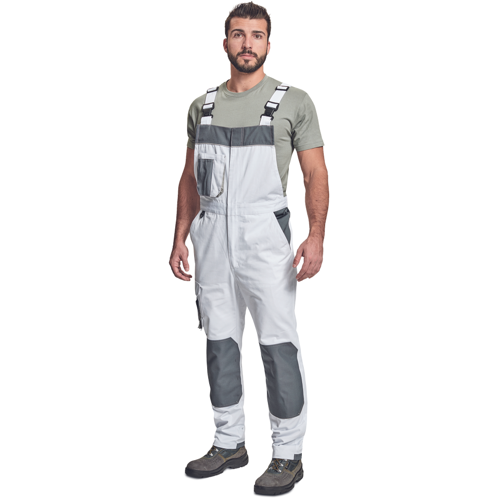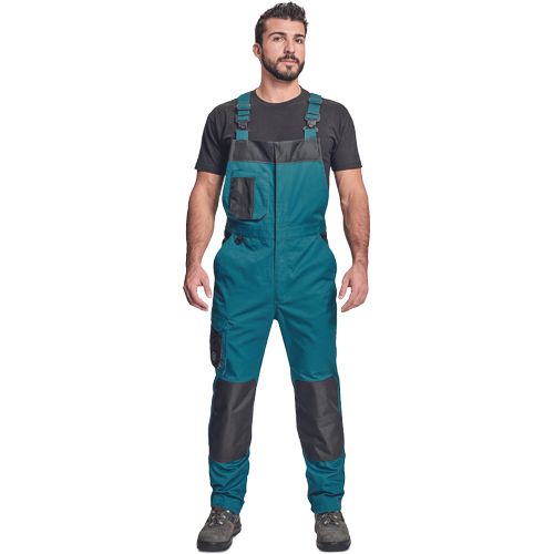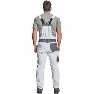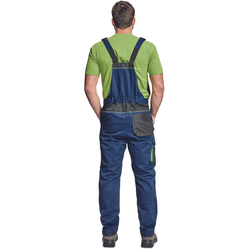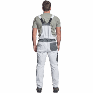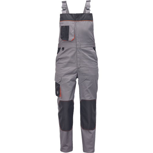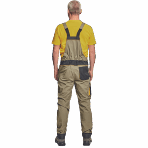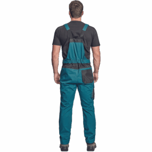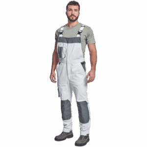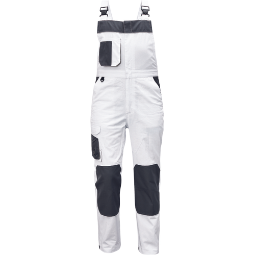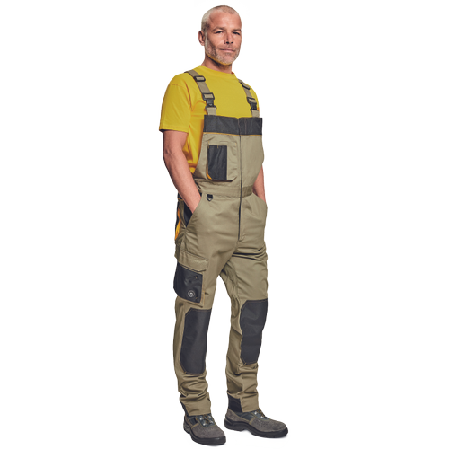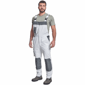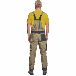 – moške delovne hlače z naprsnikom in elastičnim pasom – ojačani kolenski žepi Oxford 600D z vhodom za kolenske blazinice – 5 večnamenskih žepov – kontrastne obrobe – podaljšana dolžina nogavic